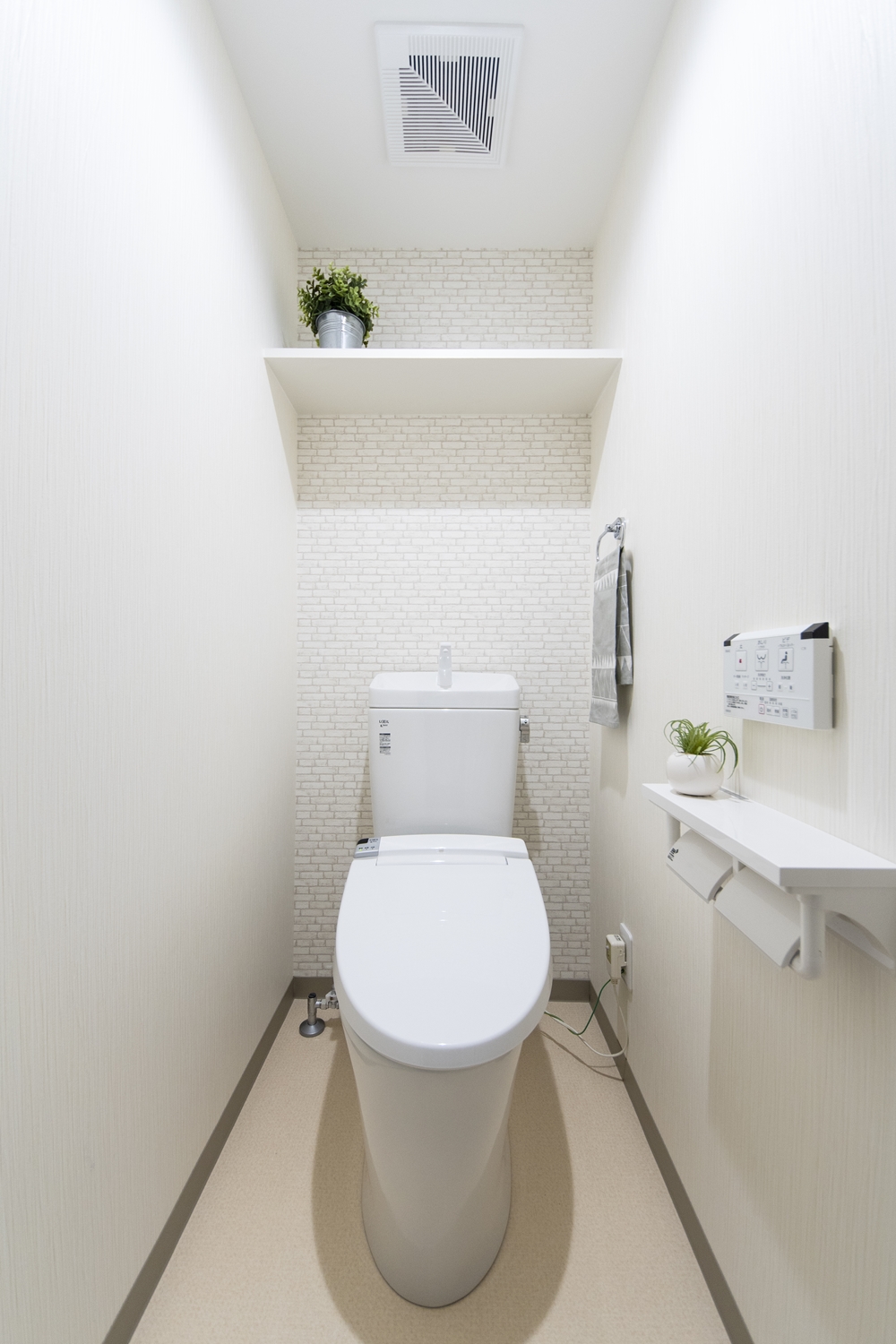 床・クロスの全面張替え、新規便器取付、照明器具・建具の交換を行いました。平面にあしらったレンガ調のアクセントクロスがモダンな空間を演出します。