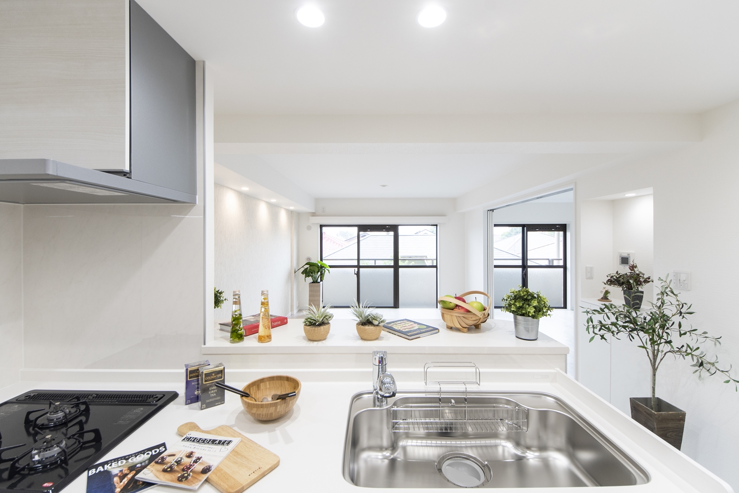 壁付けタイプだったキッチンを、リビングが見渡せる対面式キッチンに大変身!!家事をしながらご家族との会話も弾みます♪