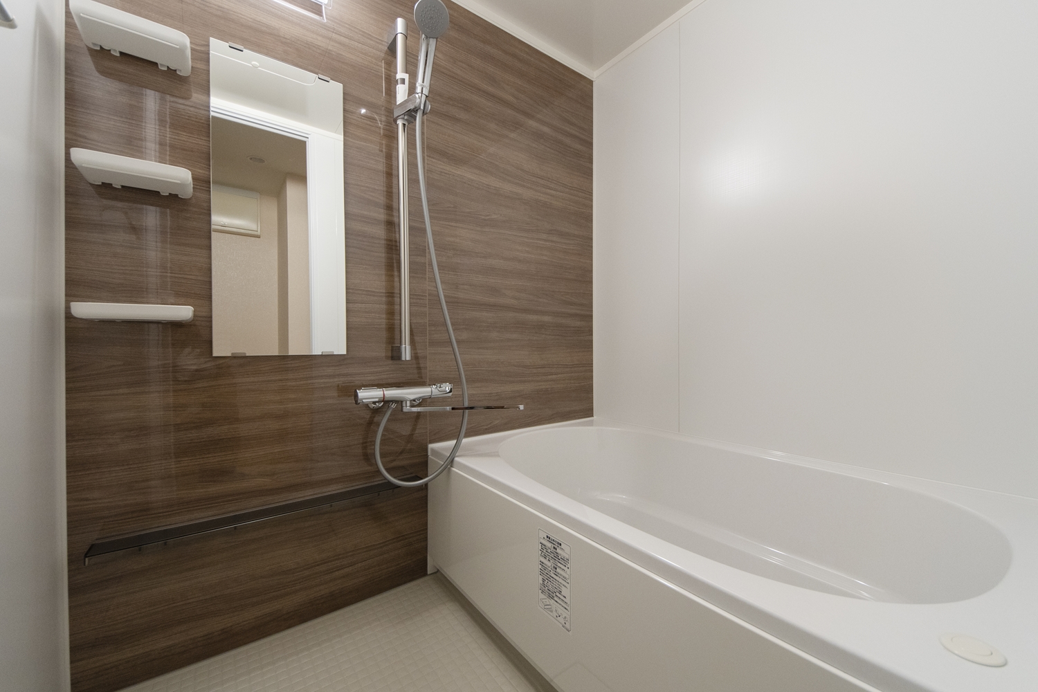 既存のユニットバスを解体・撤去し、新規ユニットバスを設置、浴室乾燥機を取付けました。木目調のアクセントパネルがナチュラルな空間を演出します。