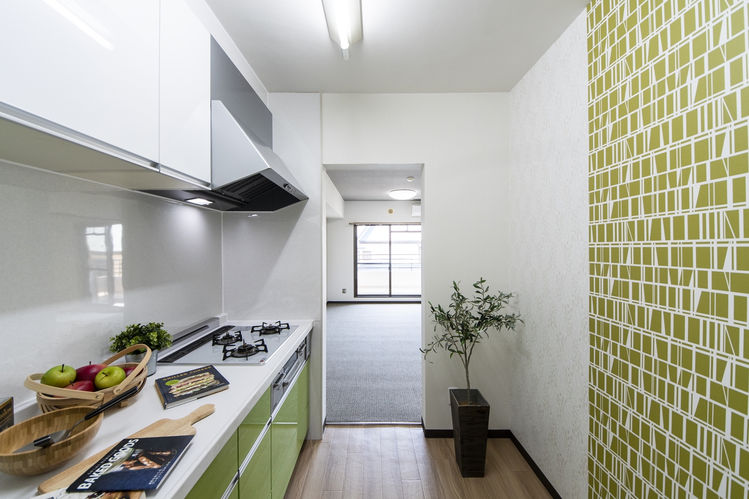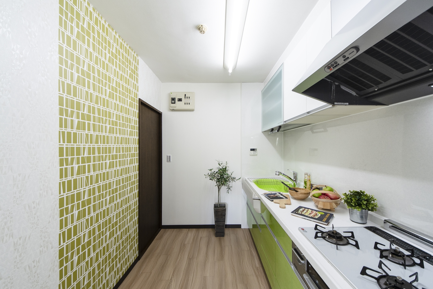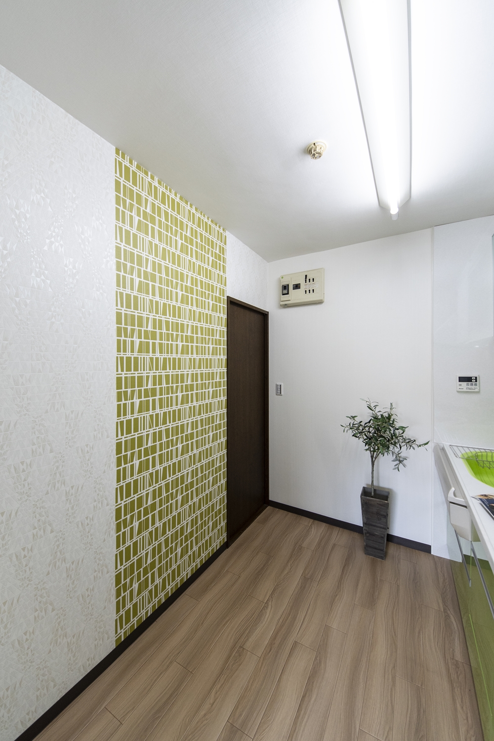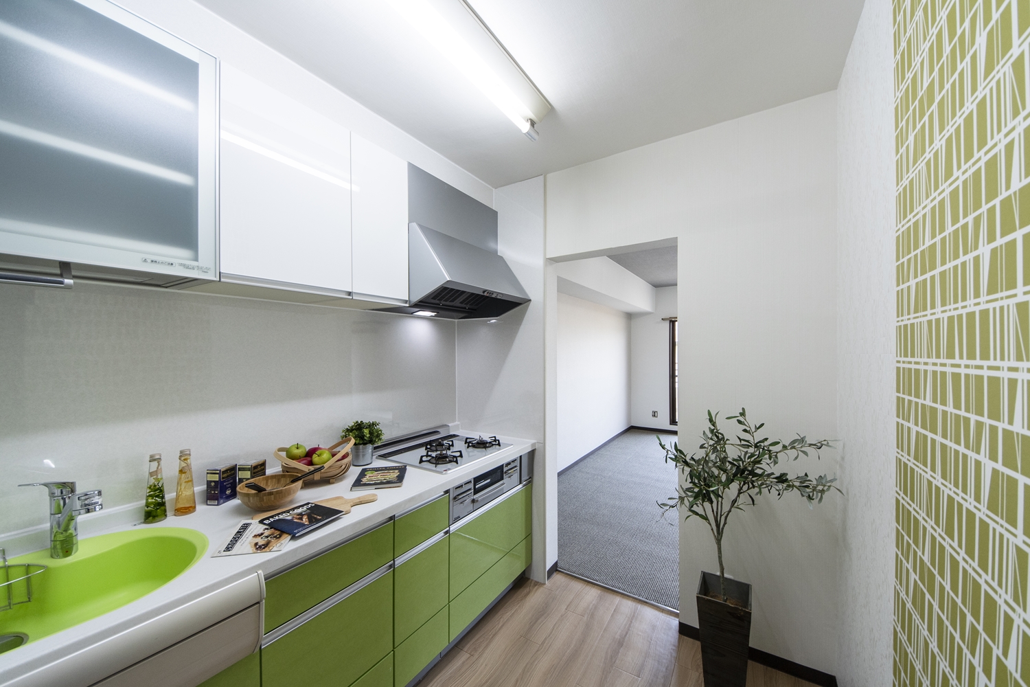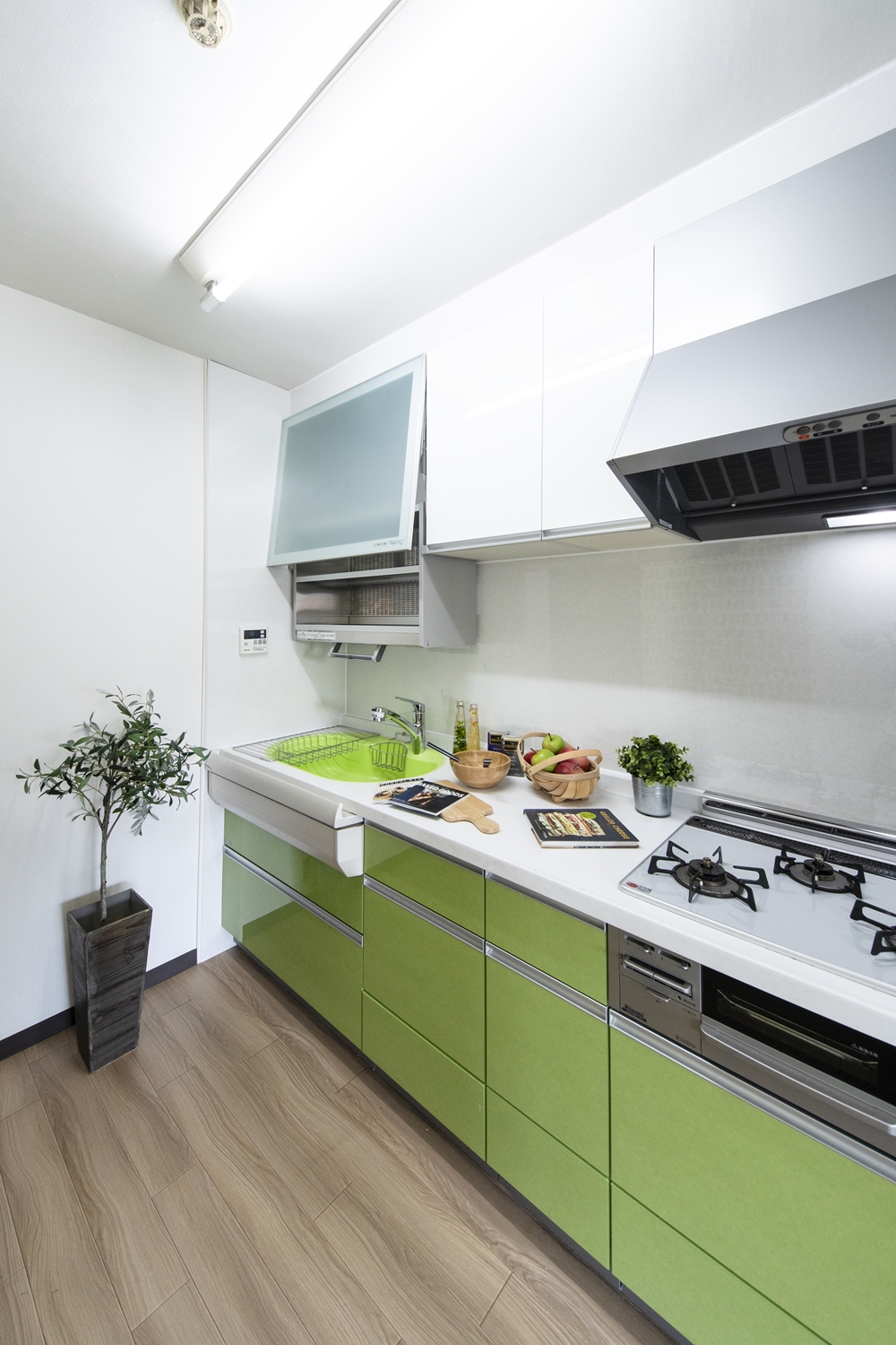キッチン/キッチン交換、天井・床・クロスを全面張替えました。若々しく爽やかなグリーンの扉をアクセントにしました。