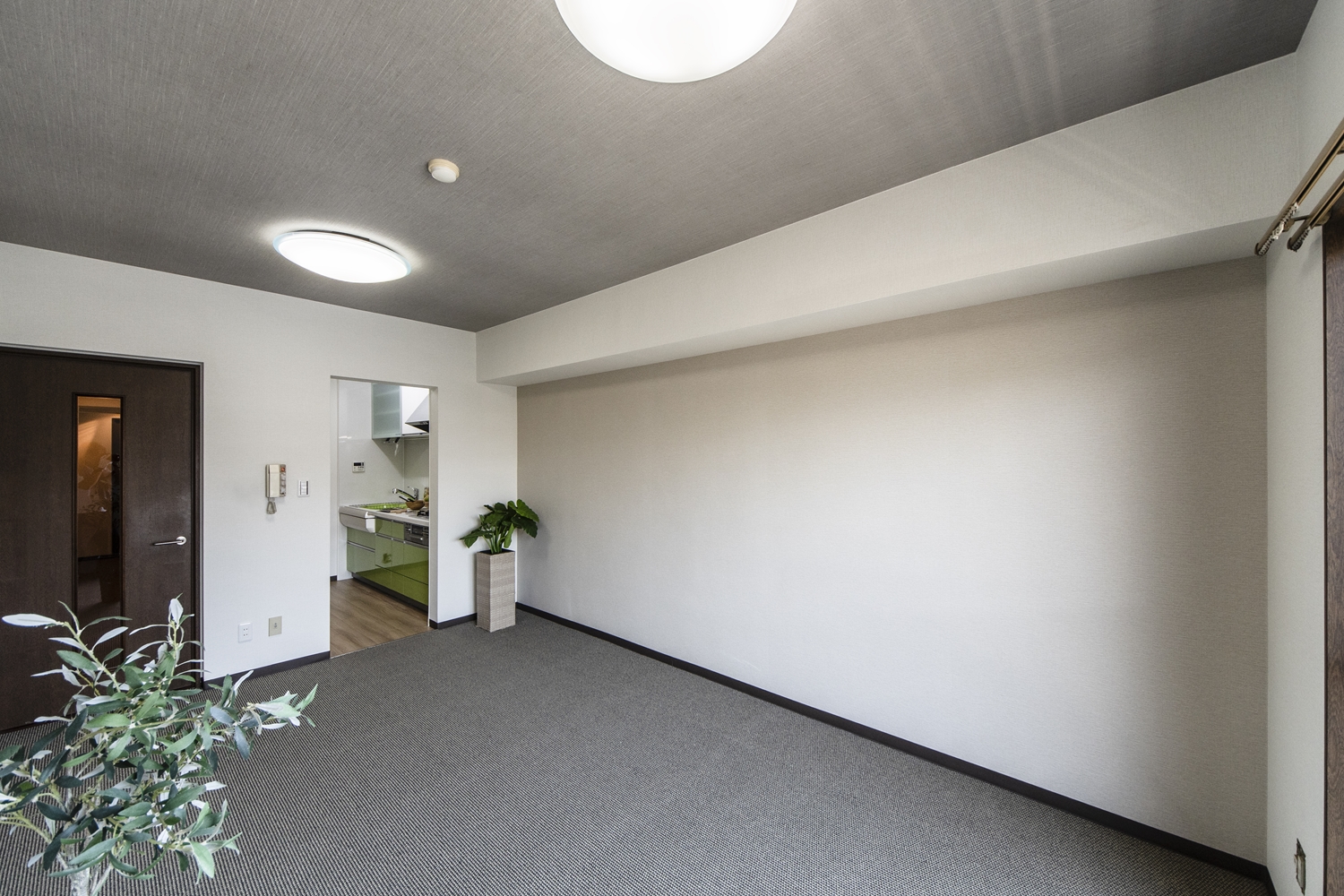 リビング/天井をはじめお部屋全体のクロス、カーペットの張り替えを行いました。グレー系のモノトーンカラーを差し色にしたシックな空間です。