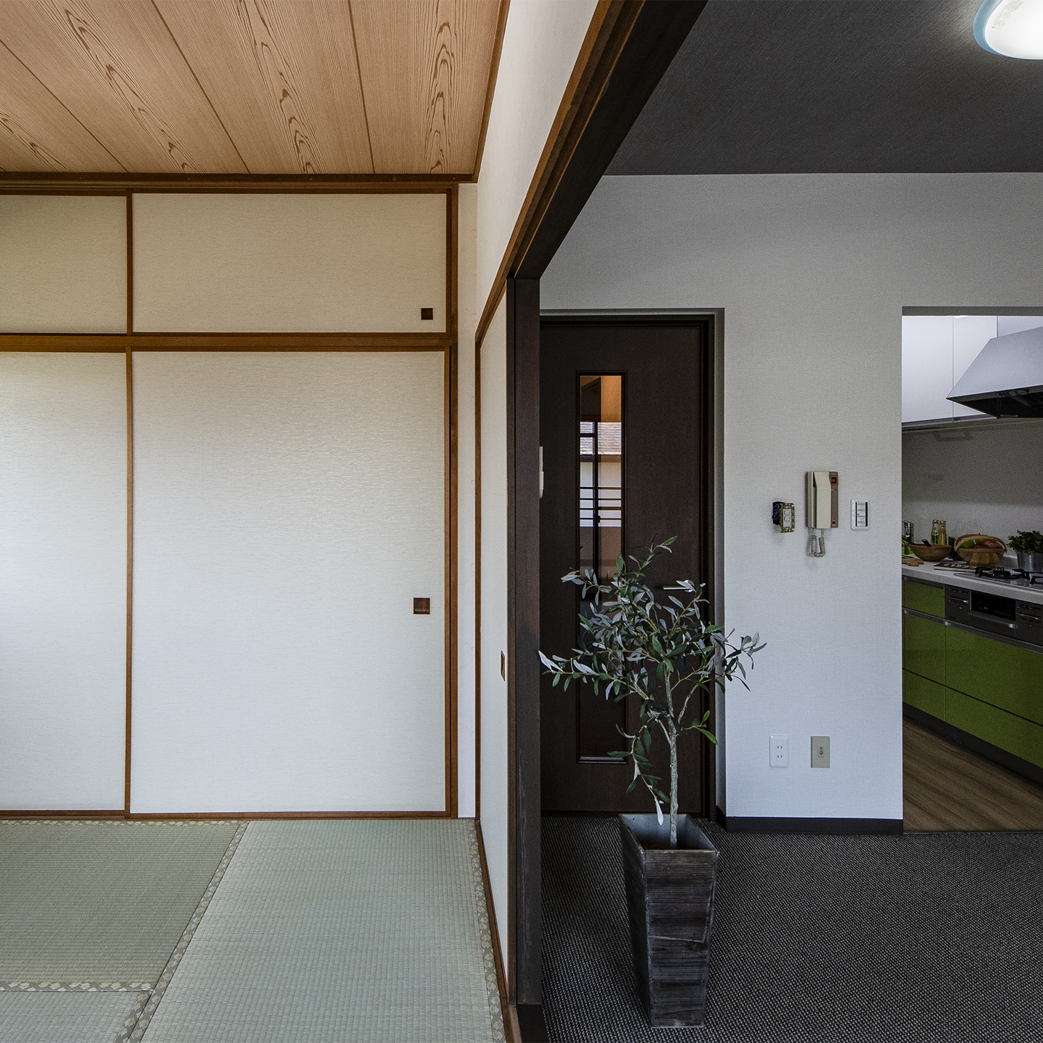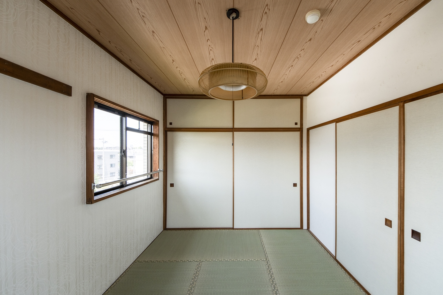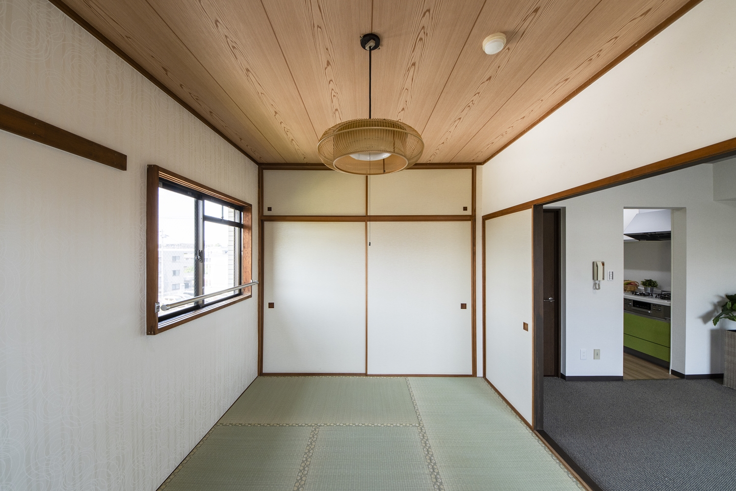 和室/天井と壁紙を全面貼り替えました。畳の状態が良かったので、畳本体ではなく、畳の「表替え」をしました。