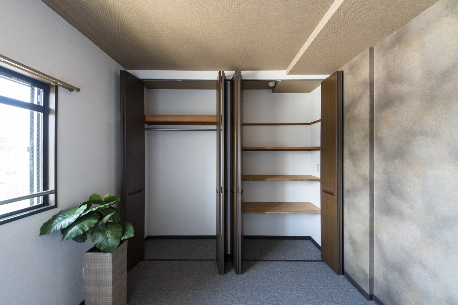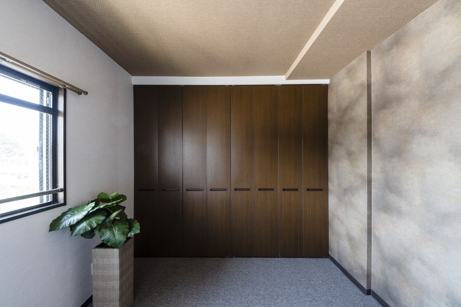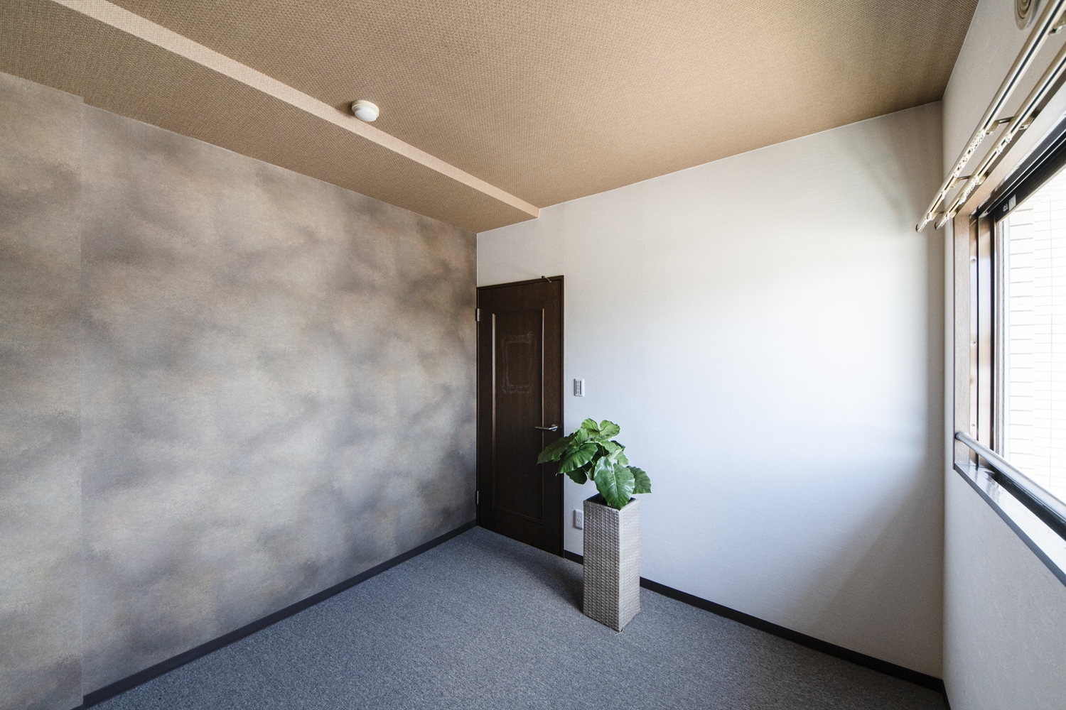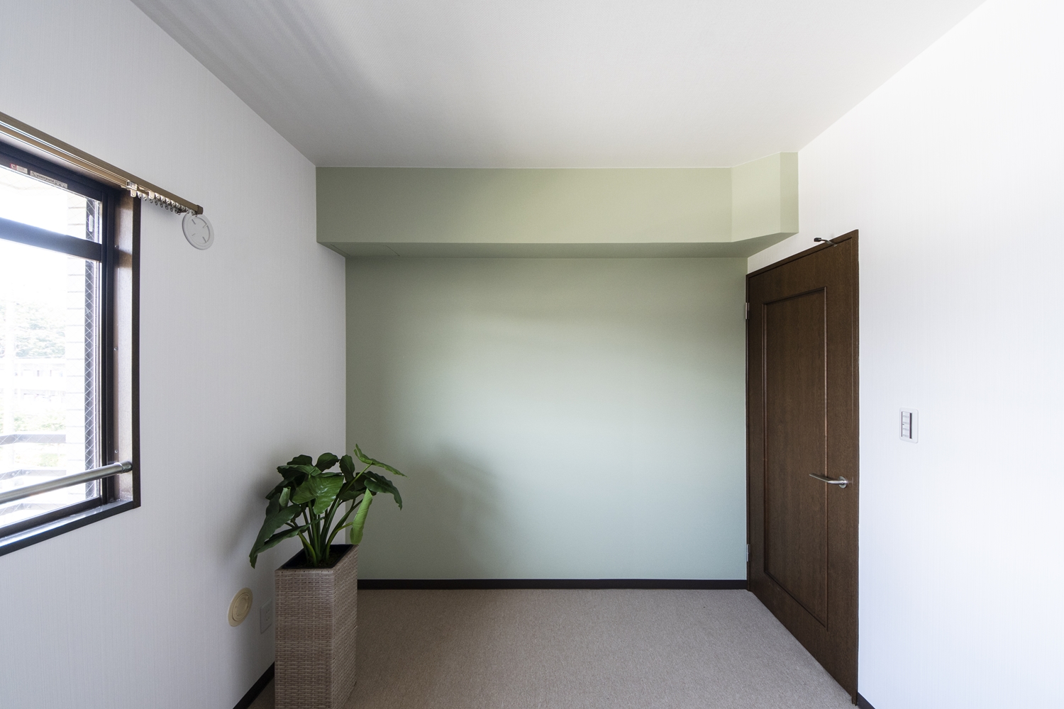 洋室/天井をはじめお部屋全体のクロス、カーペットの張り替えを行いました。癒し効果のあるグリーン系クロスをアクセントにしました。
