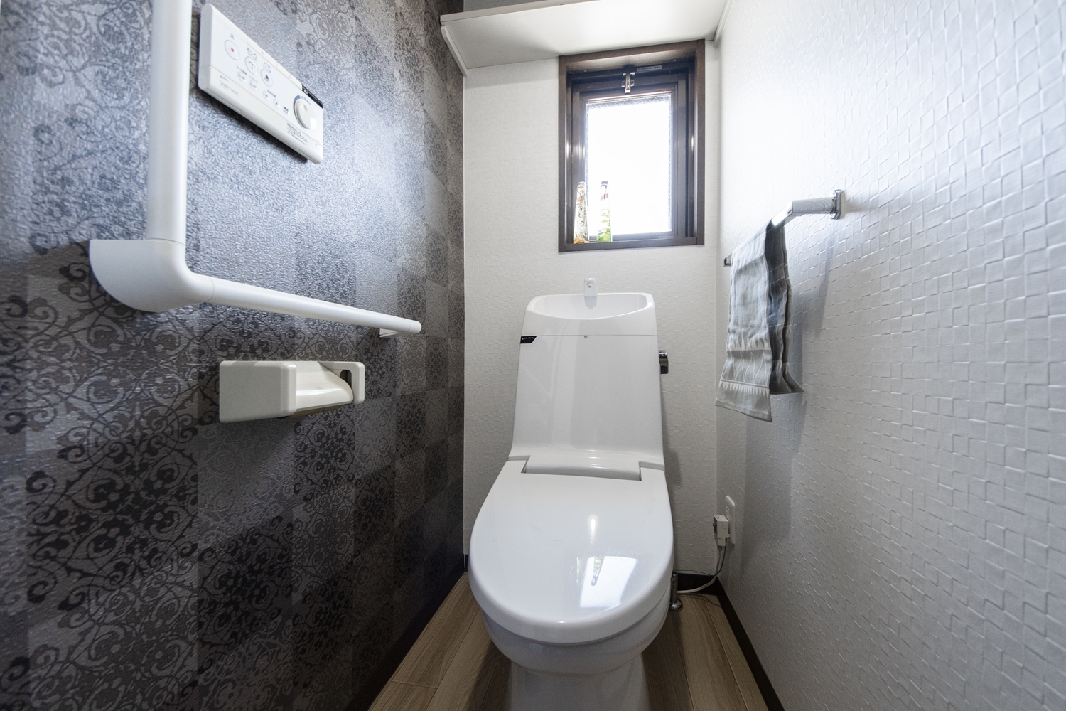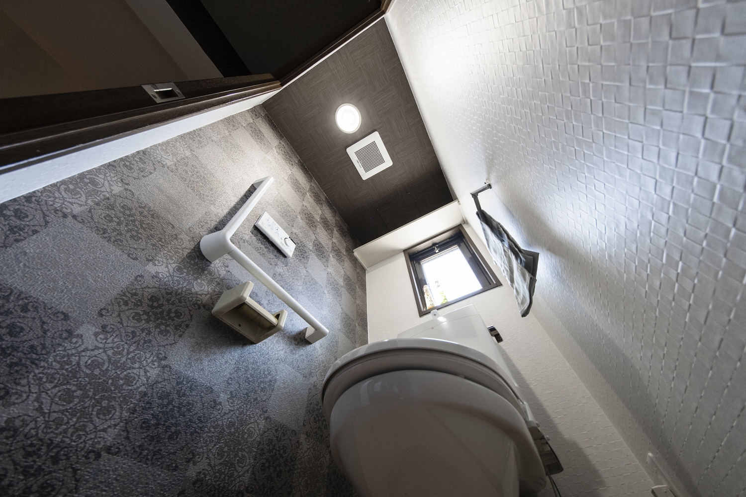 トイレ/シックな柄のクロスをアクセントにして、スタイリッシュで洗練された空間を演出しました。