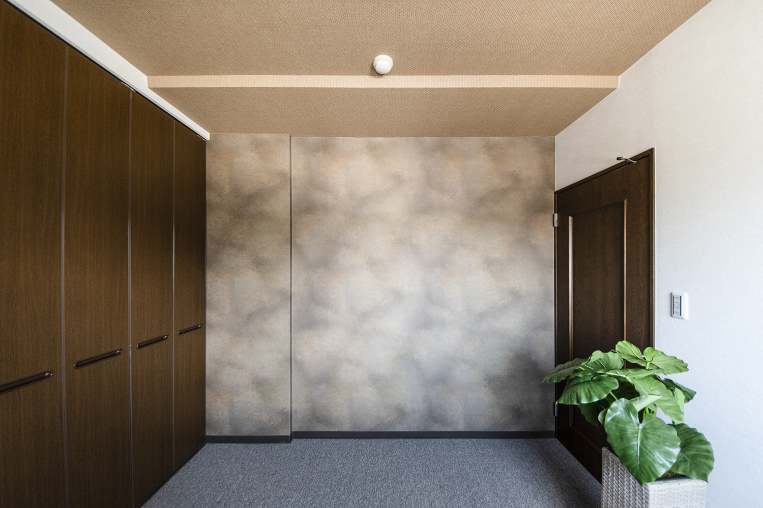 洋室/焼き物の風合いを表現したデザインクロスをお部屋のアクセントにしました。
