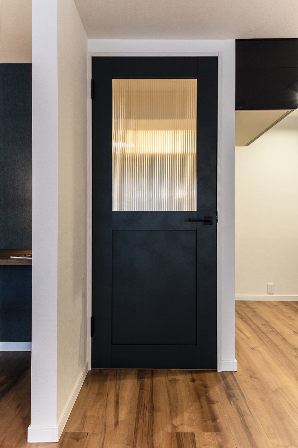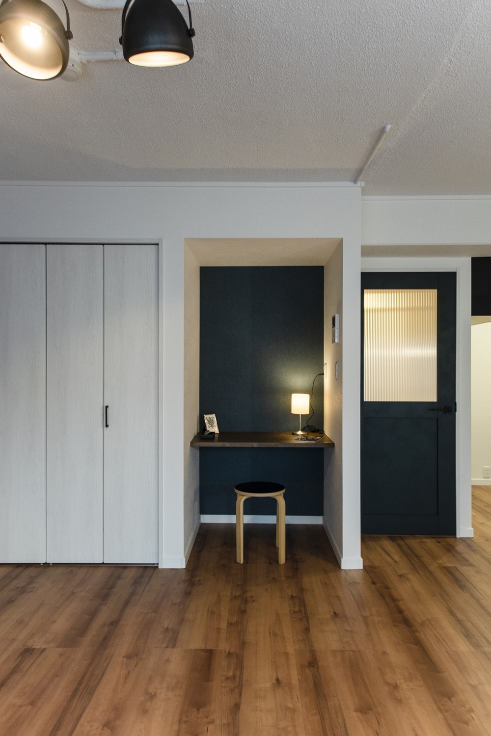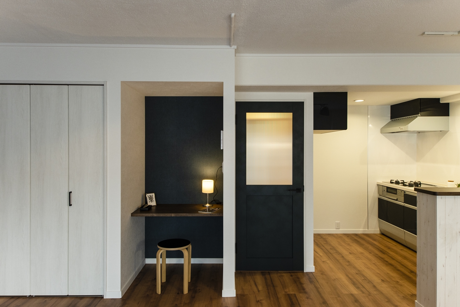ラフな白壁や天井に、ダークトーンカラーを差し色にした、スタイリッシュな空間。
