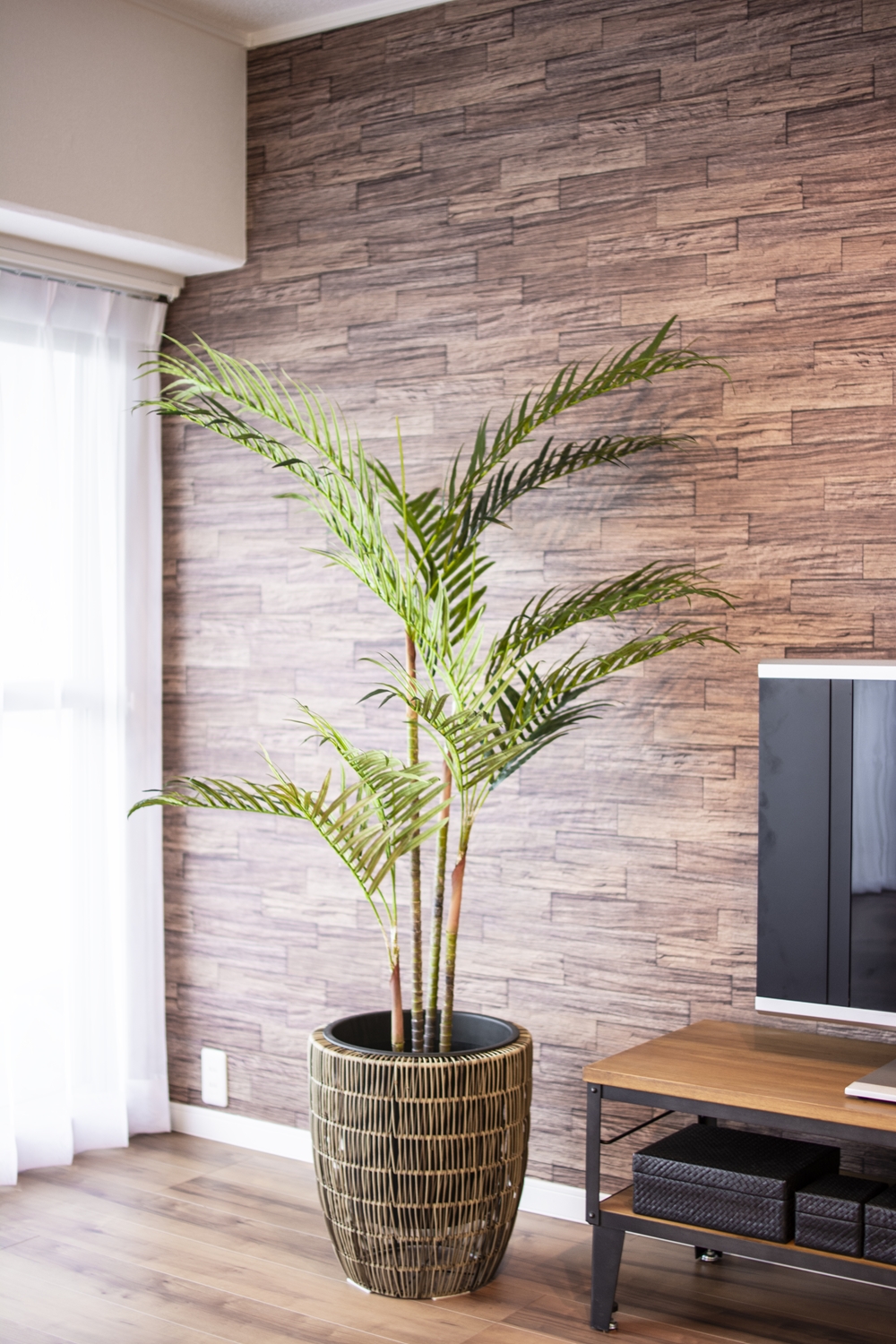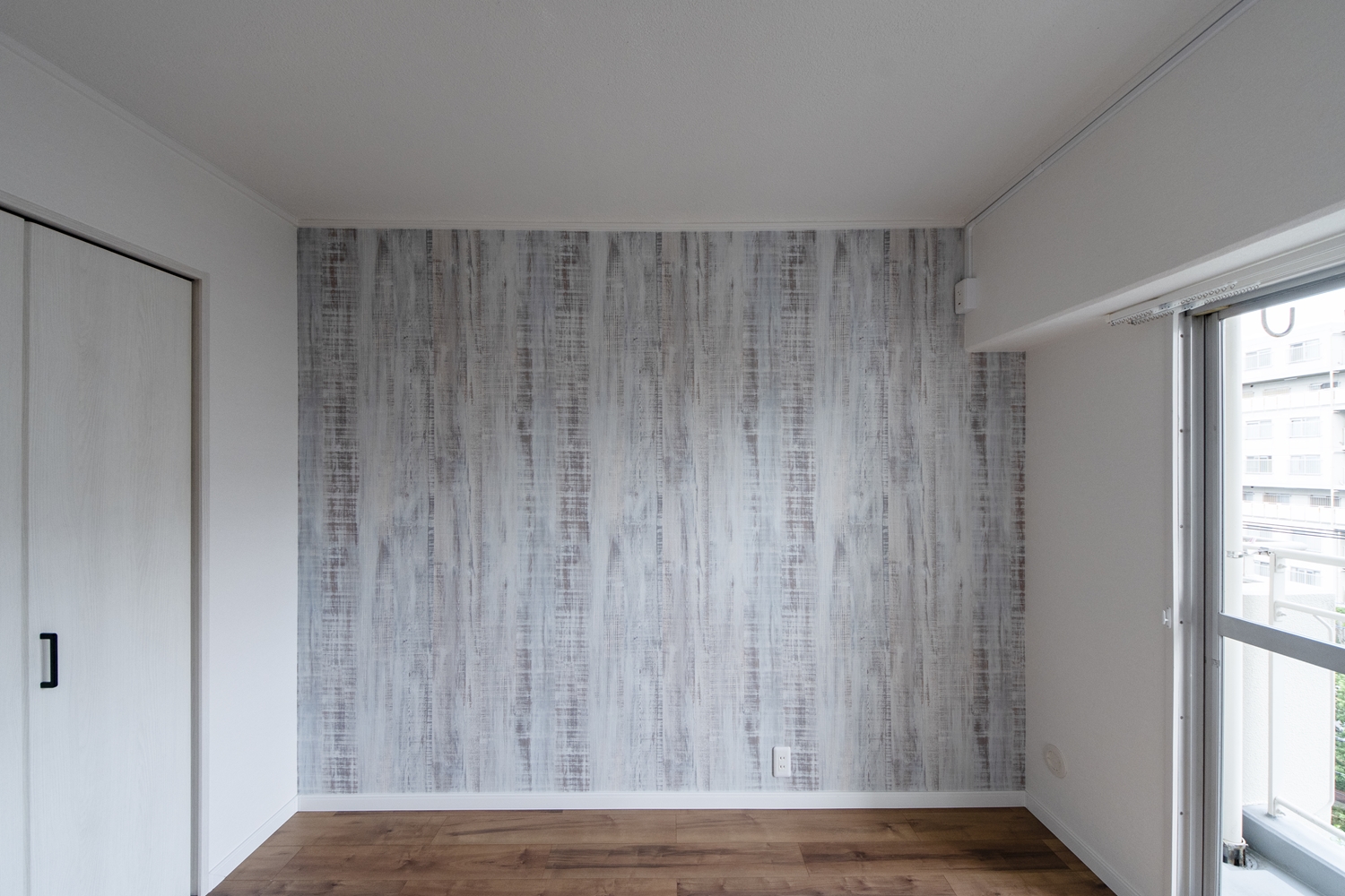 洋室/木に白ペンキを塗ったようなシャビーデザインのクロスをアクセントにして、アトリエのような空間に仕上がりました。