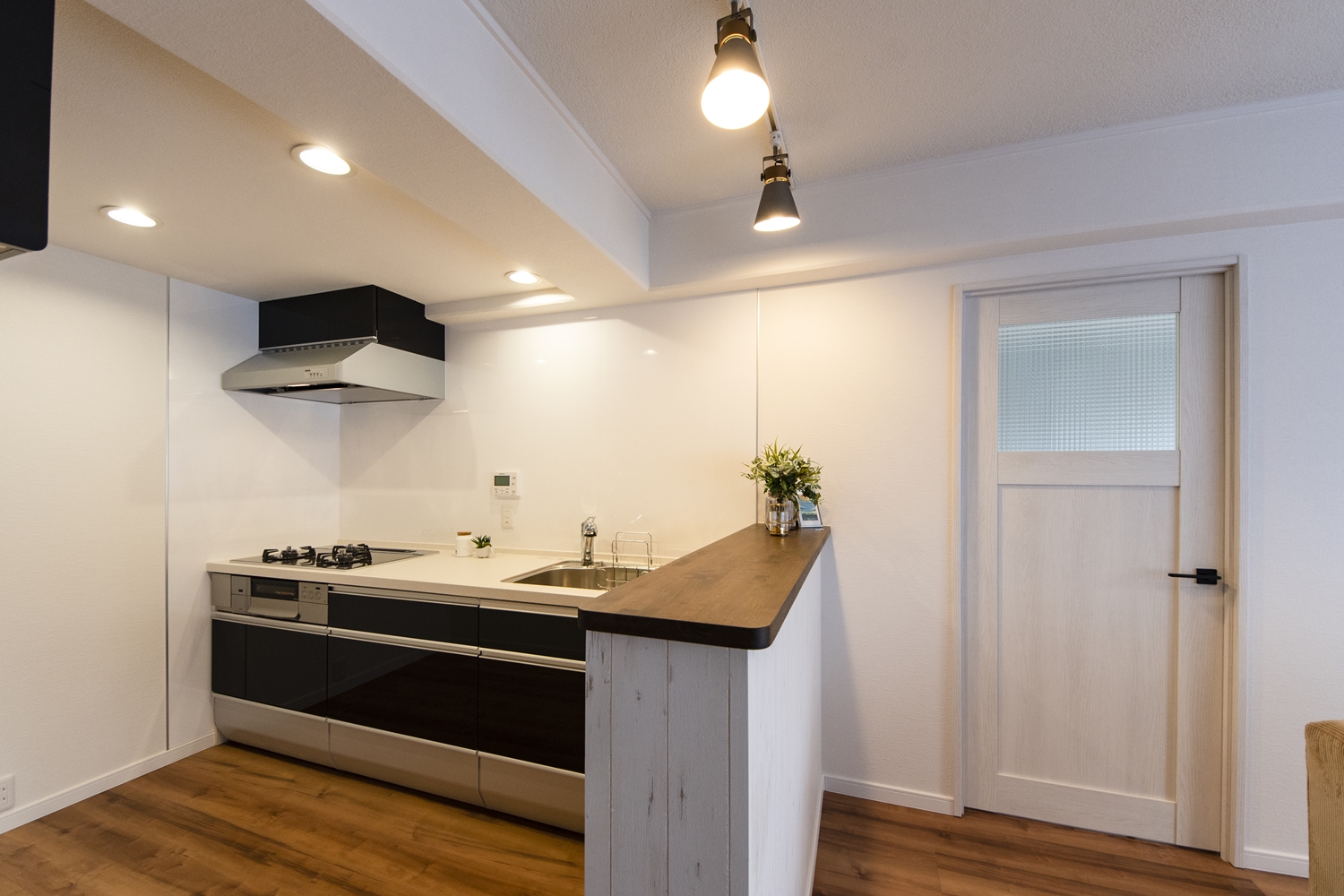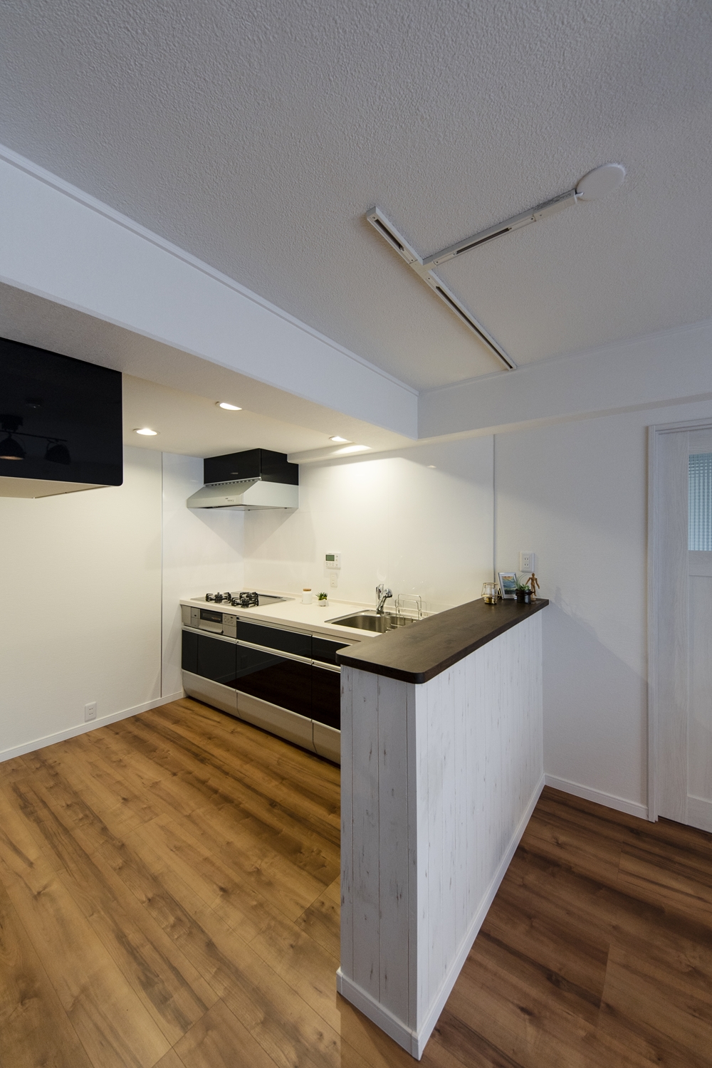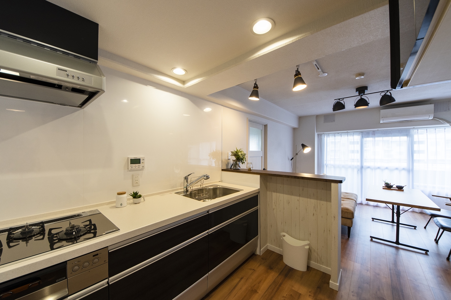 キッチンのサイドに少し背の高いカウンターをL字型になるように設置しました。さりげなくキッチンを隠しつつ、配膳もはかどりコミュニケーションがとりやすくなりました♪