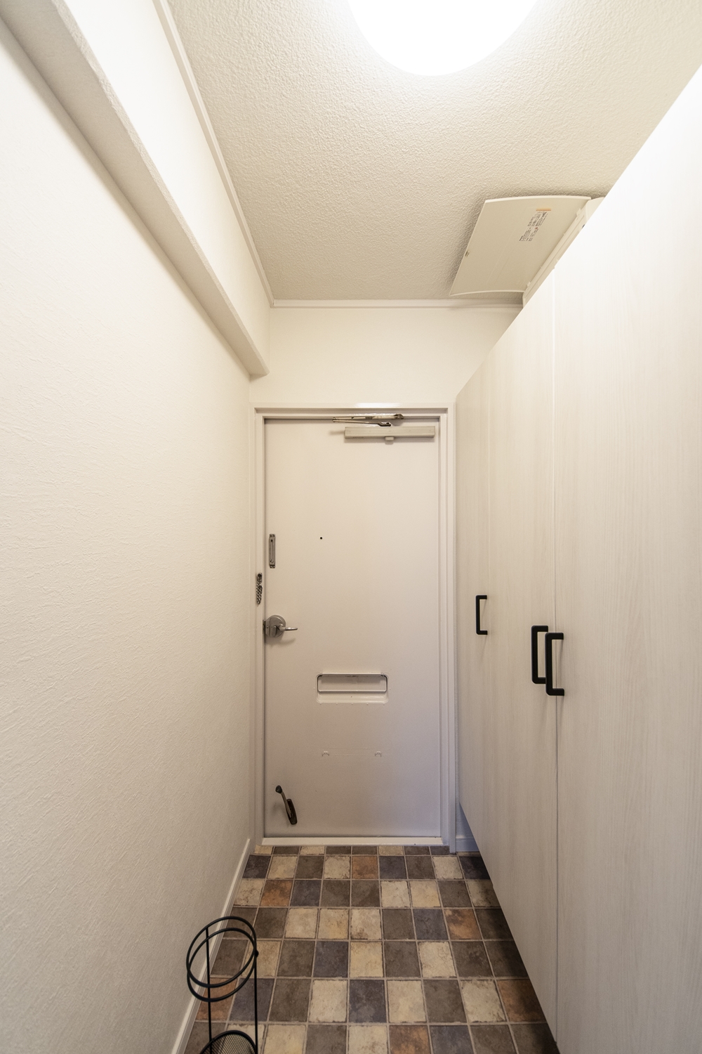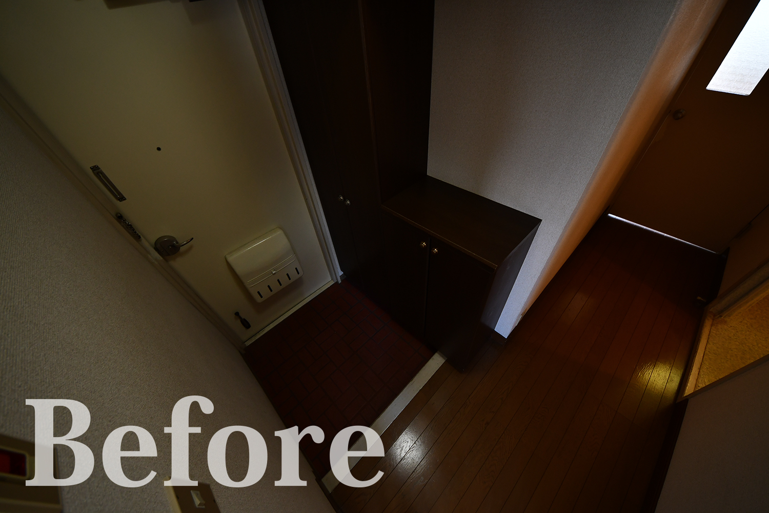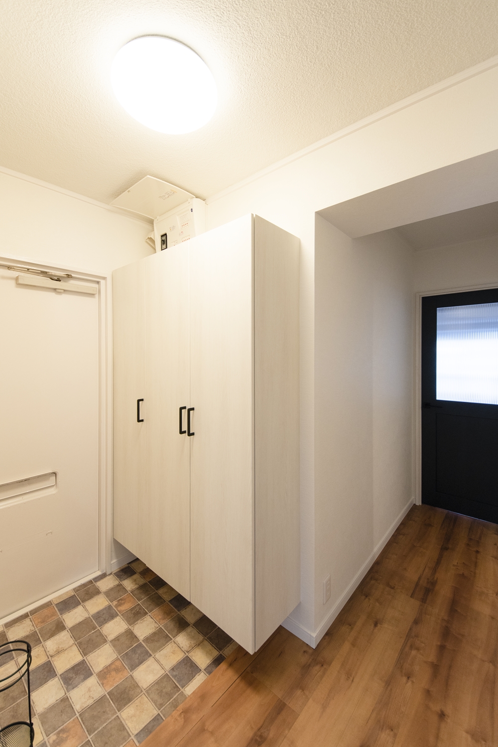 暗かった玄関が、白を基調とした明るい玄関に!店舗などでよく使われる、アンティークタイル調のフロアを施した、とってもおしゃれな空間に大変身!