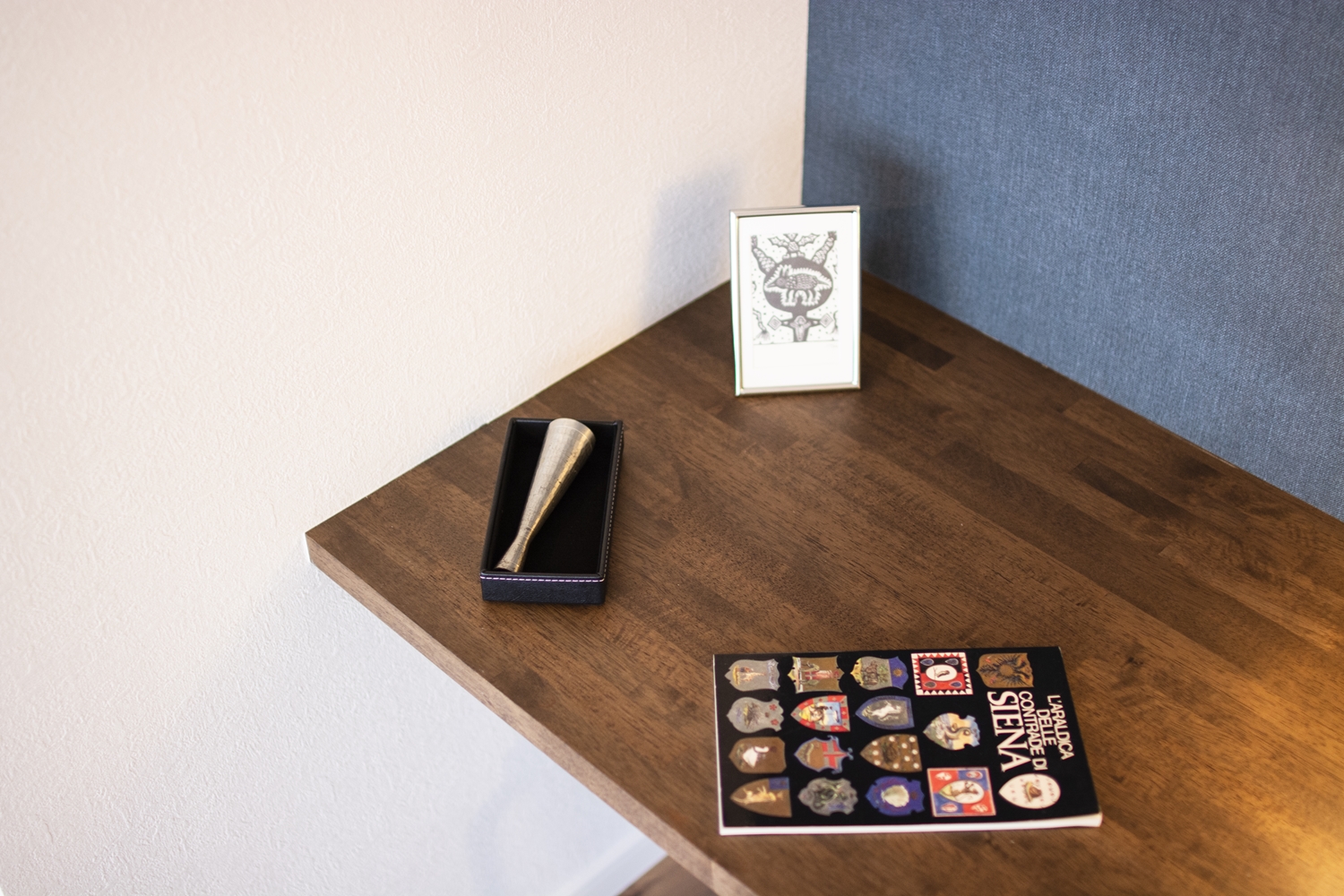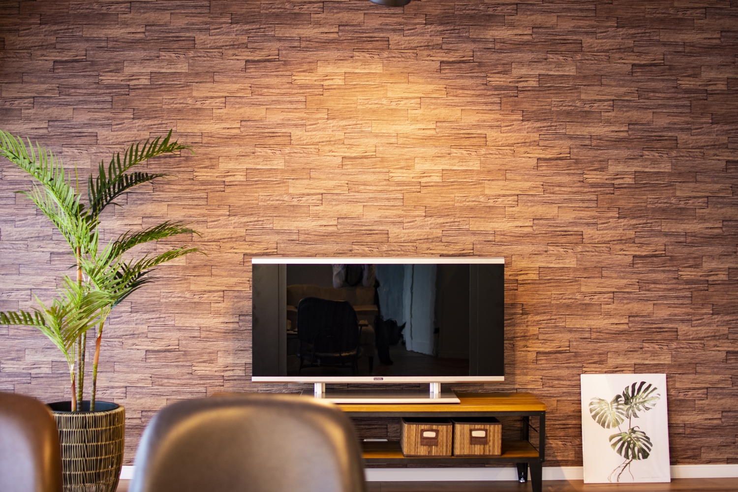 木を組み合わせたようなクロスをアクセントにしたおしゃれな空間。カフェのような雰囲気でとても落ち着きます。