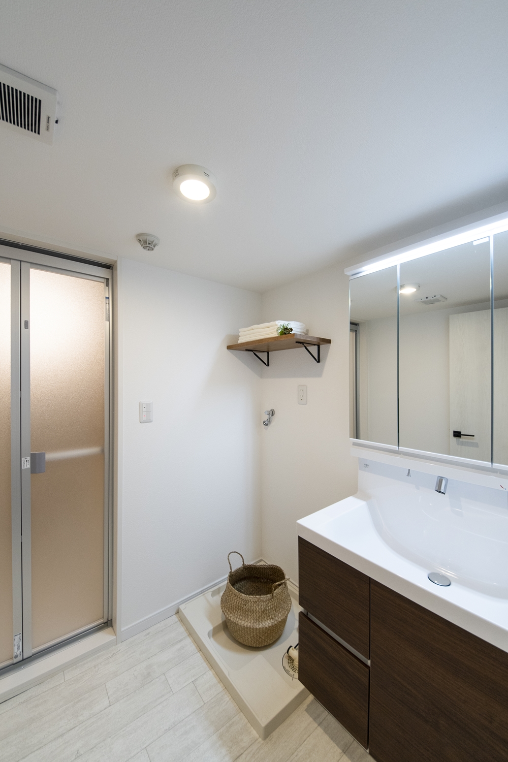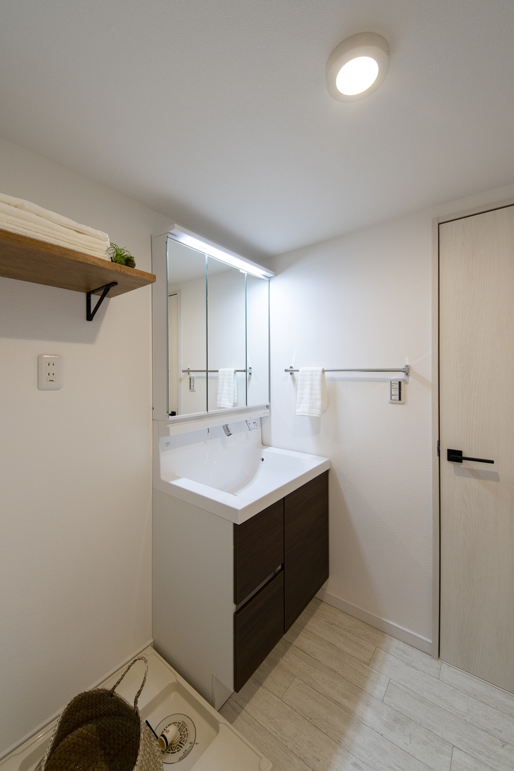 白を基調とした清潔感のあるサニタリールーム。洗面化粧台扉カラーをダークブラウンでアクセントにしました。