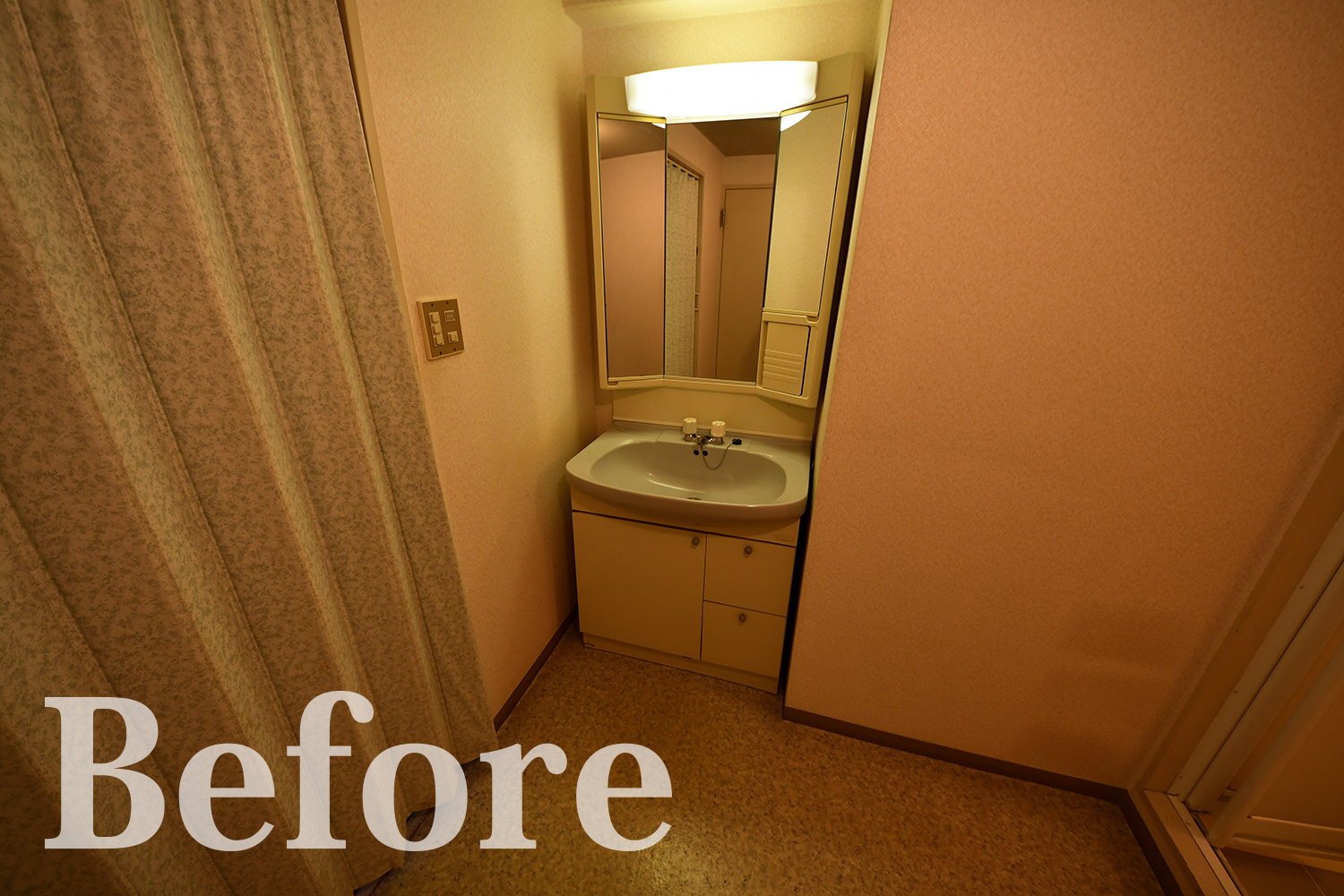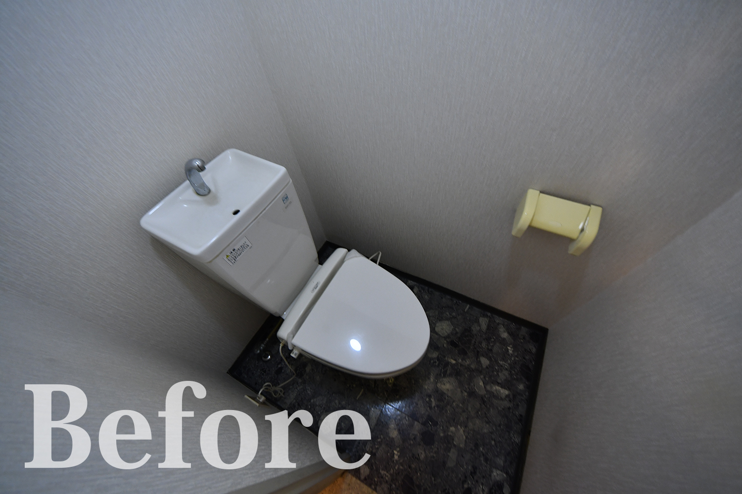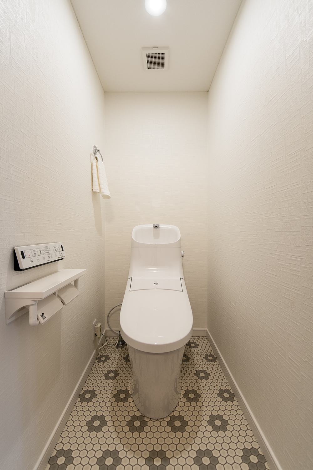 床・クロスの全面張替え、新規便器取付、照明器具の交換を行いました。花柄をあしらったタイル調のフロアがアクセントになっています。