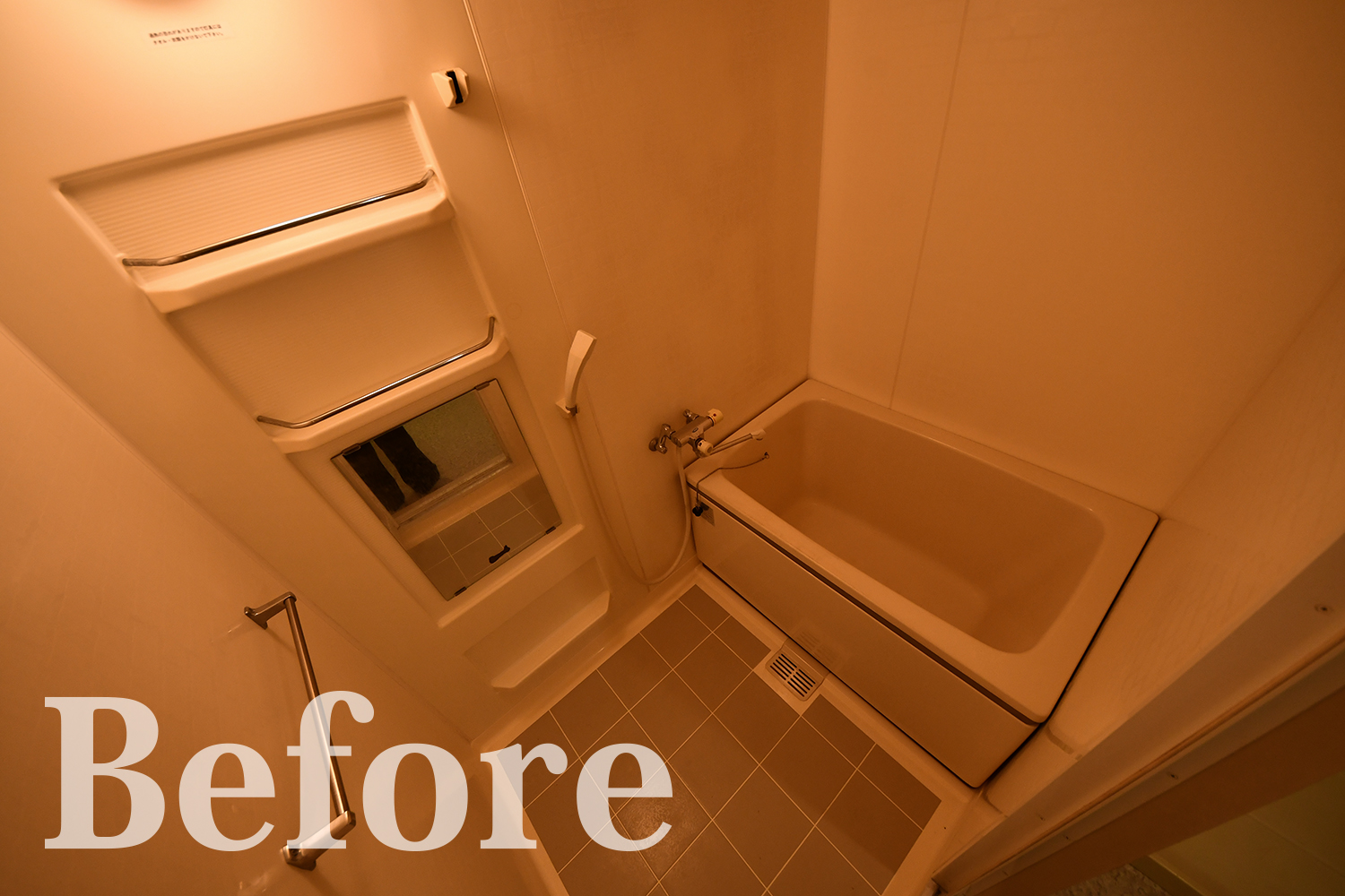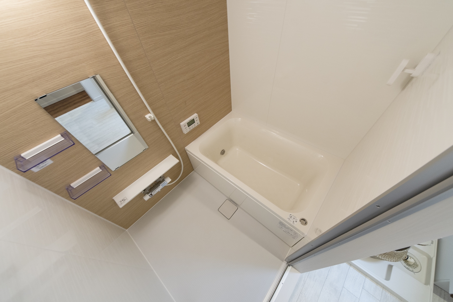 既存のユニットバスを解体撤去し、新規設置しました。ナチュラルな木目柄のアクセントパネルが癒しの空間を演出します。