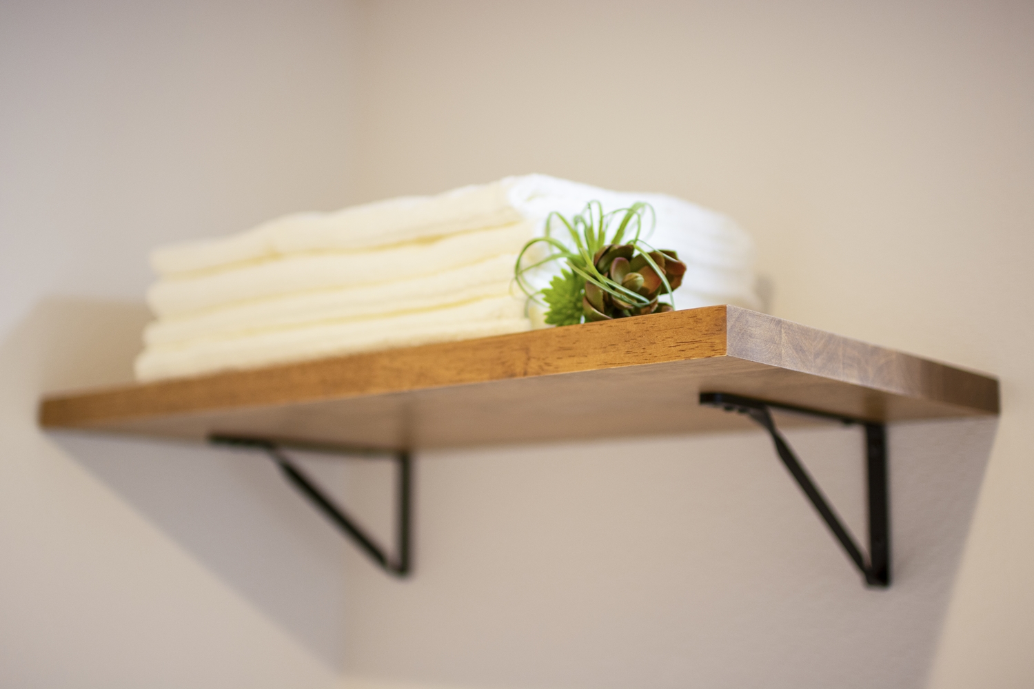 洗濯機置き場の上に、ラフな木目のシェルフを施しました。飾られたアイテムを引き立てます。