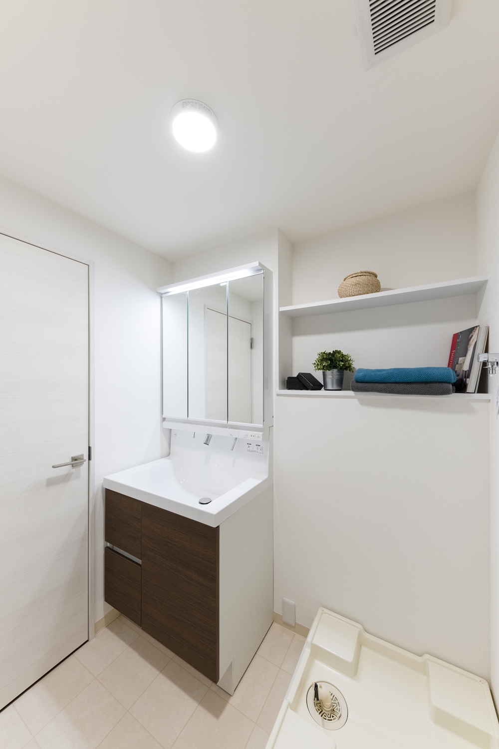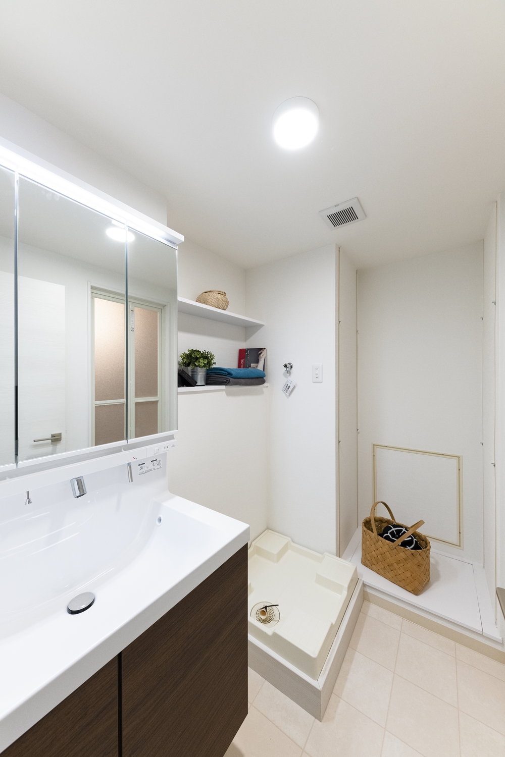 サニタリールーム/白を基調とした清潔感のある空間に大変身しました。スタイリッシュで機能的な洗面化粧台に交換しました。