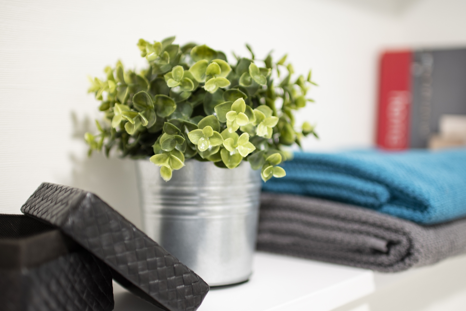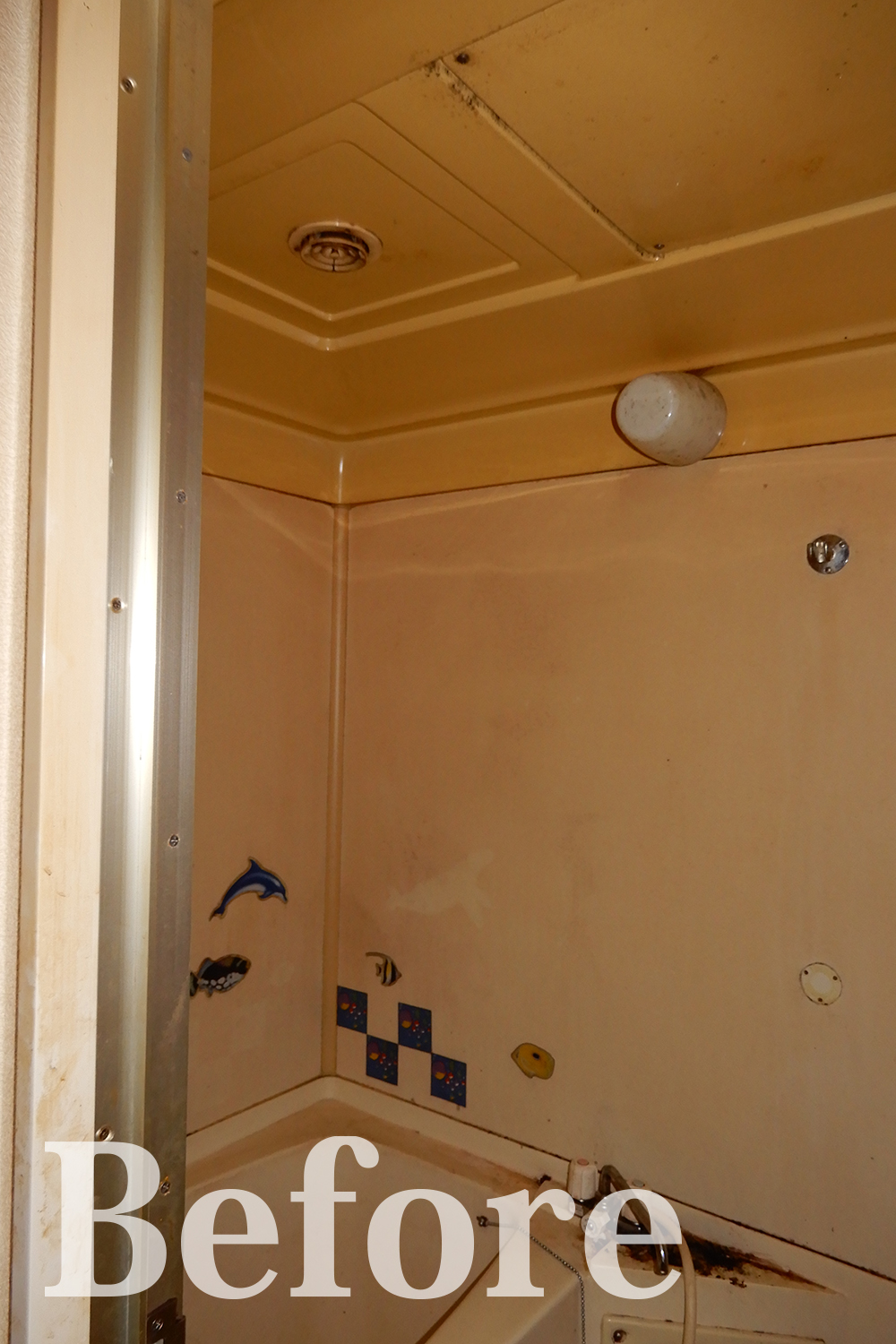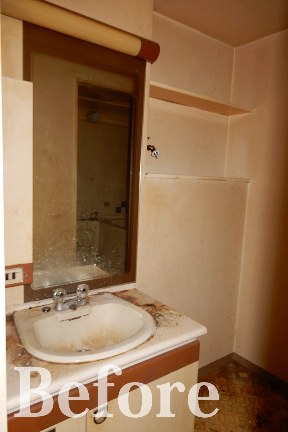 サニタリールーム/白を基調とした清潔感のある空間に大変身しました。既存のカウンター部分に、白いフィルムシートを貼りました。