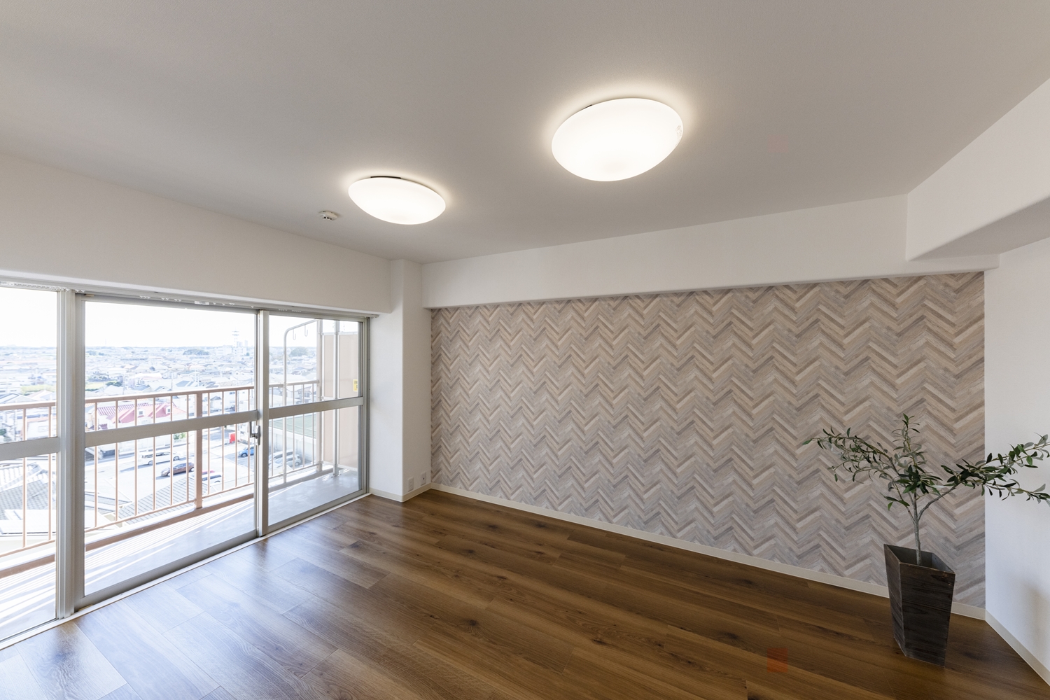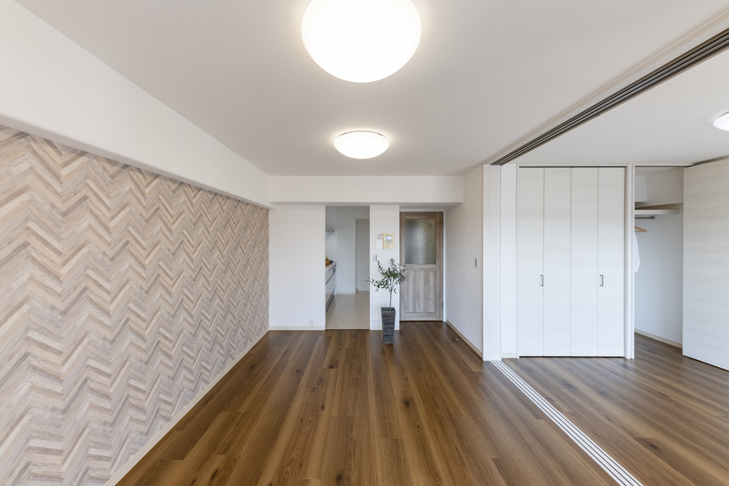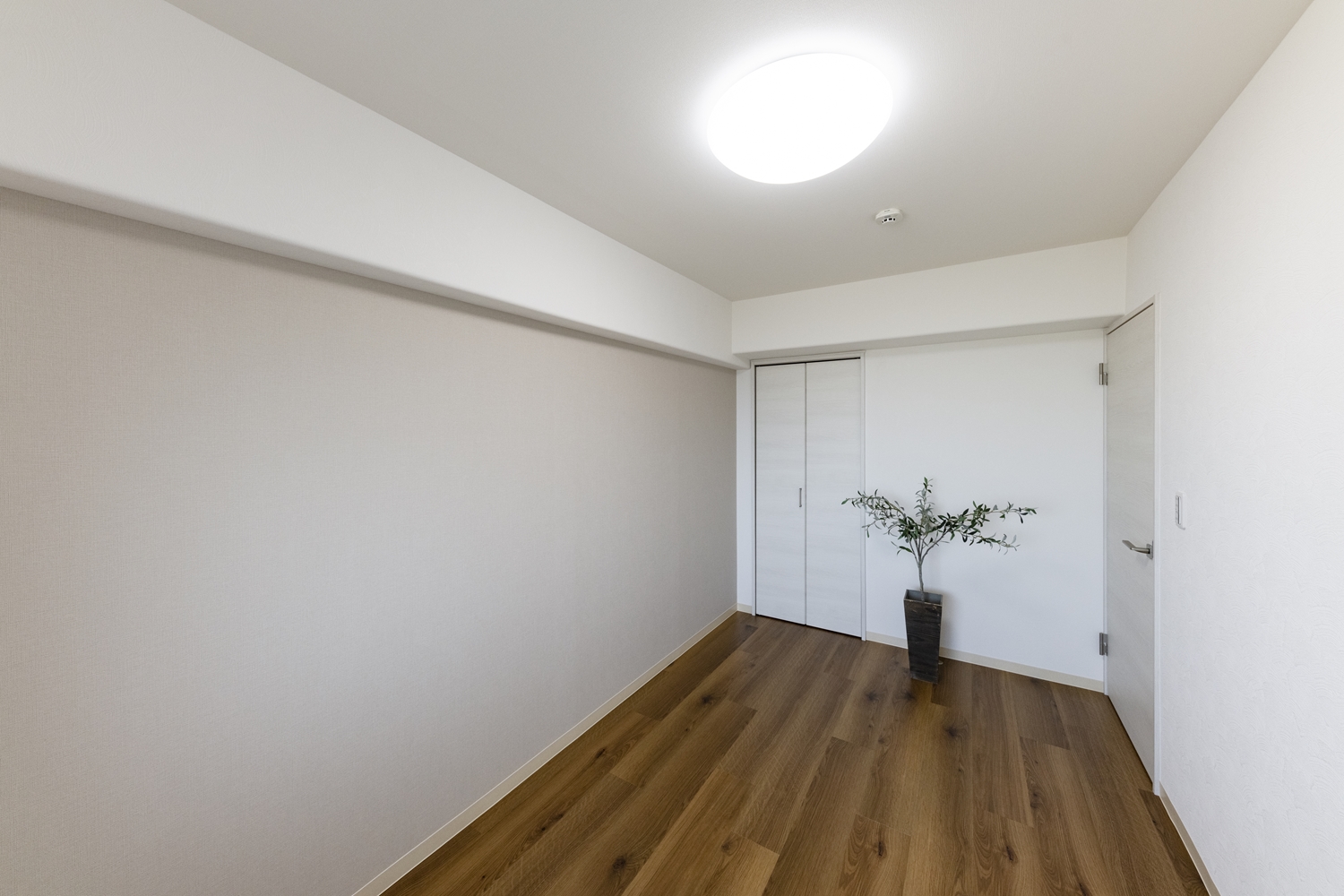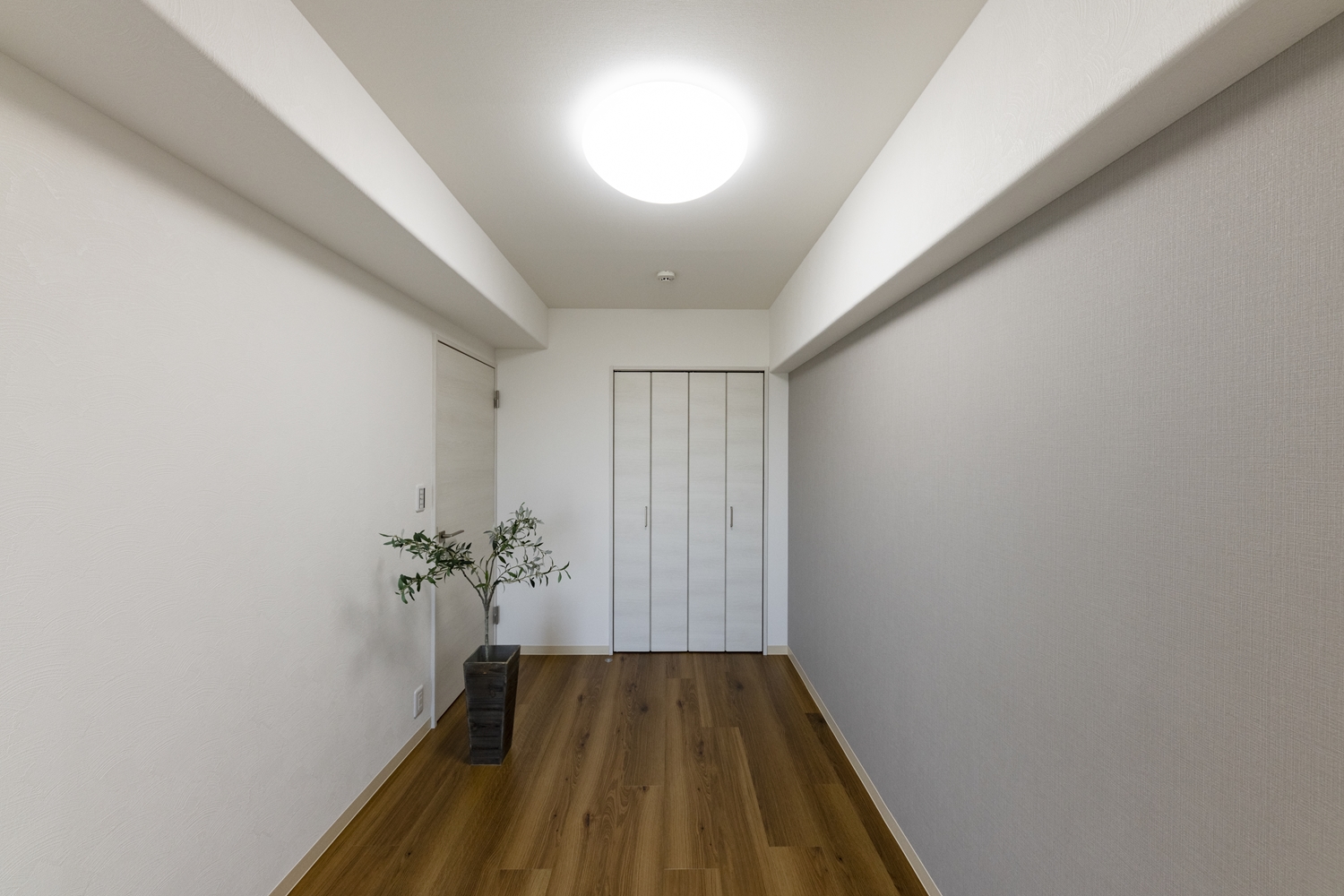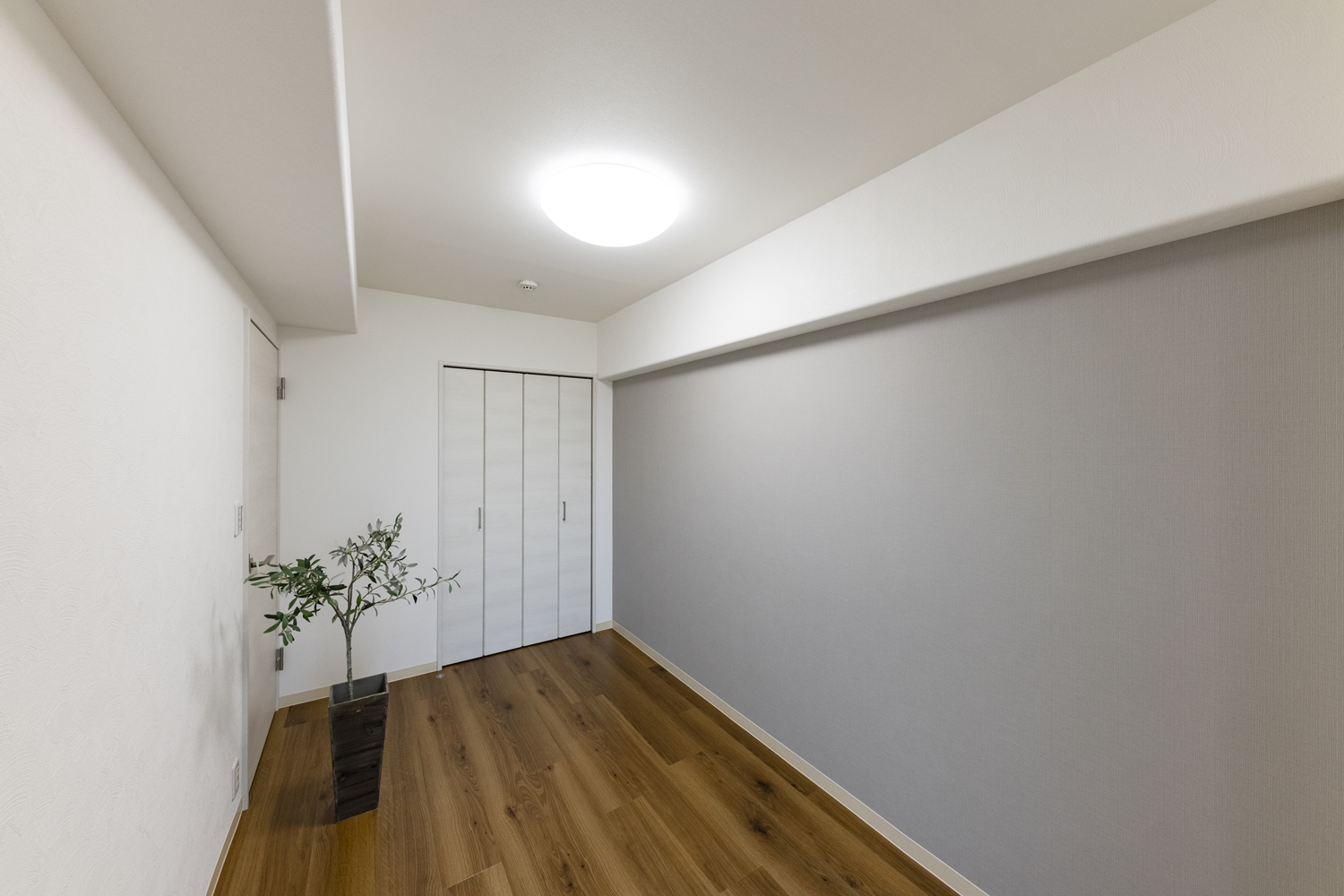 洋室/天井・壁のクロスの貼り替え、床材の上張り、照明や建具の交換を行いました。淡いグレー系のアクセントクロスを施してお部屋にワンポイントをプラスさせました!