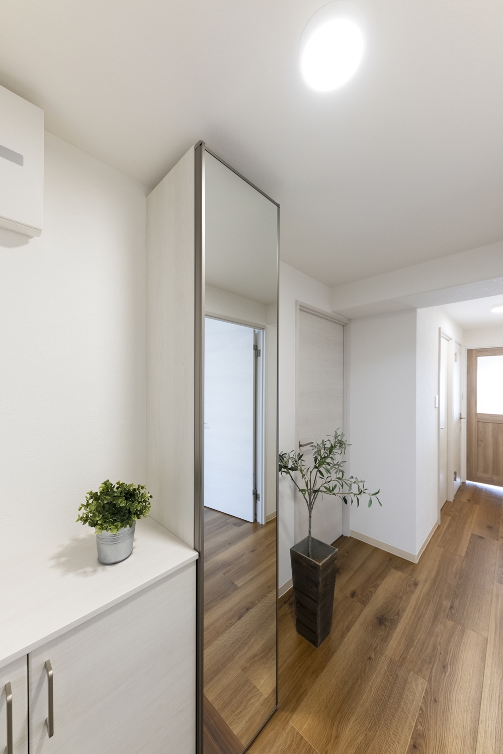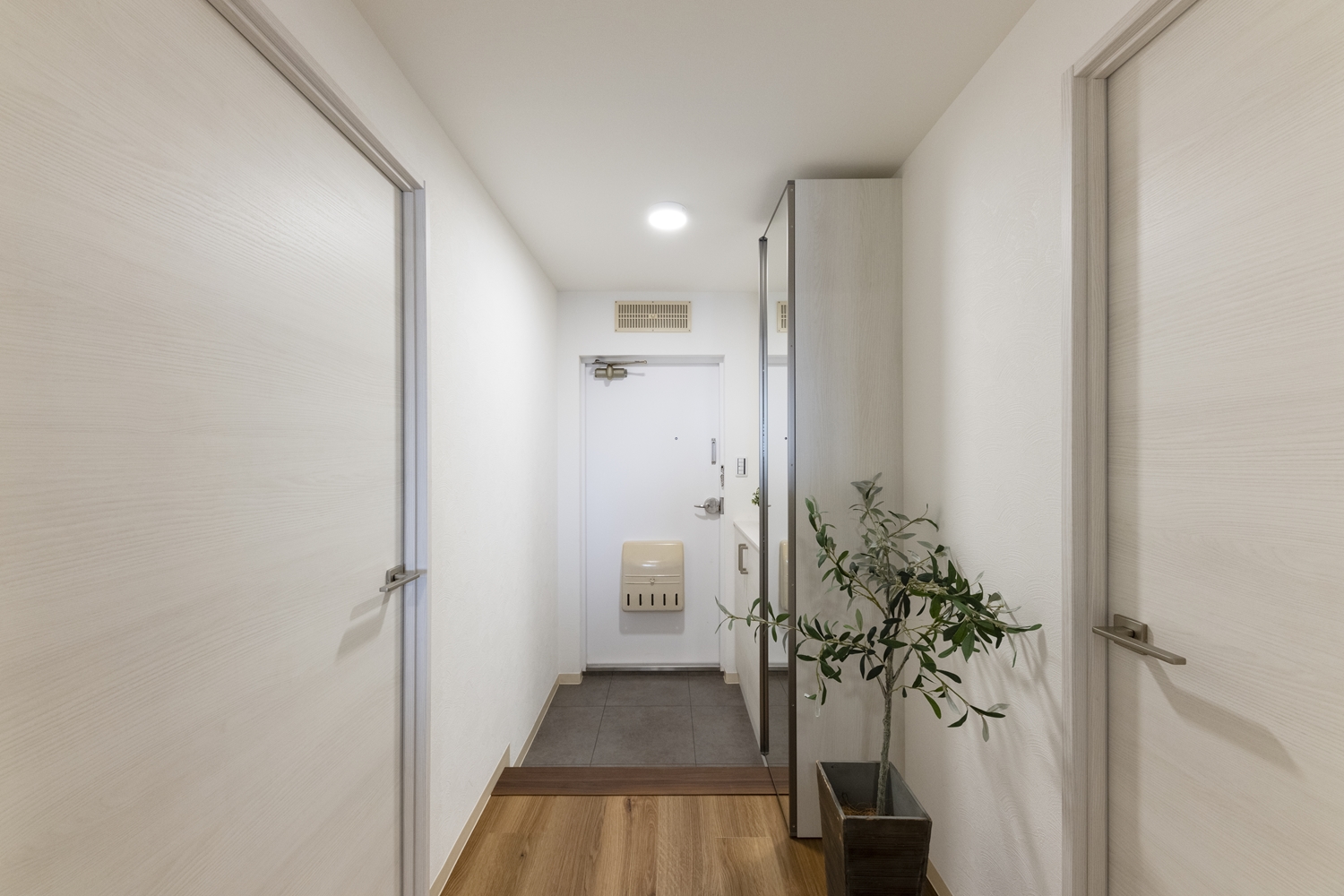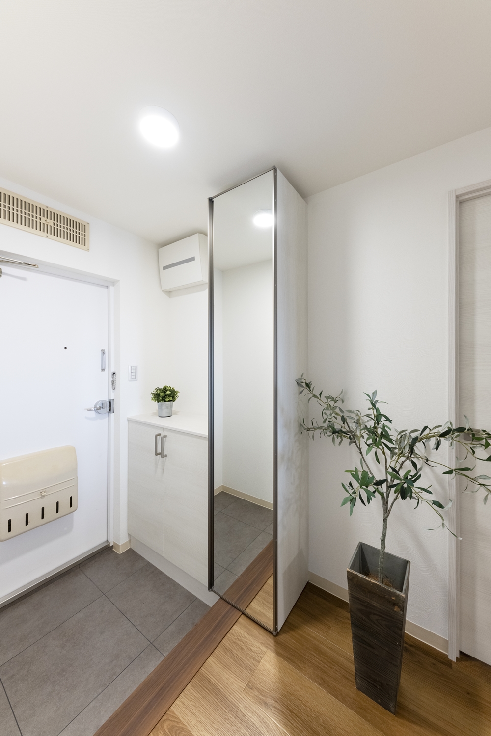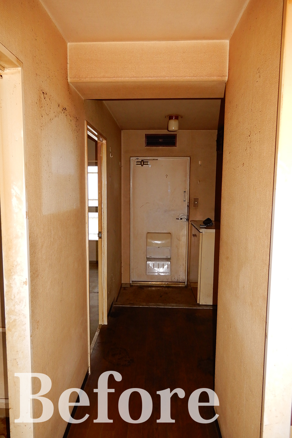 玄関/天井・壁紙、床を貼り換えて、玄関扉を塗装しました。