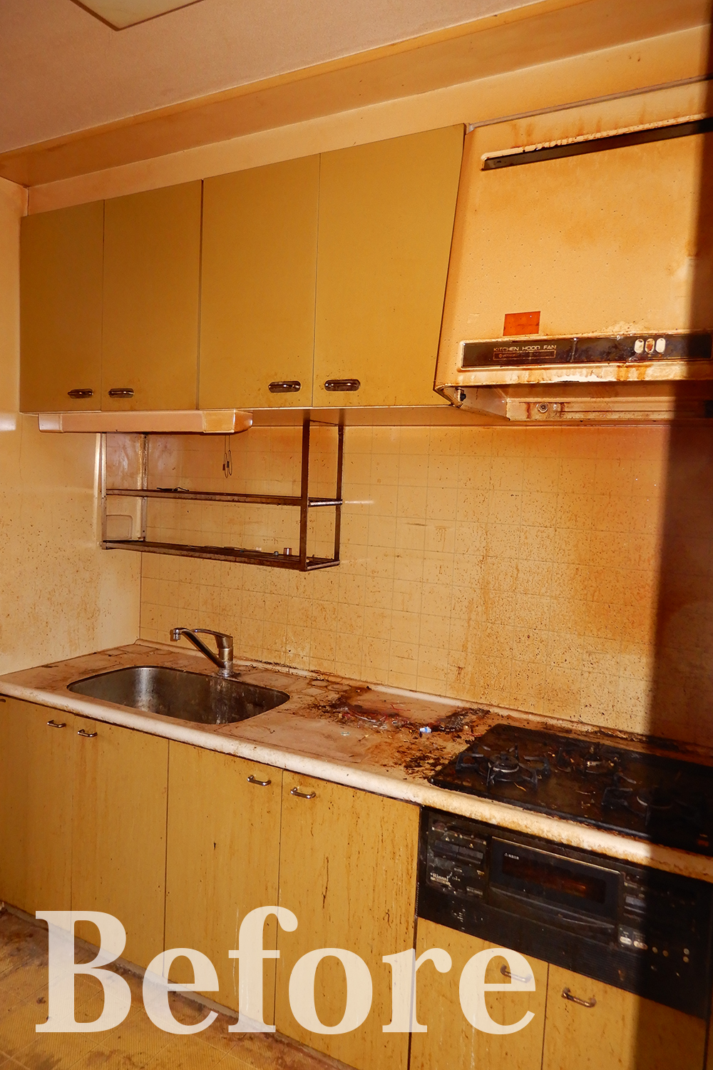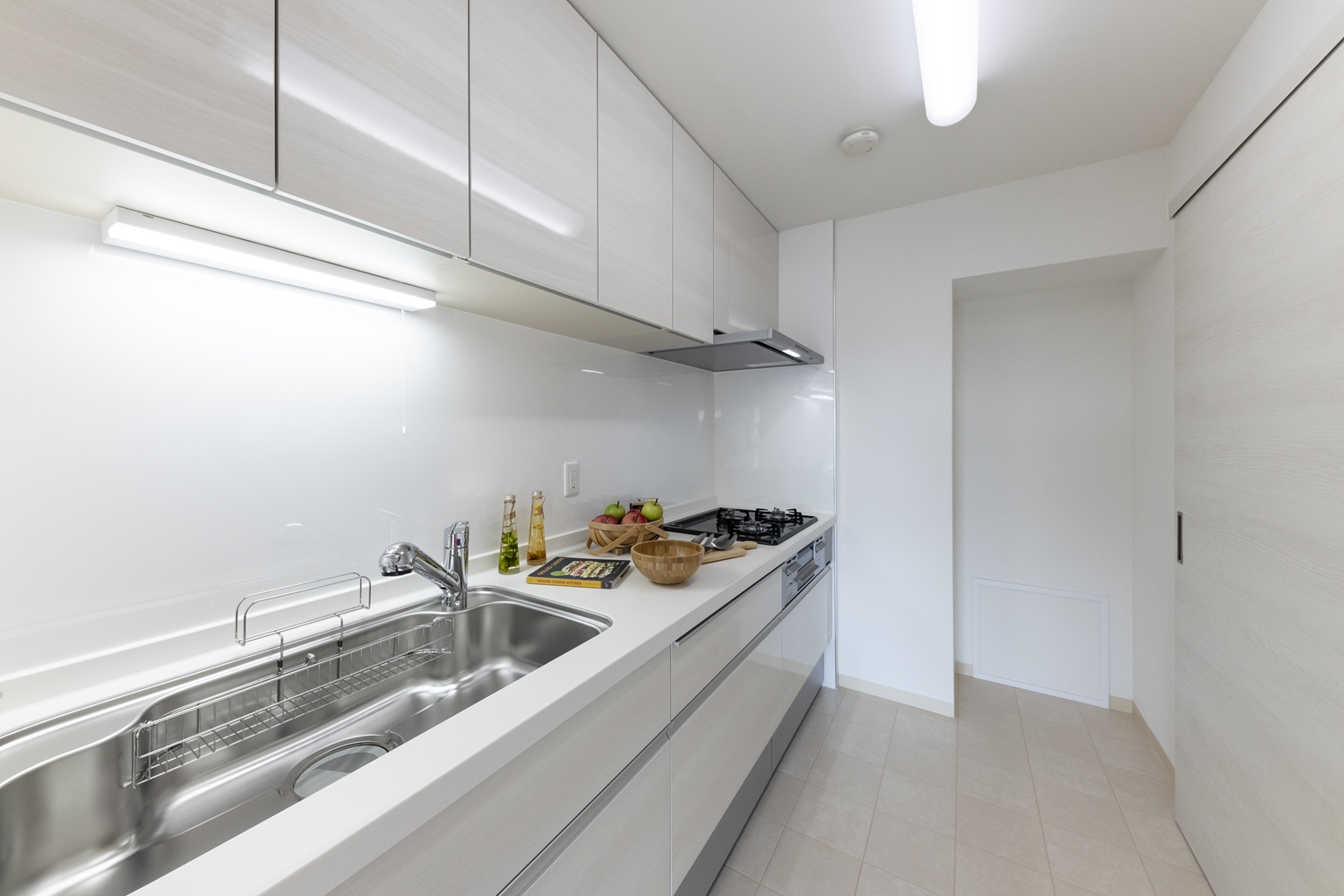 キッチン/天井・壁クロスの貼り替え、床材の上張り、照明の交換を行い、明るく清潔感のある空間に大変身しました。