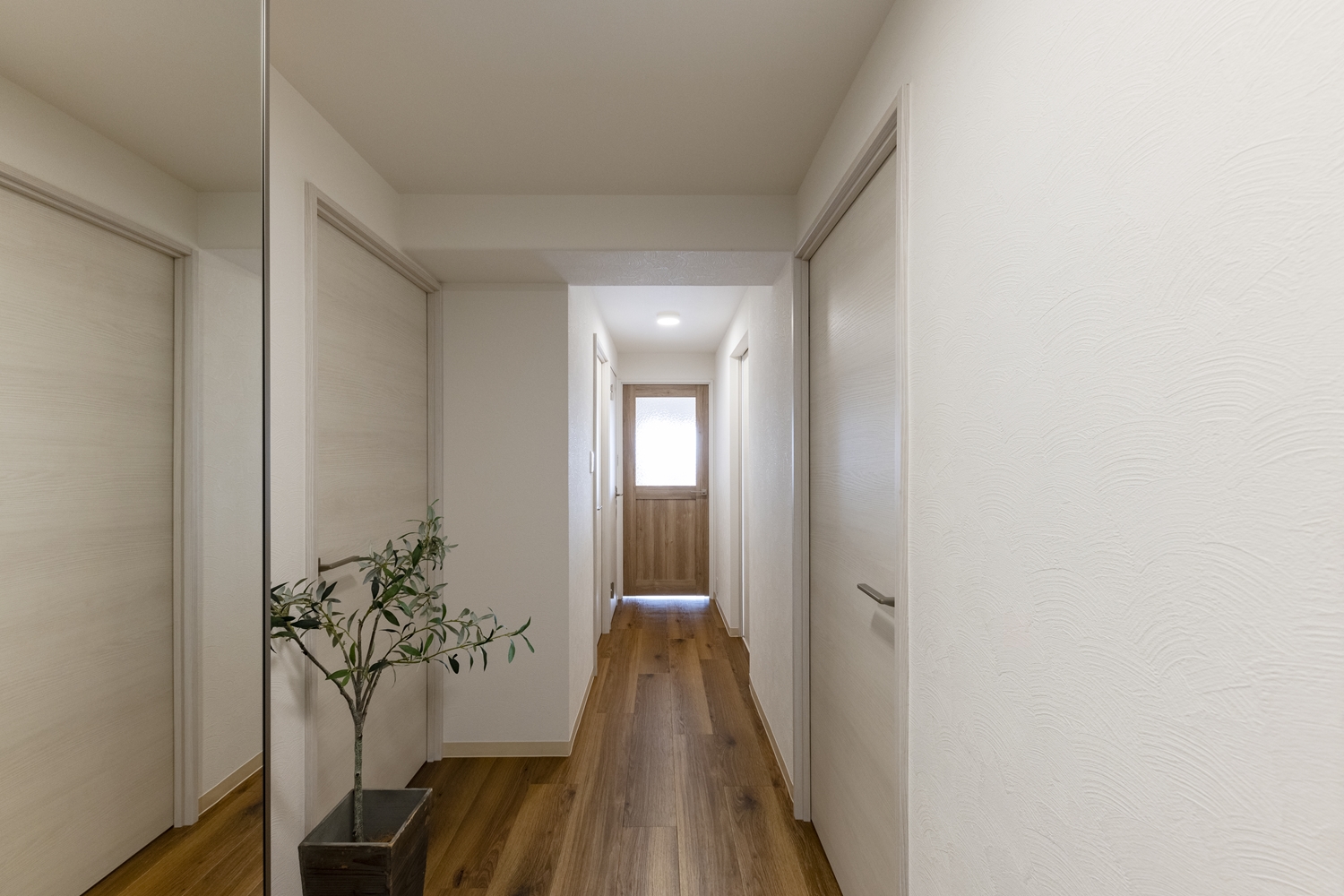 背面にアクセントクロスを取り入れて、シンプルながらも印象的に演出しました。