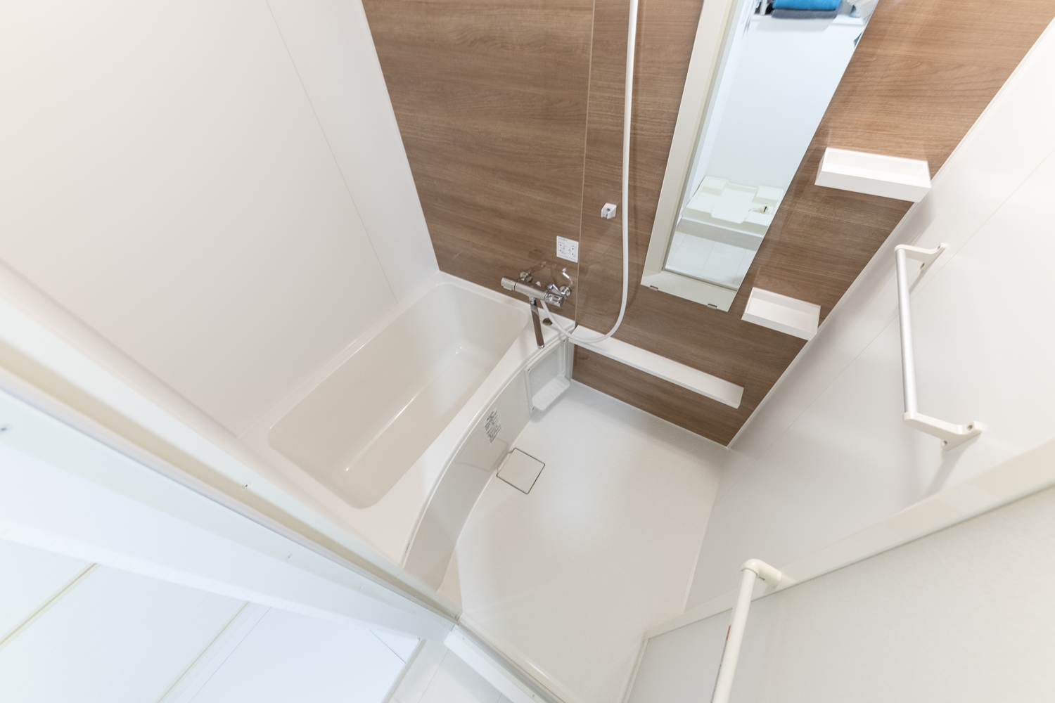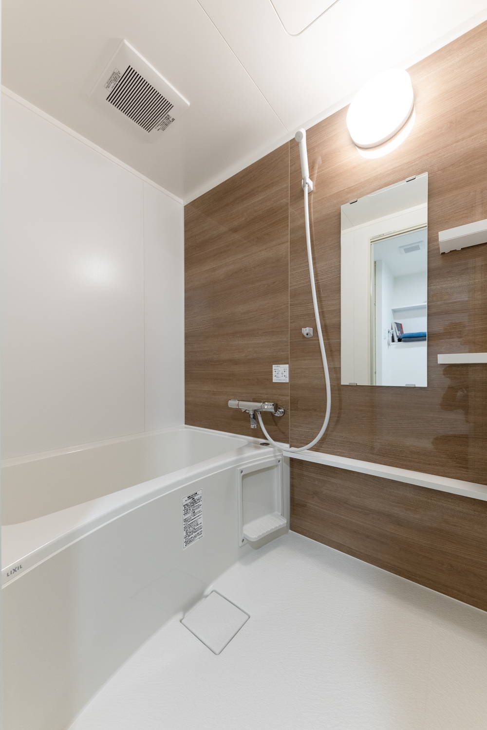 バスルーム/ナチュラルな木目柄のアクセントパネルが癒しの空間を演出します。