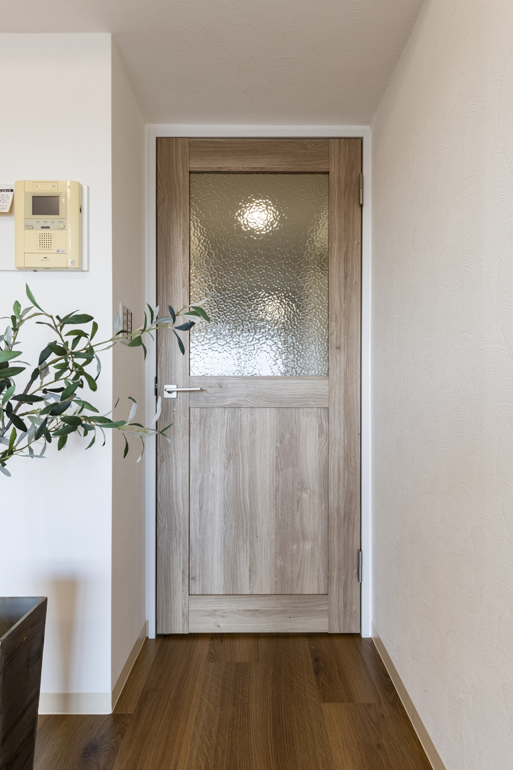 玄関ホール/リビングドアのガラスから光が差し込みます。オーク材の木の温もりを感じる、明るくナチュラルテイストな空間になりました♪