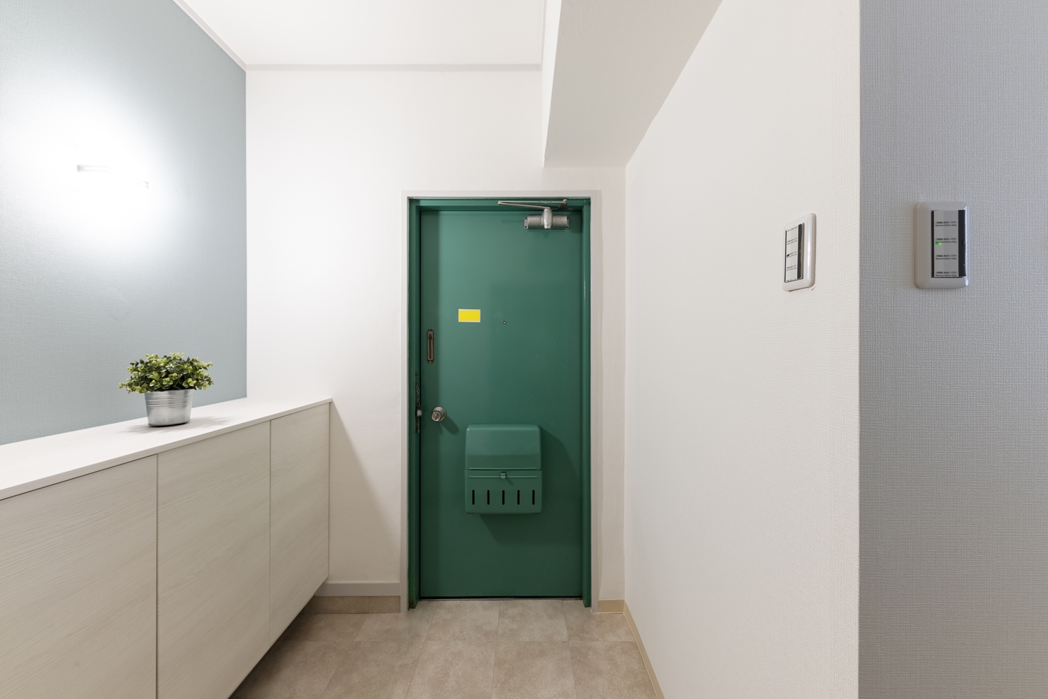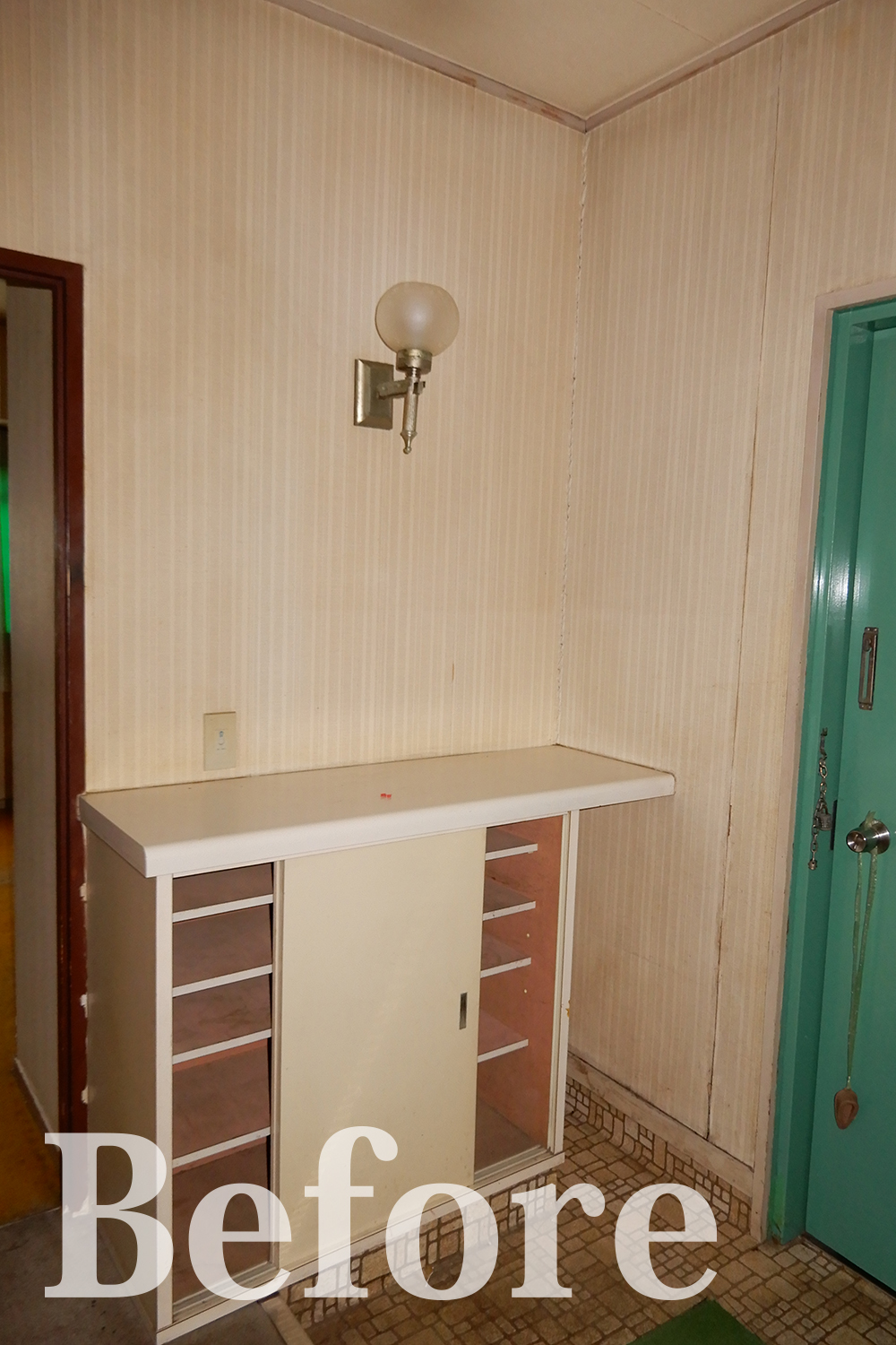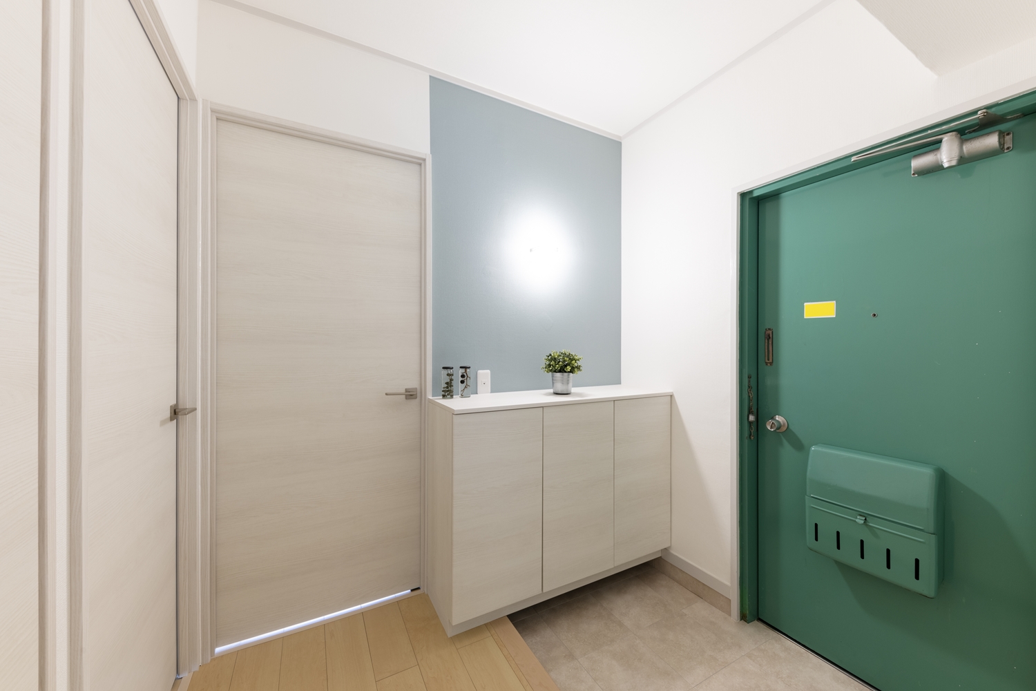 玄関/天井・壁紙、床を貼り替え、照明やシューズBOXを交換しました。アクセントクロスを貼って玄関にワンポイントをプラスさせました。