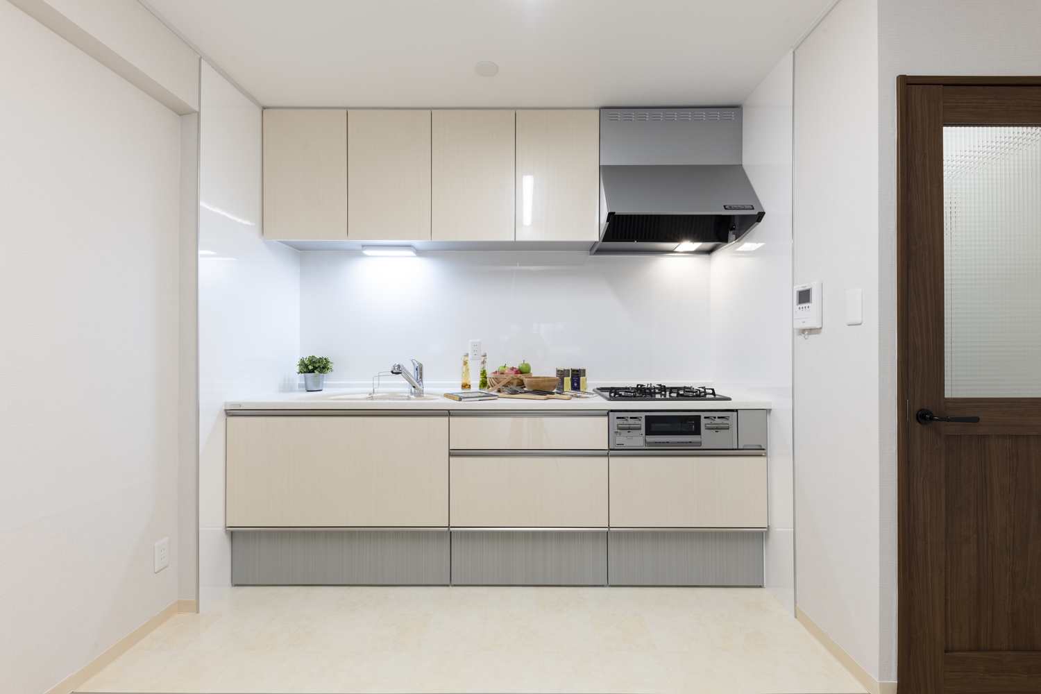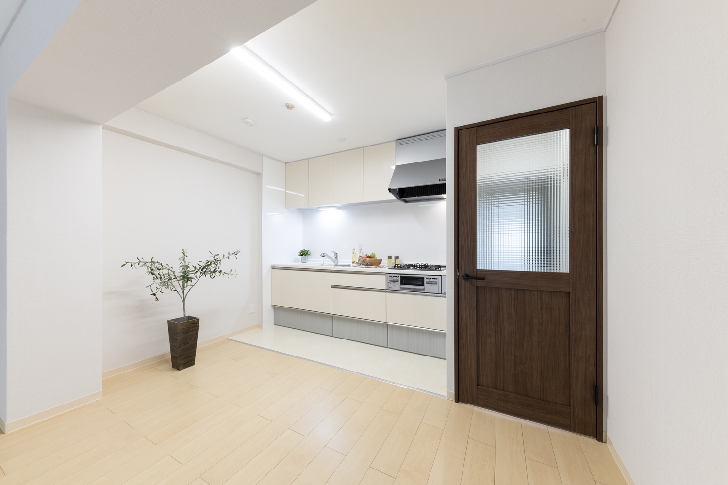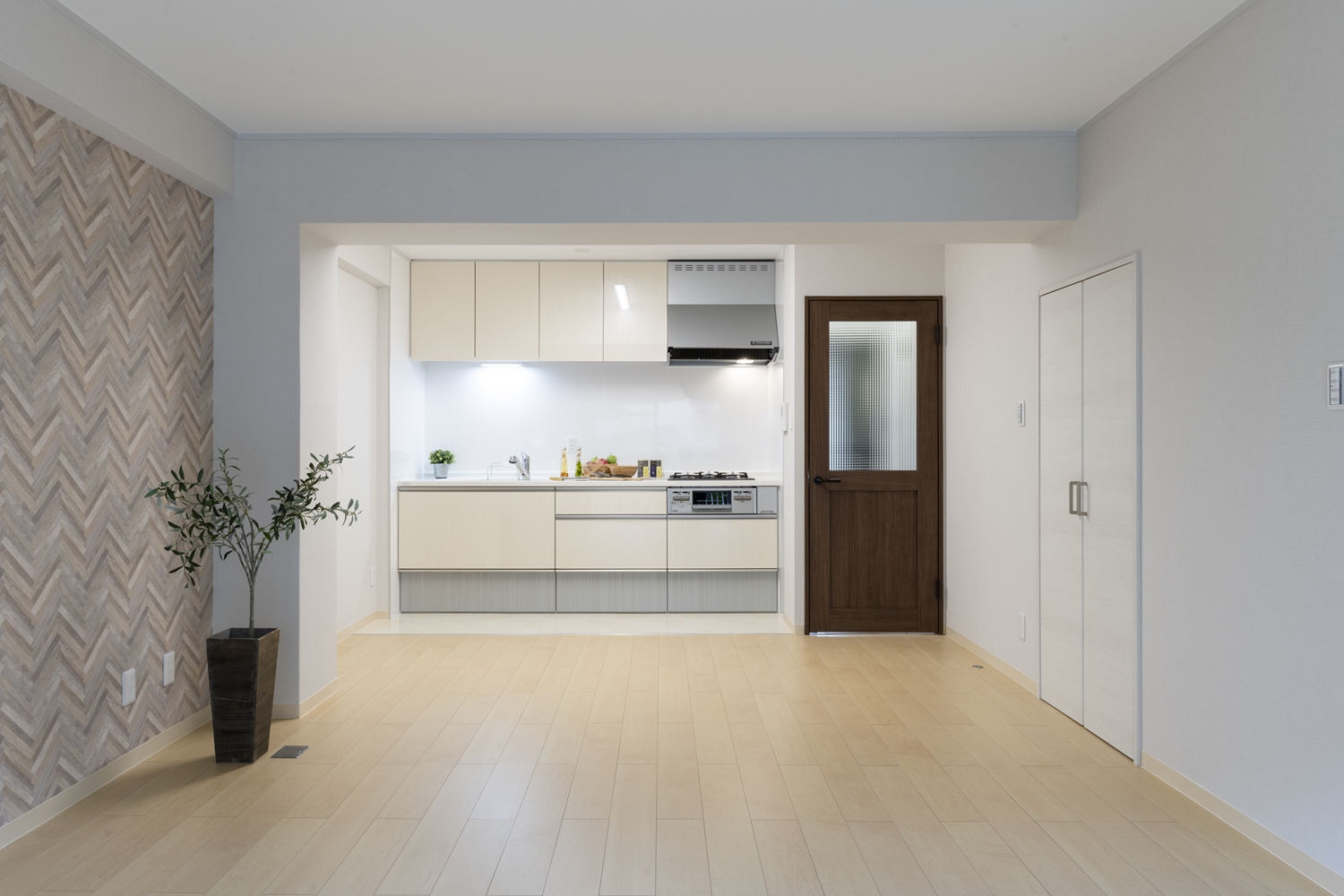 キッチン/天井・壁クロス・フローリングの貼り替え、照明の交換を行い、明るく清潔感のある空間に大変身しました。