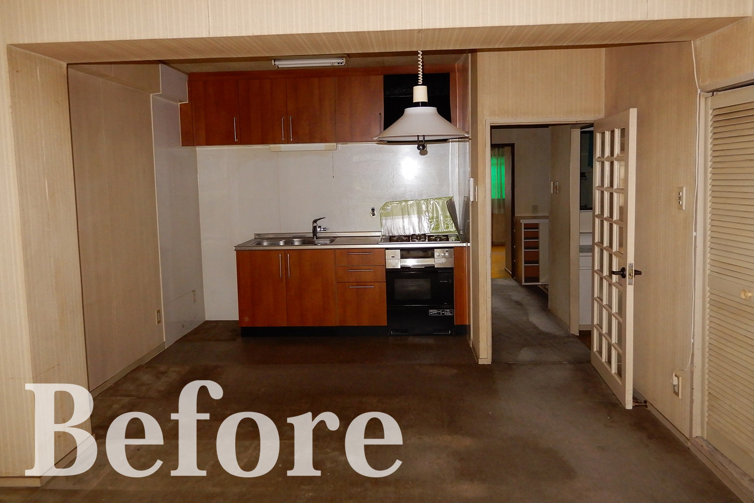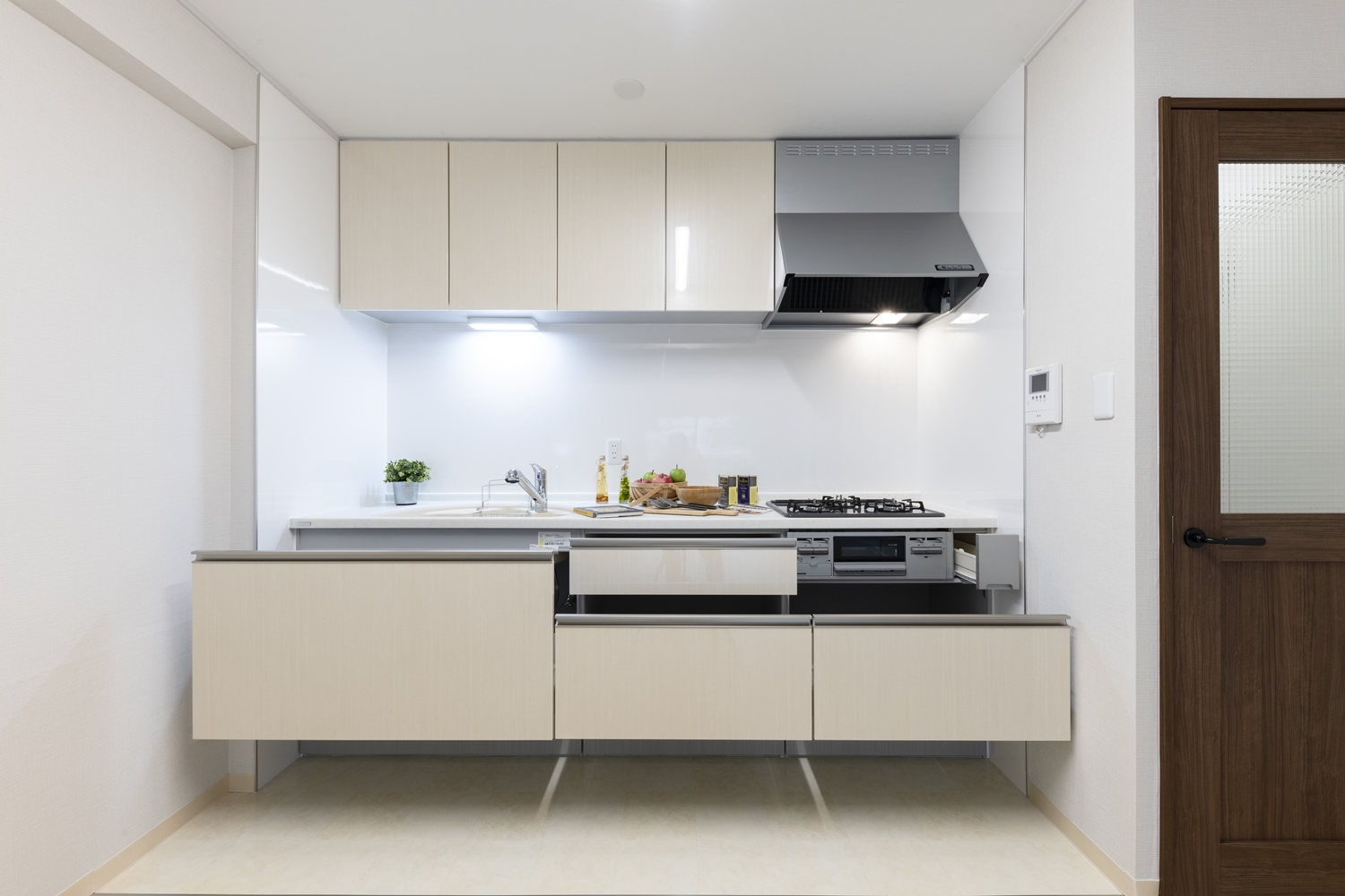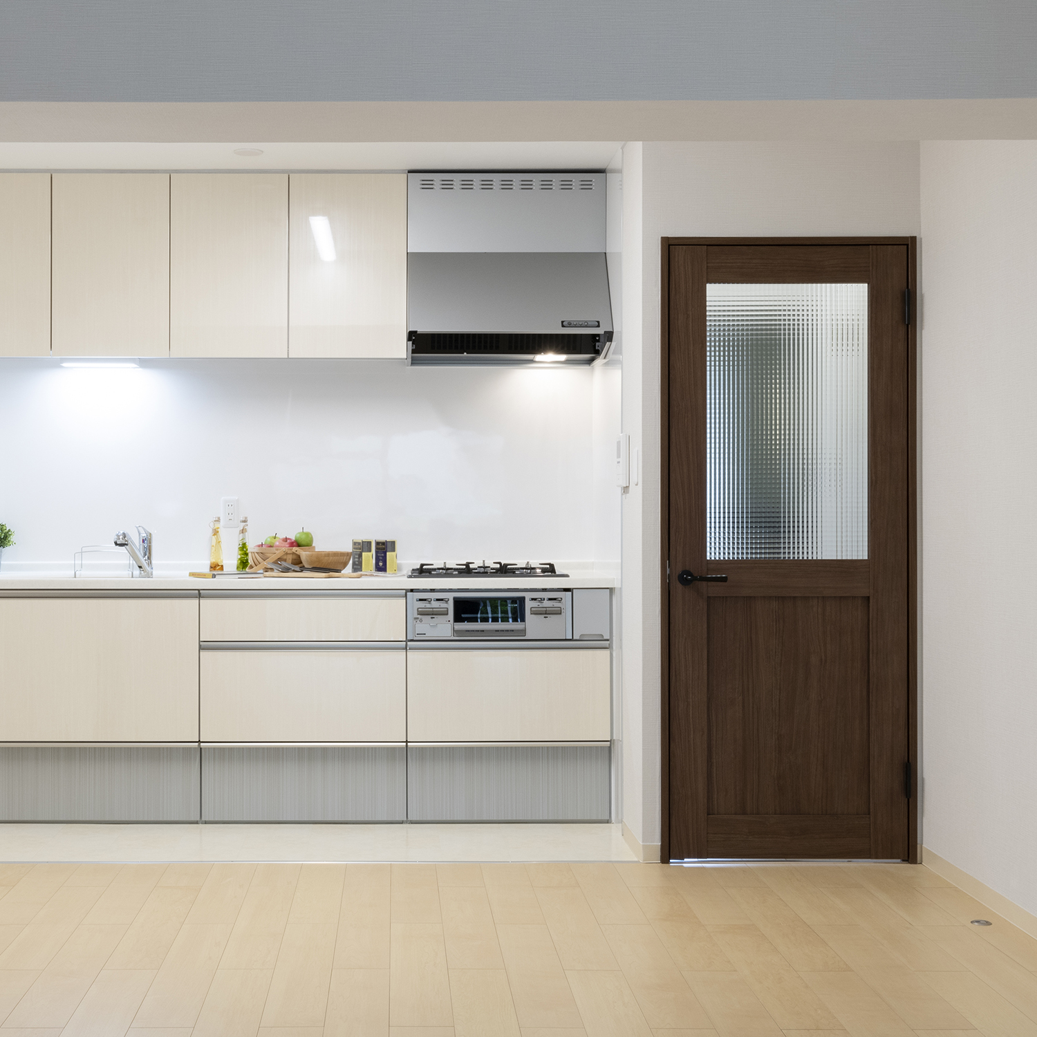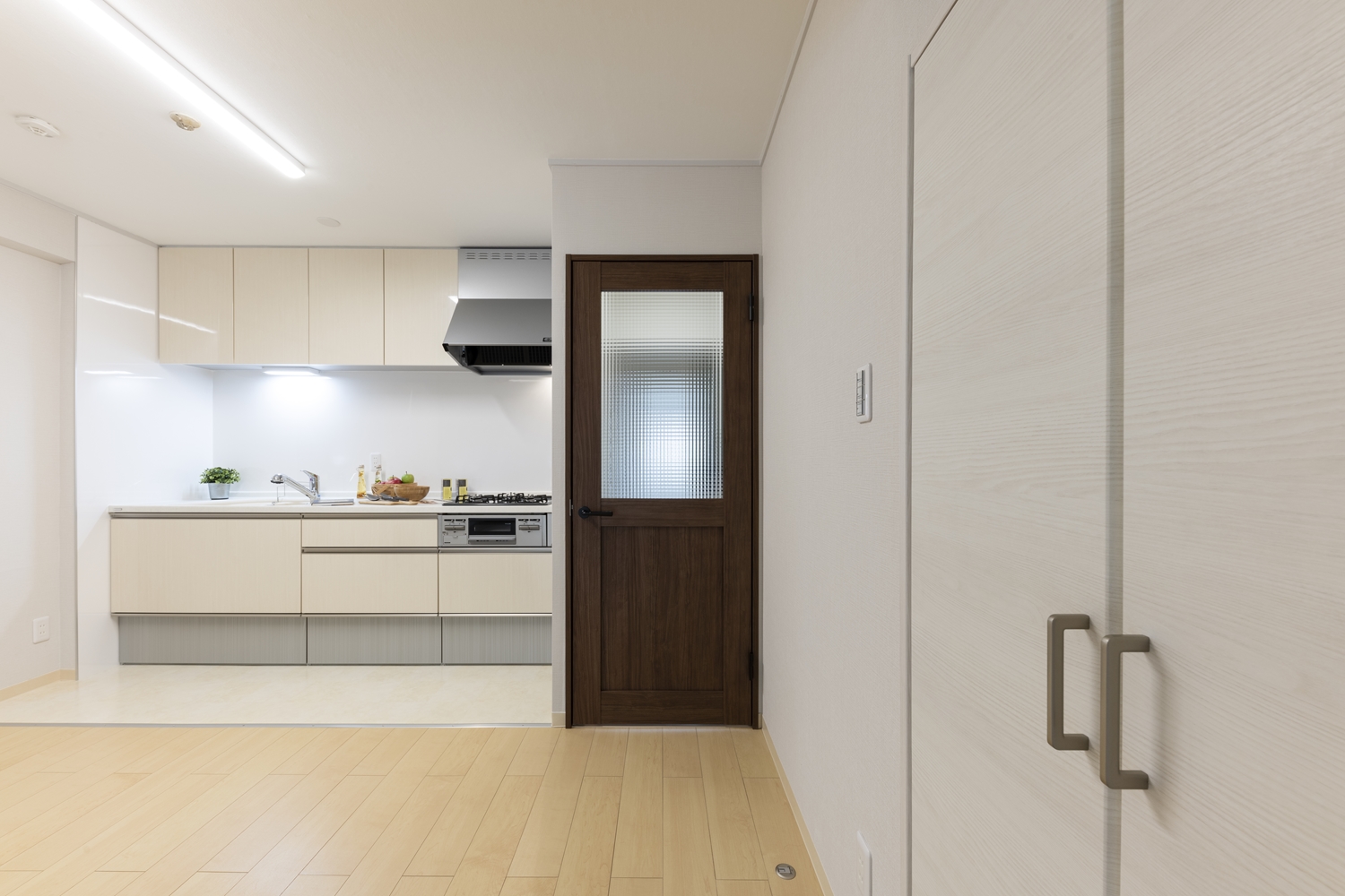 キッチン/天井・壁クロス・フローリングの貼り替え、照明の交換を行い、明るく清潔感のある空間に大変身しました。