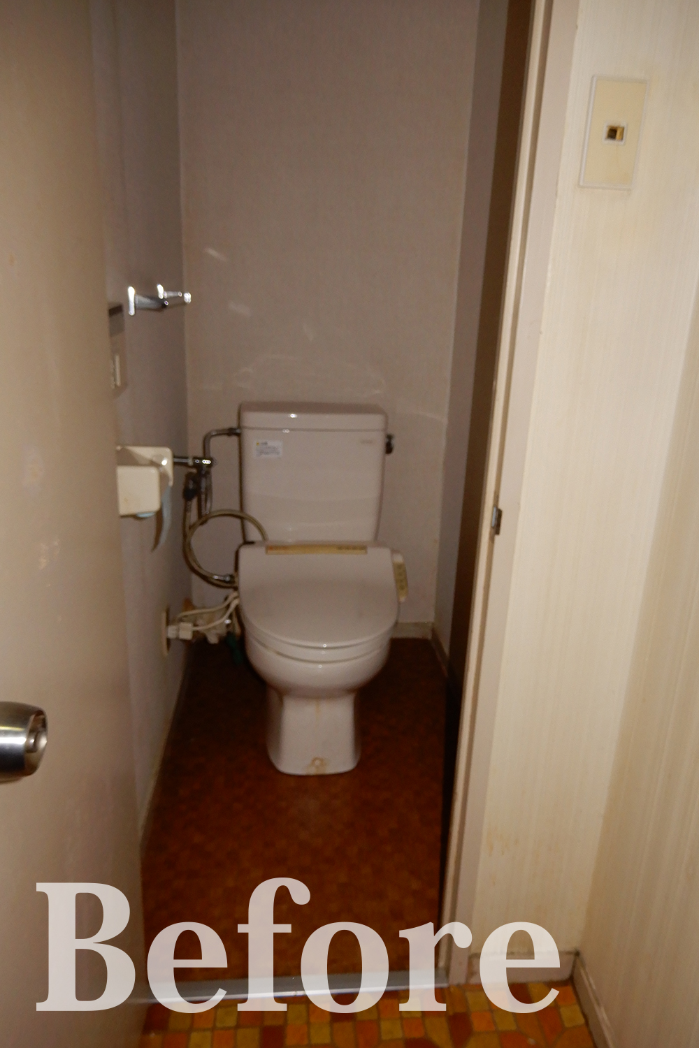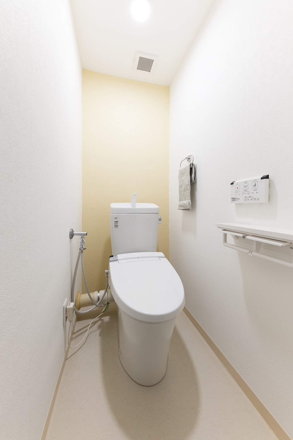 トイレ/床・クロスの全面張替え、便器・照明器具・建具の交換を行いました。背面にあしらったオレンジのアクセントクロスが明るく爽やかな空間を演出。