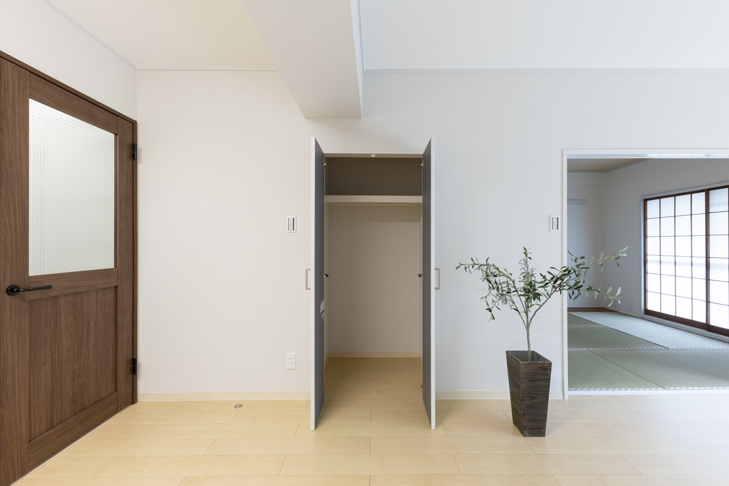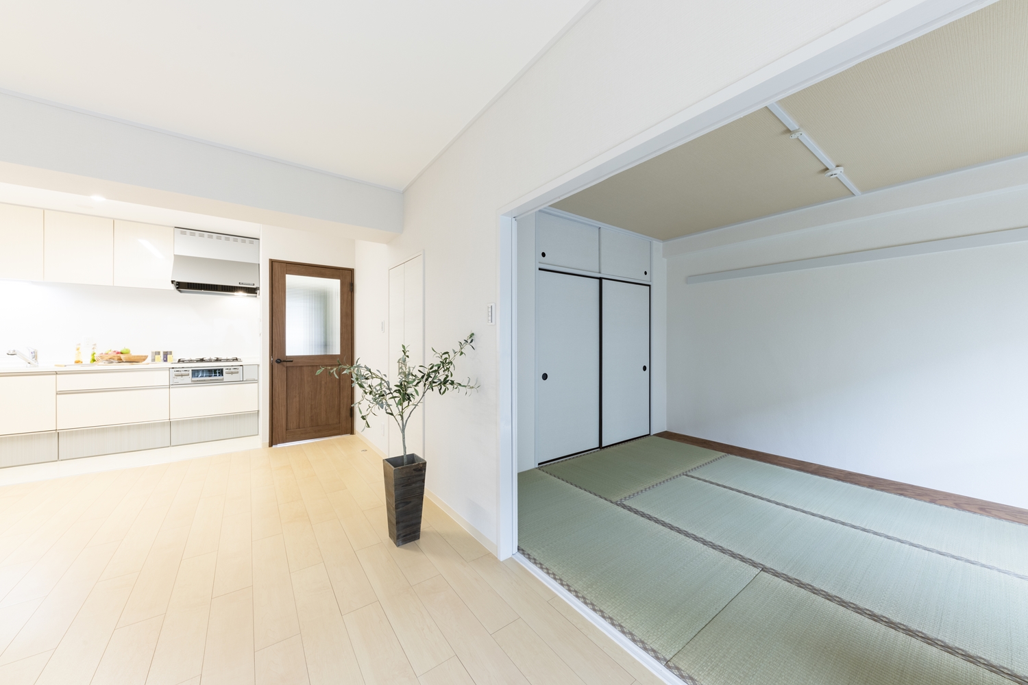 引き戸を開け放てば隣の和室がLDKと違和感なく調和し、開放感いっぱいの大空間に。