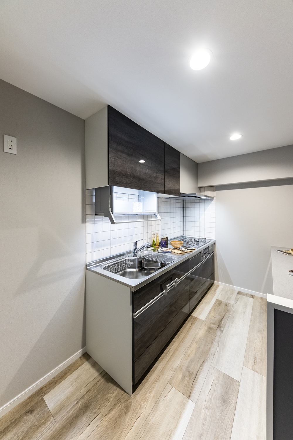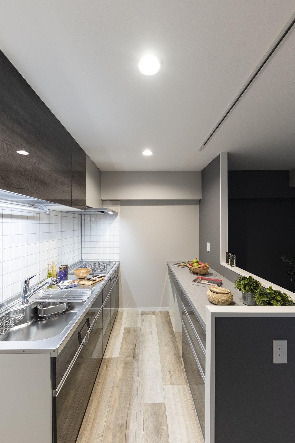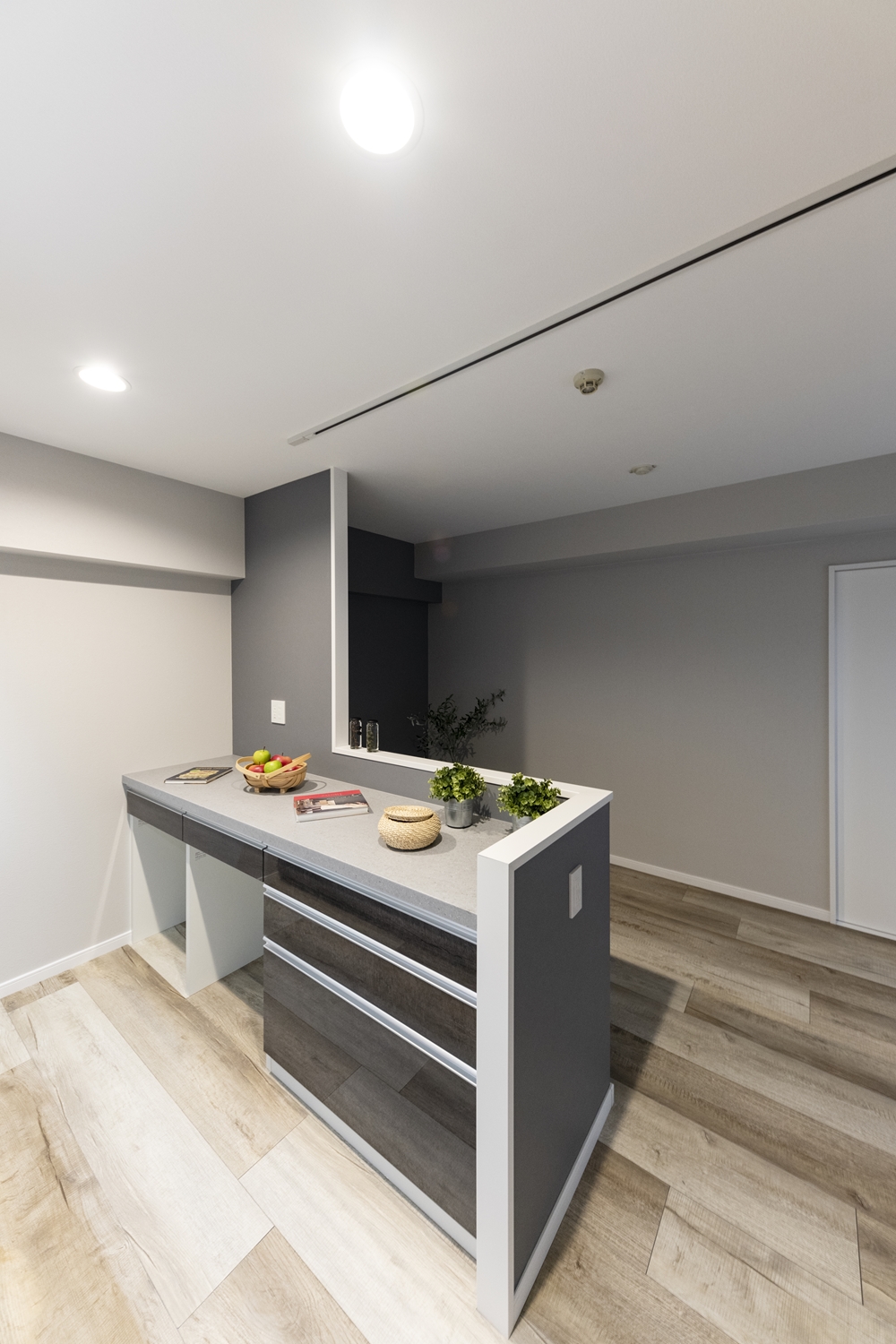 リビングダイニング/キッチンカウンター周りには、濃いめのグレーのクロスをアクセントにして、生活感を感じさせないモノトーンスタイルに。