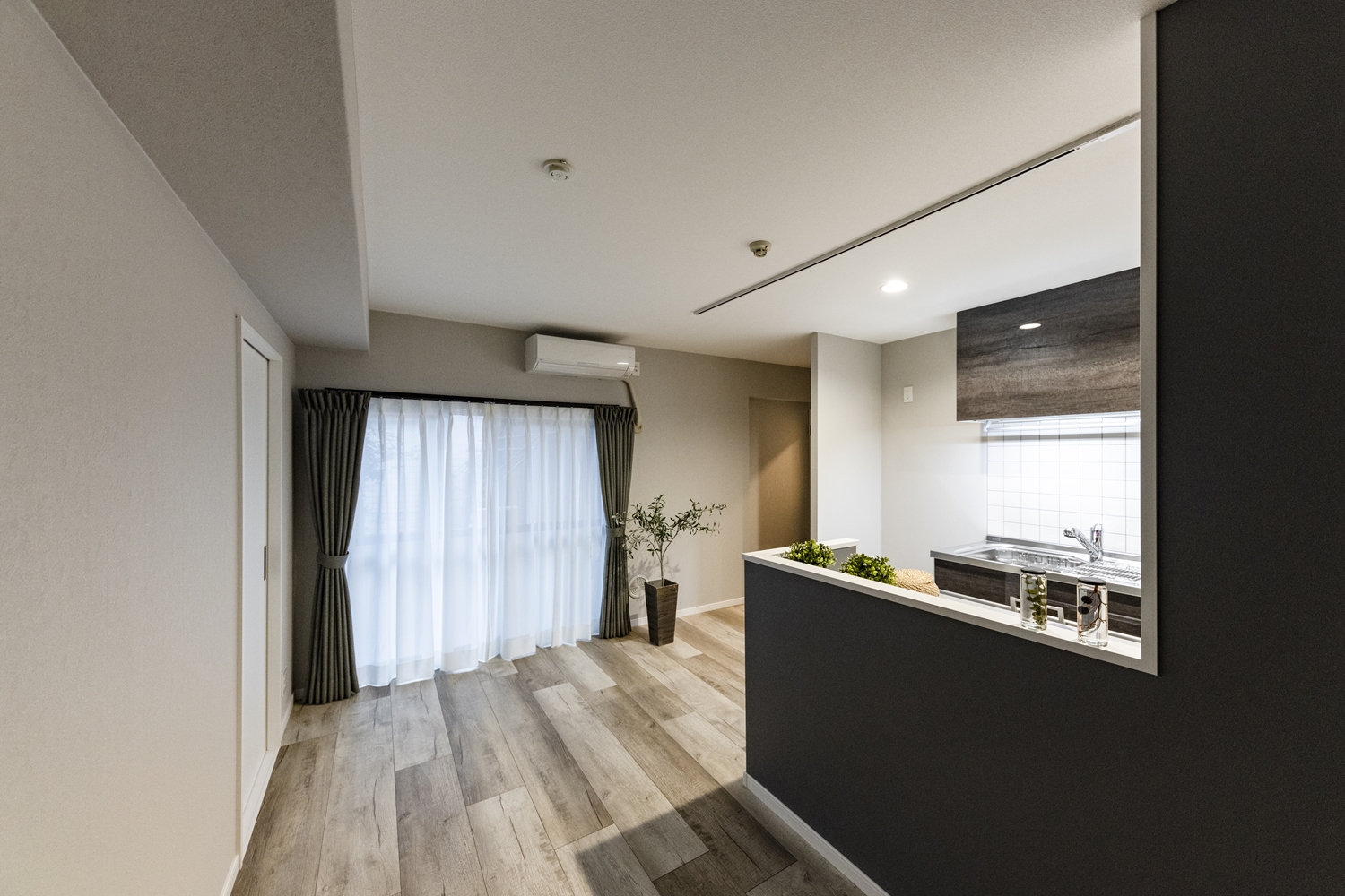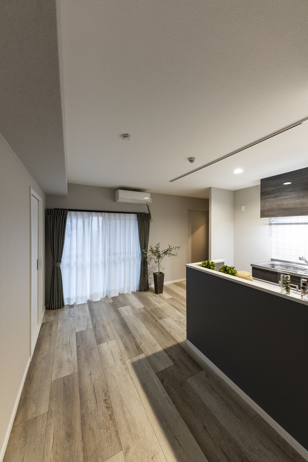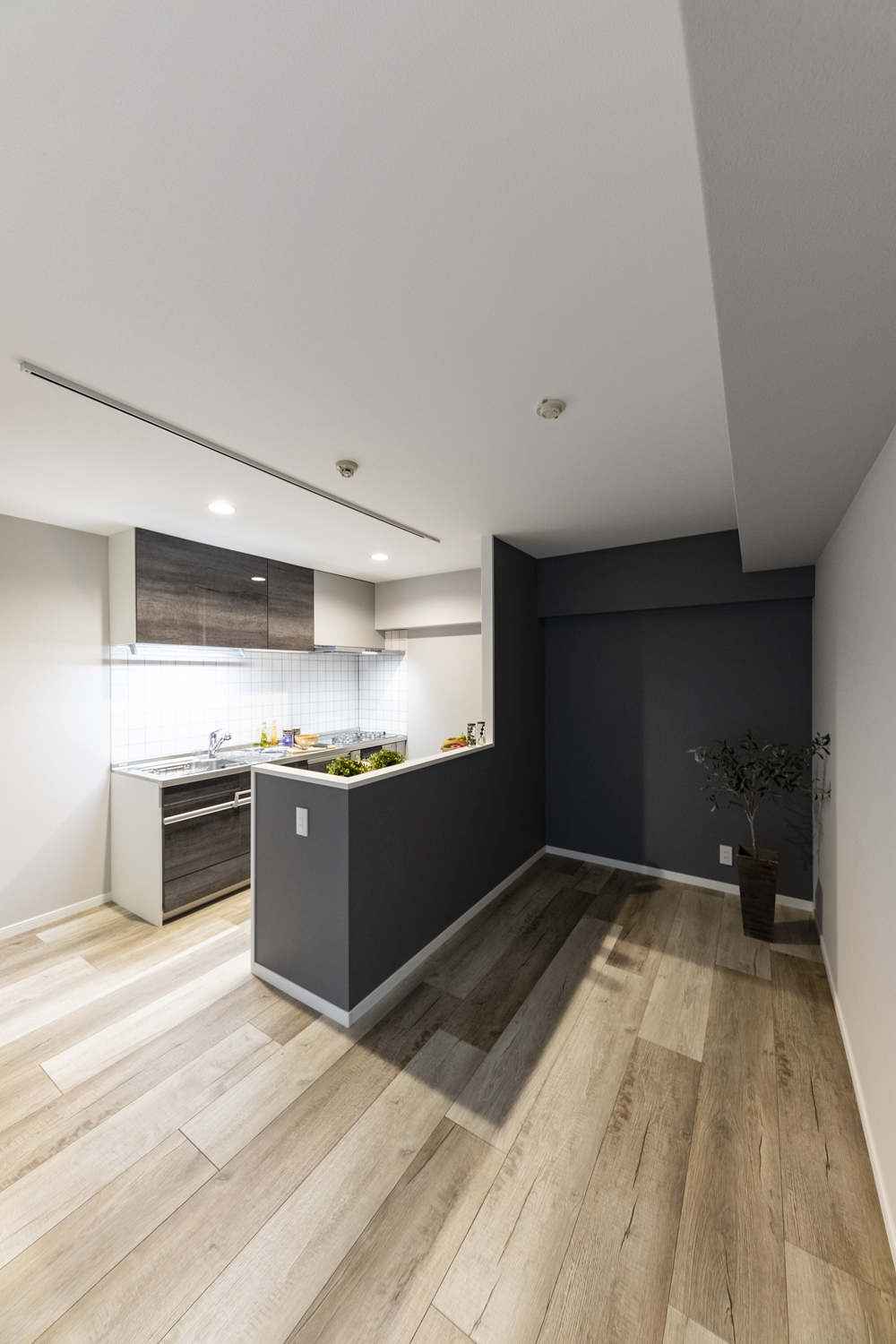 リビングダイニング/キッチンカウンター周りには、濃いめのグレーのクロスをアクセントにして、生活感を感じさせないモノトーンスタイルに。