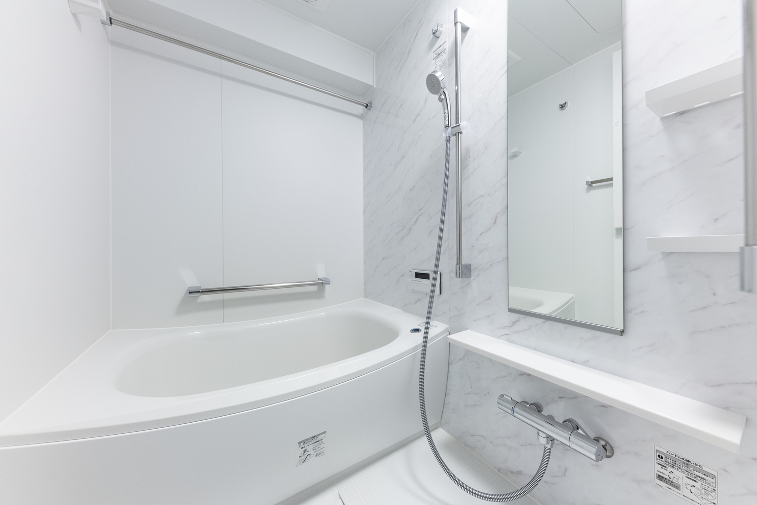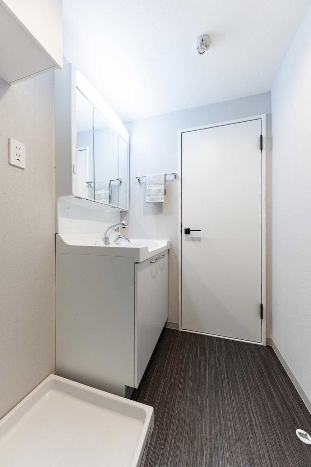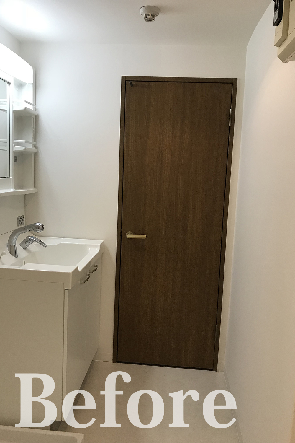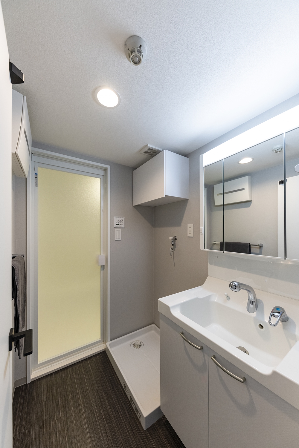 洗面室/洗面化粧台の上部を全面ミラータイプの収納に交換。小物が中にしまえて機能美も充実!床はビターカラーの木目調床材に張り替え、ホテルライクな空間を演出。