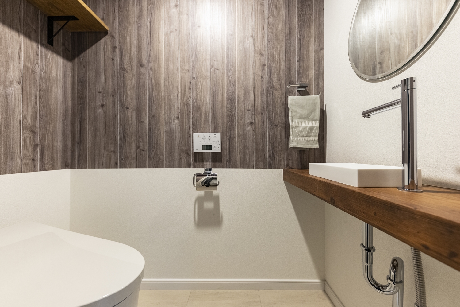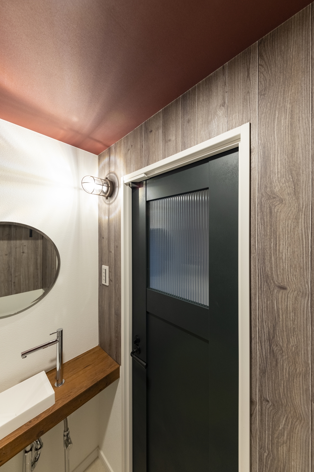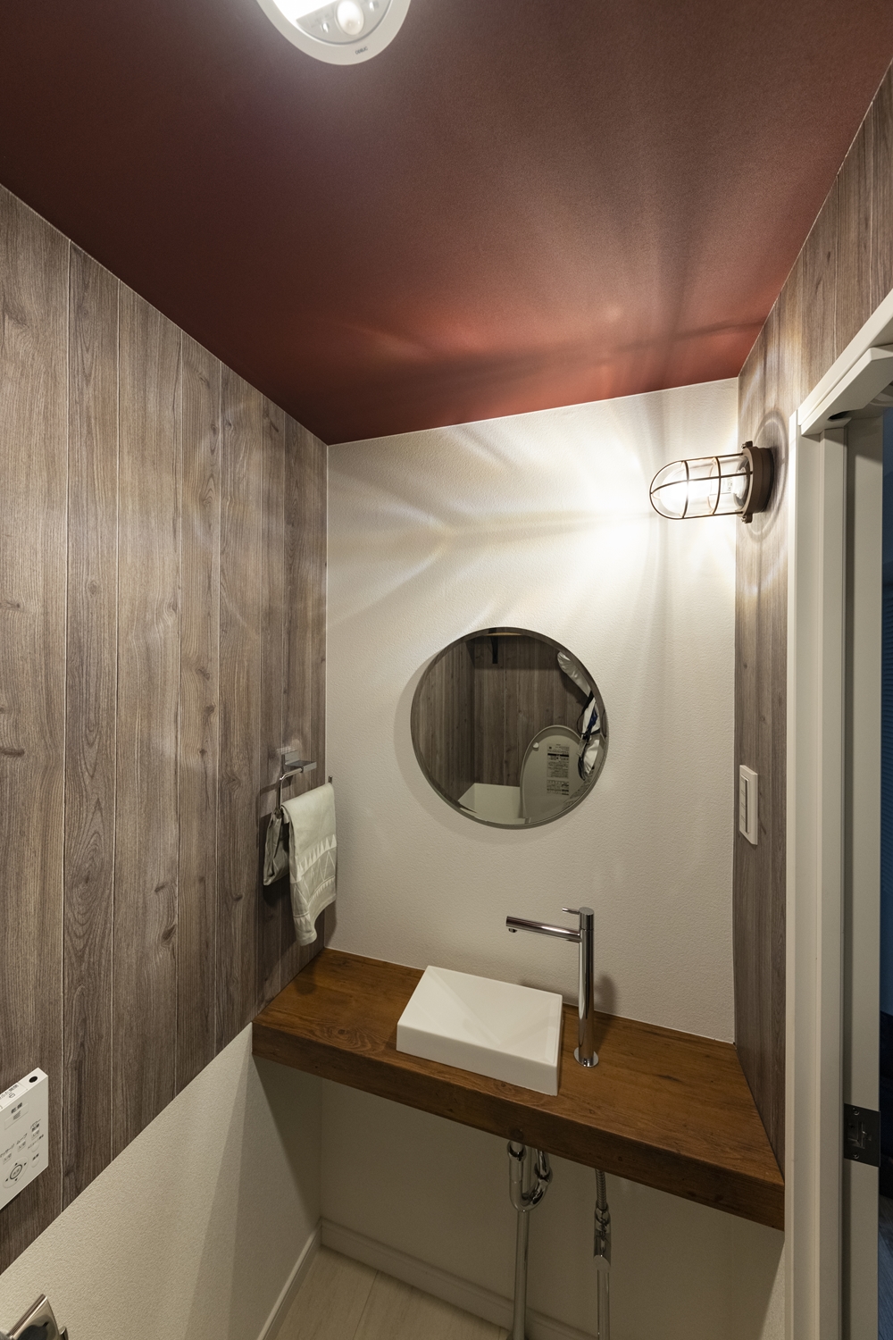 トイレ/木目調と無地のクロスを上下に張り分けた壁や、ボルドー色のクロスを施した天井、丸いミラーが、個性的で遊び心のある空間を演出。独立タイプの手洗いを設置してお客様をオモテナシします!