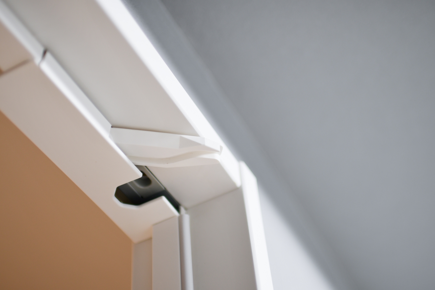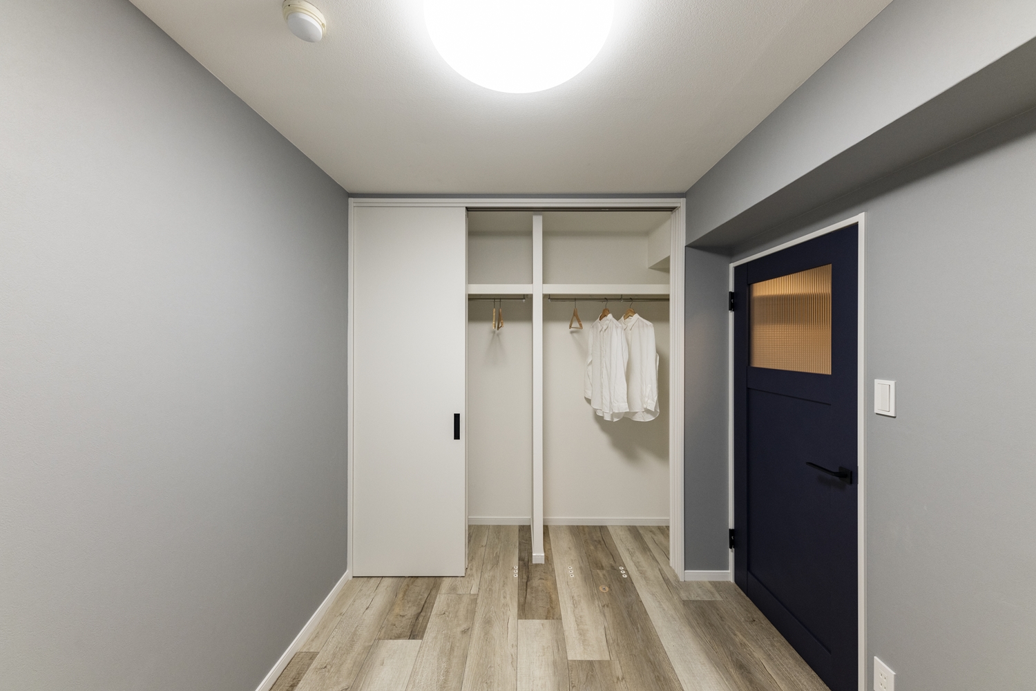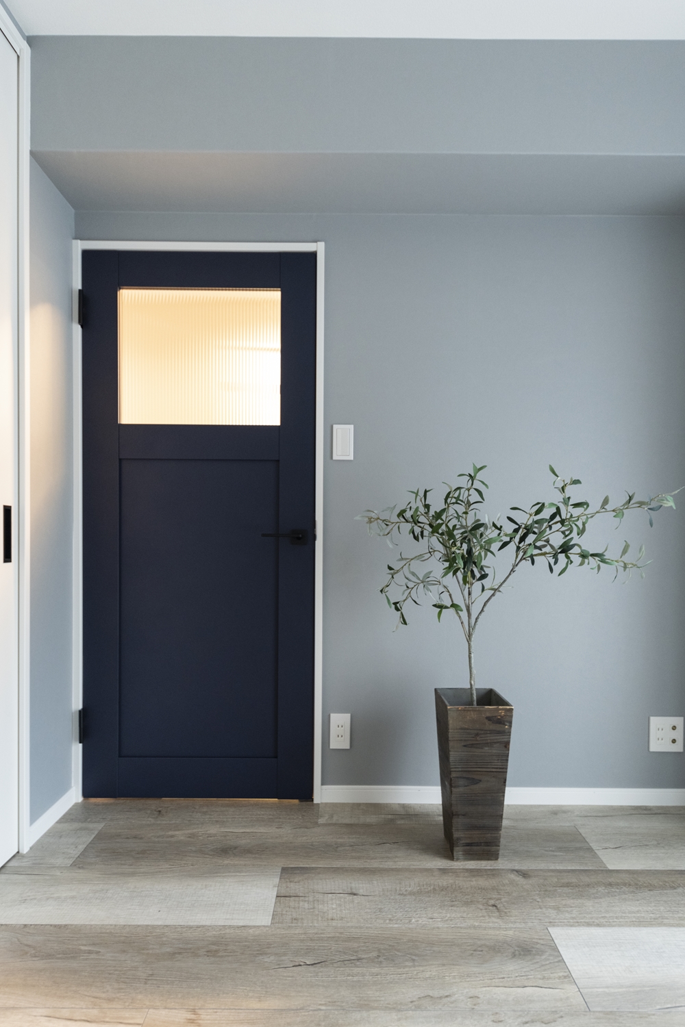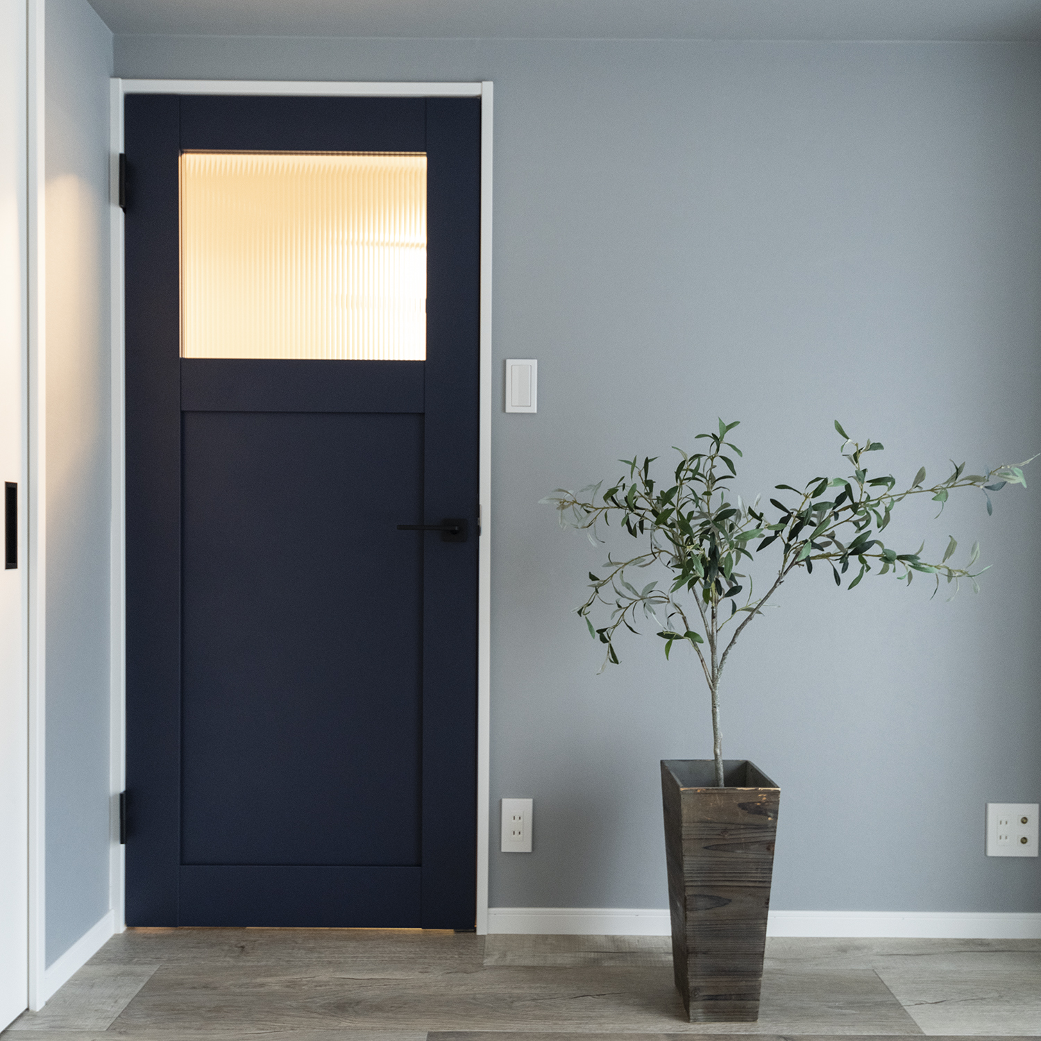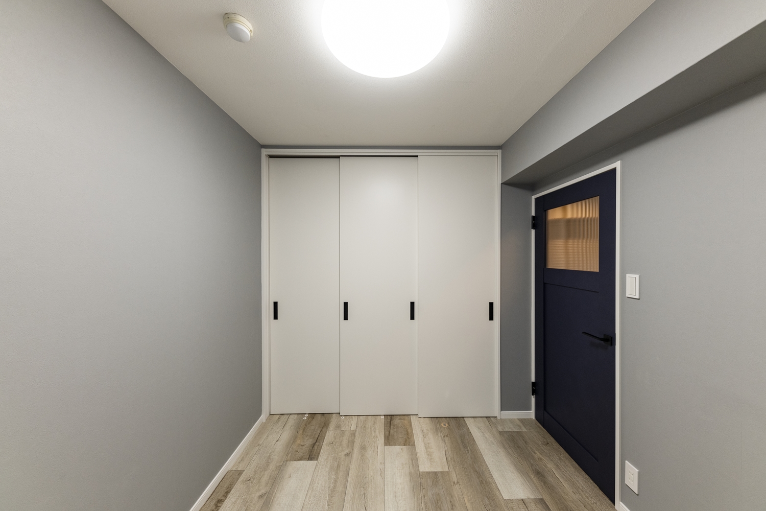 洋室/シャープなレトロ調ガラスと、ペンキをローラーで塗った様なマットな質感のネイビーブルーのドアが、グレーの壁に映えてお部屋のアクセントに。