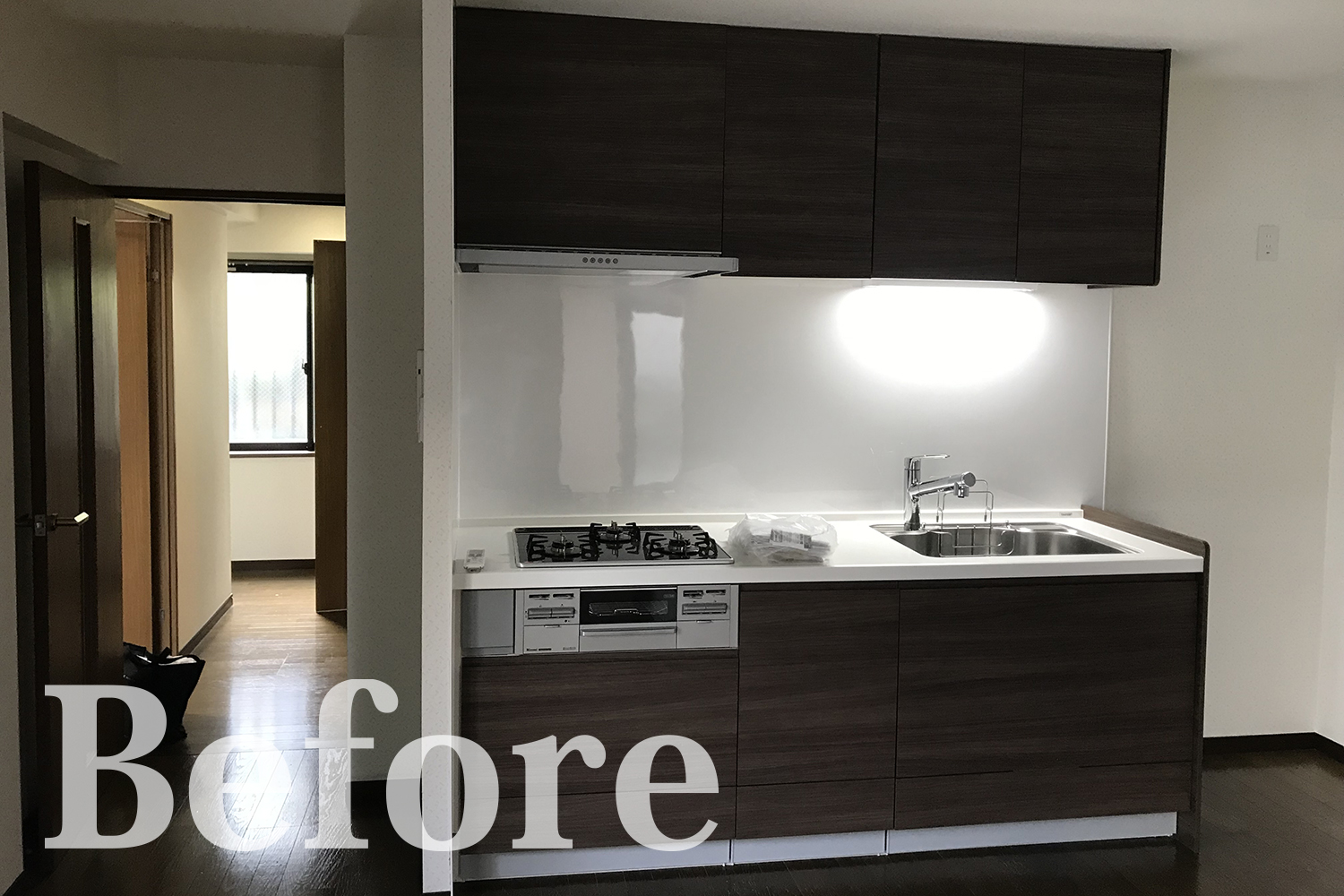 キッチン/冷蔵庫置き場を手前に配置し、キッチンの位置をずらし、シンクとコンロを左右入れ替えました。
