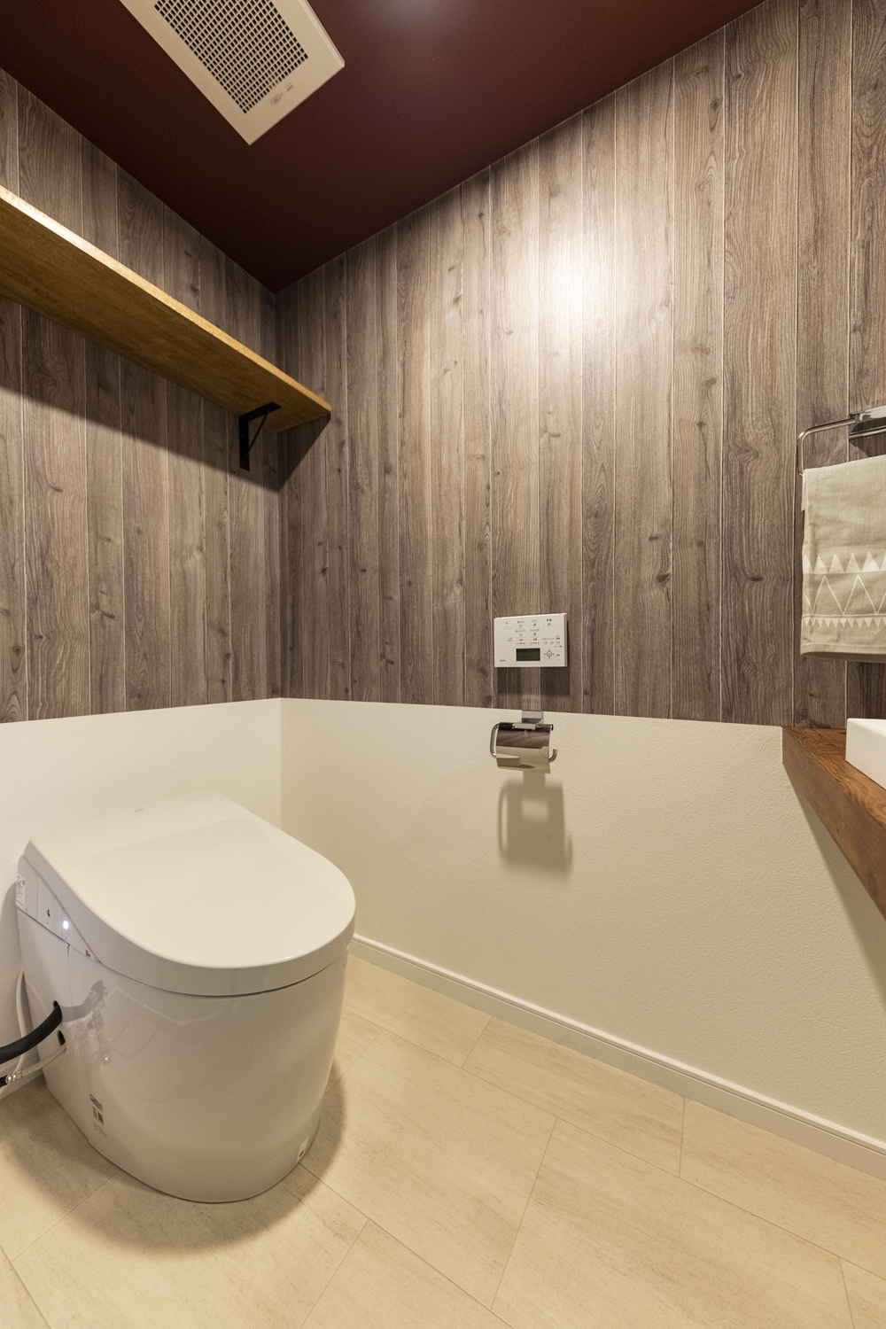 トイレ/木目調と無地のクロスを上下に張り分けた壁や、ボルドー色のクロスを施した天井が、個性的で遊び心のある空間を演出。カウンター部分は小物のディスプレイも楽しめるスペースに大変身しました♪