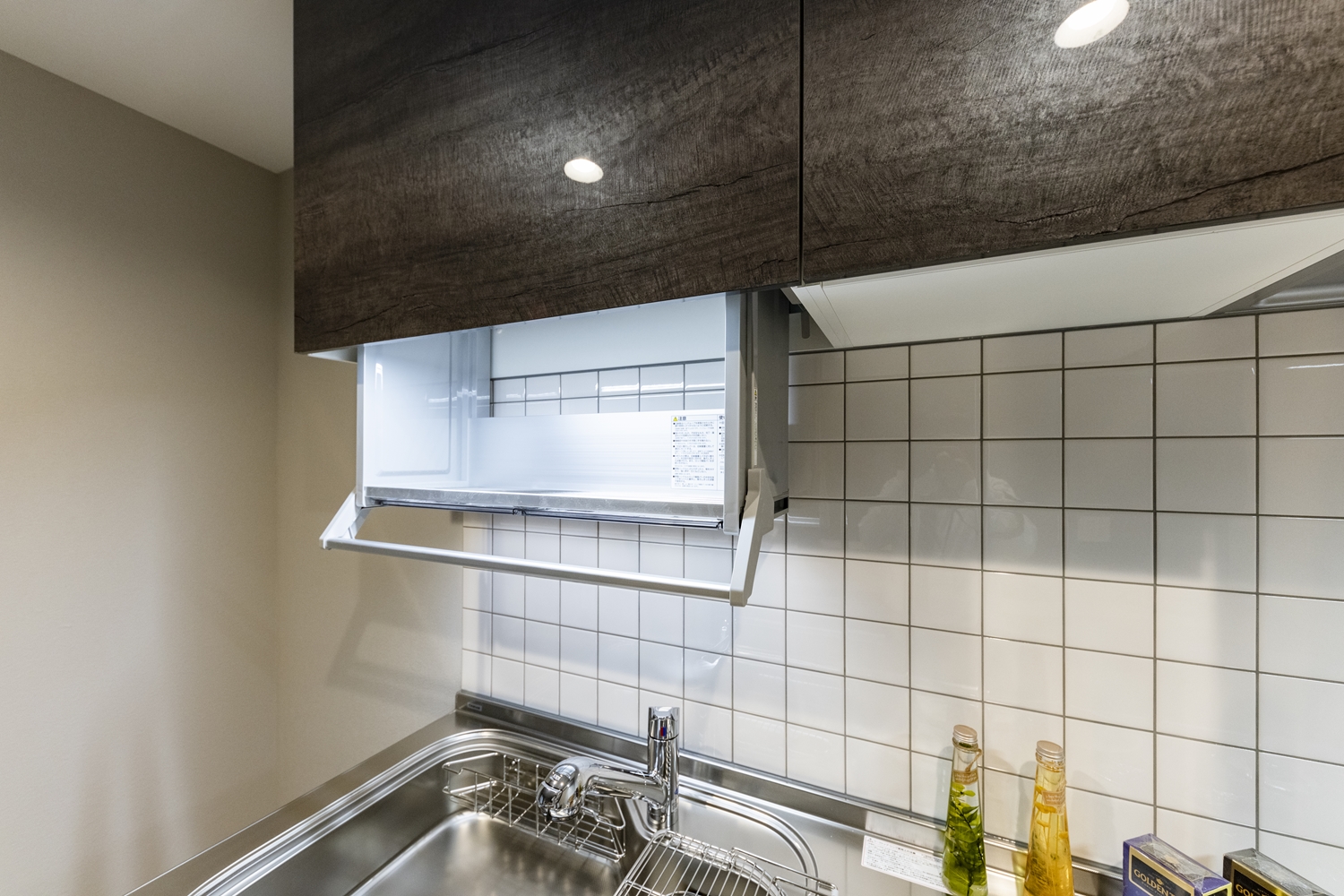 キッチンの上部を上手に使える吊戸棚タイプの収納。昇降ができ、使う時は目の高さに、使わない時はキャビネットに納まります。