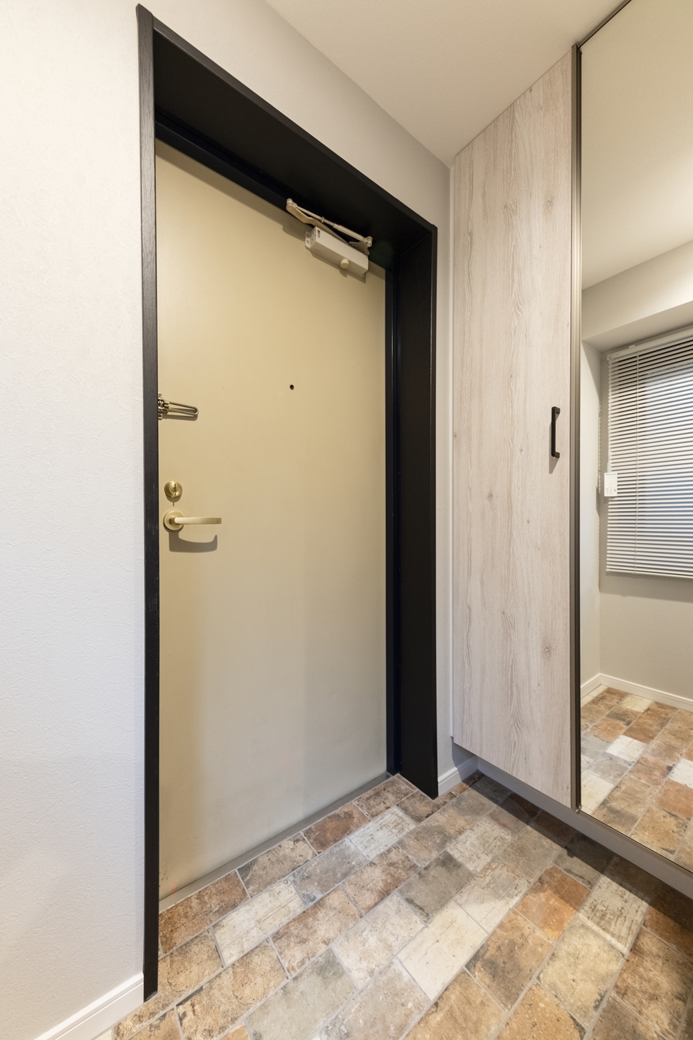 玄関/ヴィンテージ調のおしゃれなタイルを張り、靴を履いて全身をチェックできる、ミラー付のシューズボックスを設置しました。