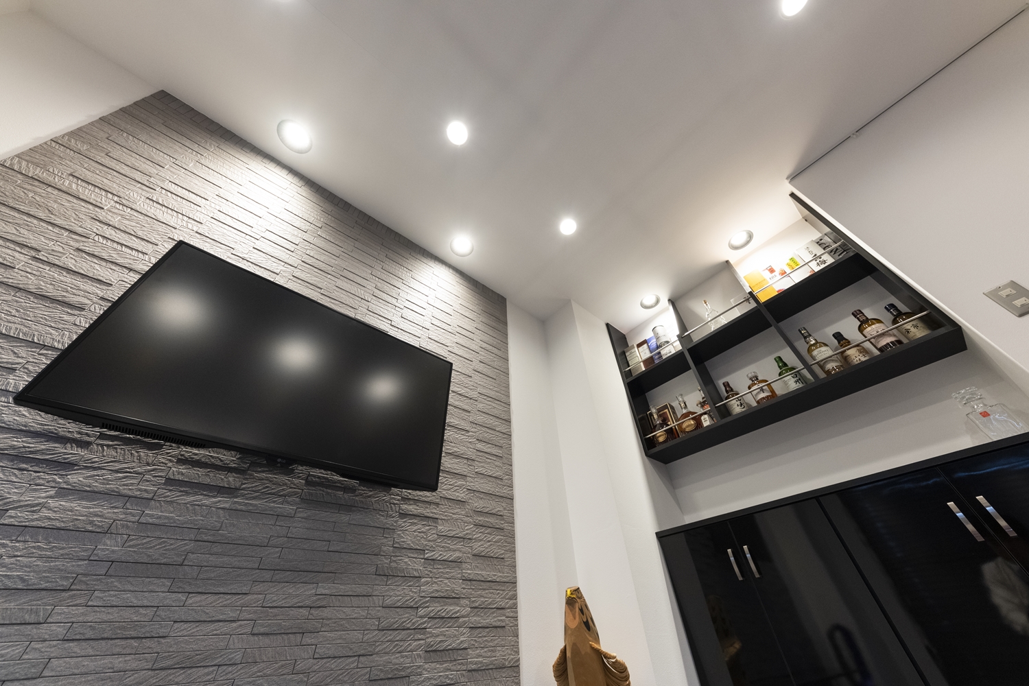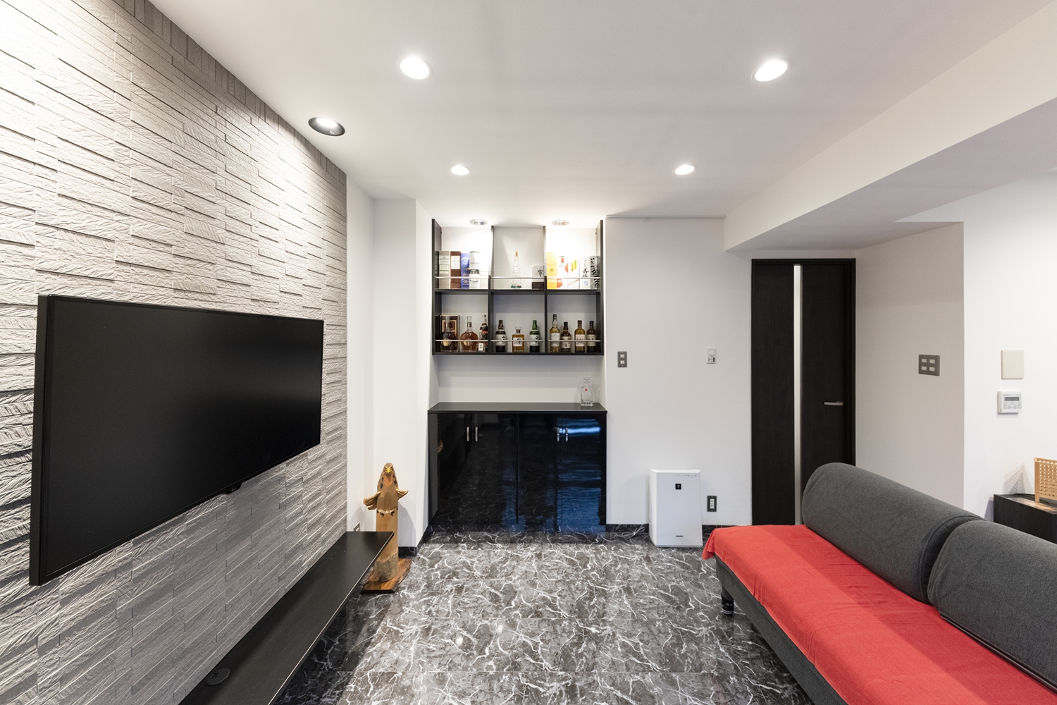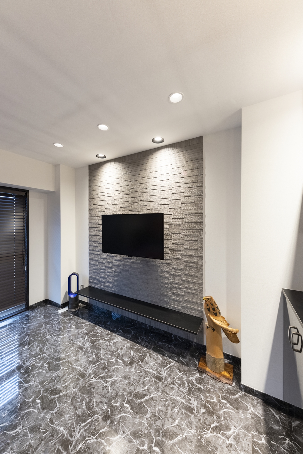 TVスペースに空気を美しく整えるインテリア壁材「エコカラット」を施しました。贅沢感のあるオシャレな空間を演出します。