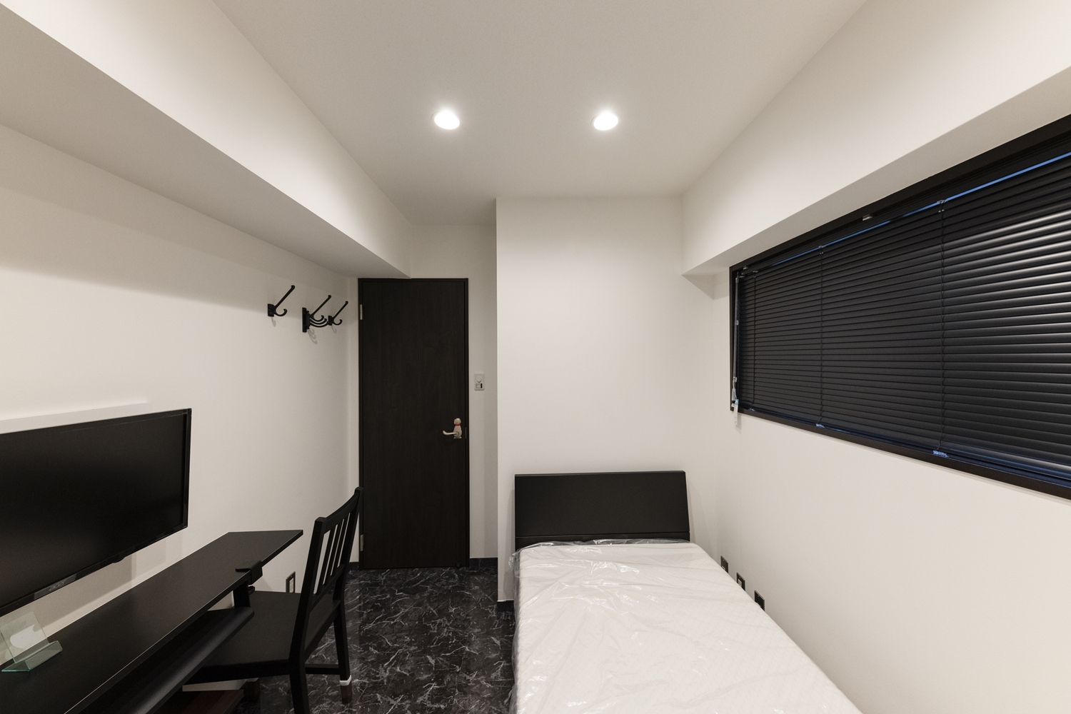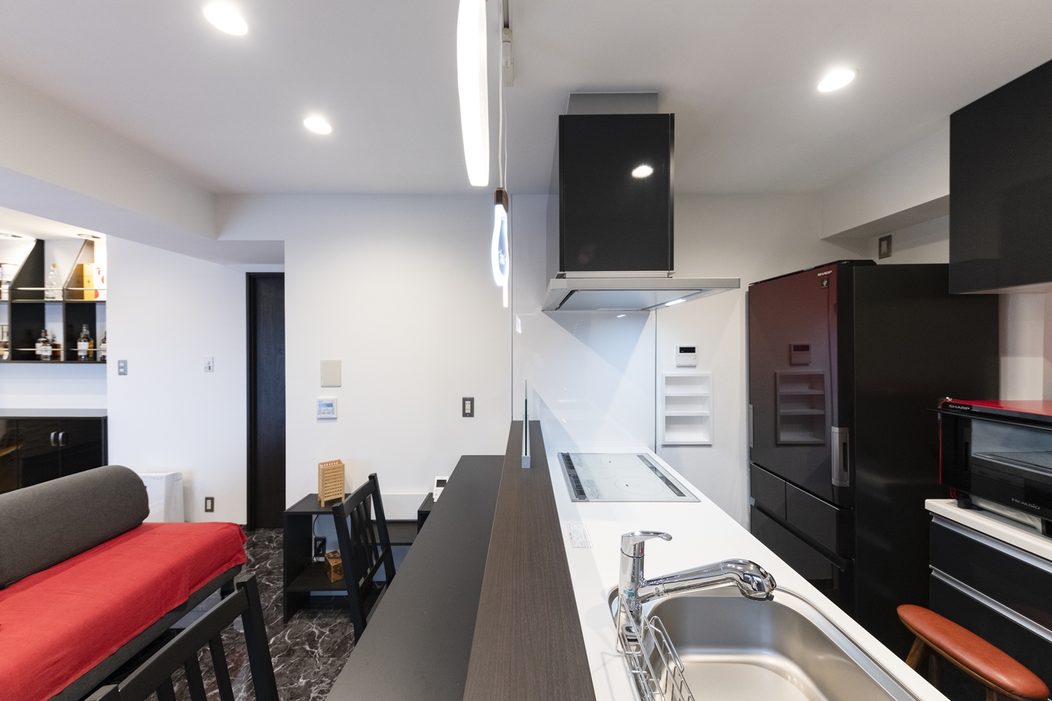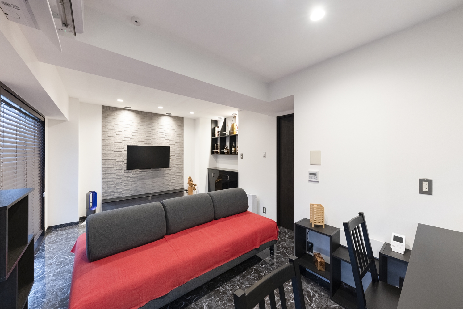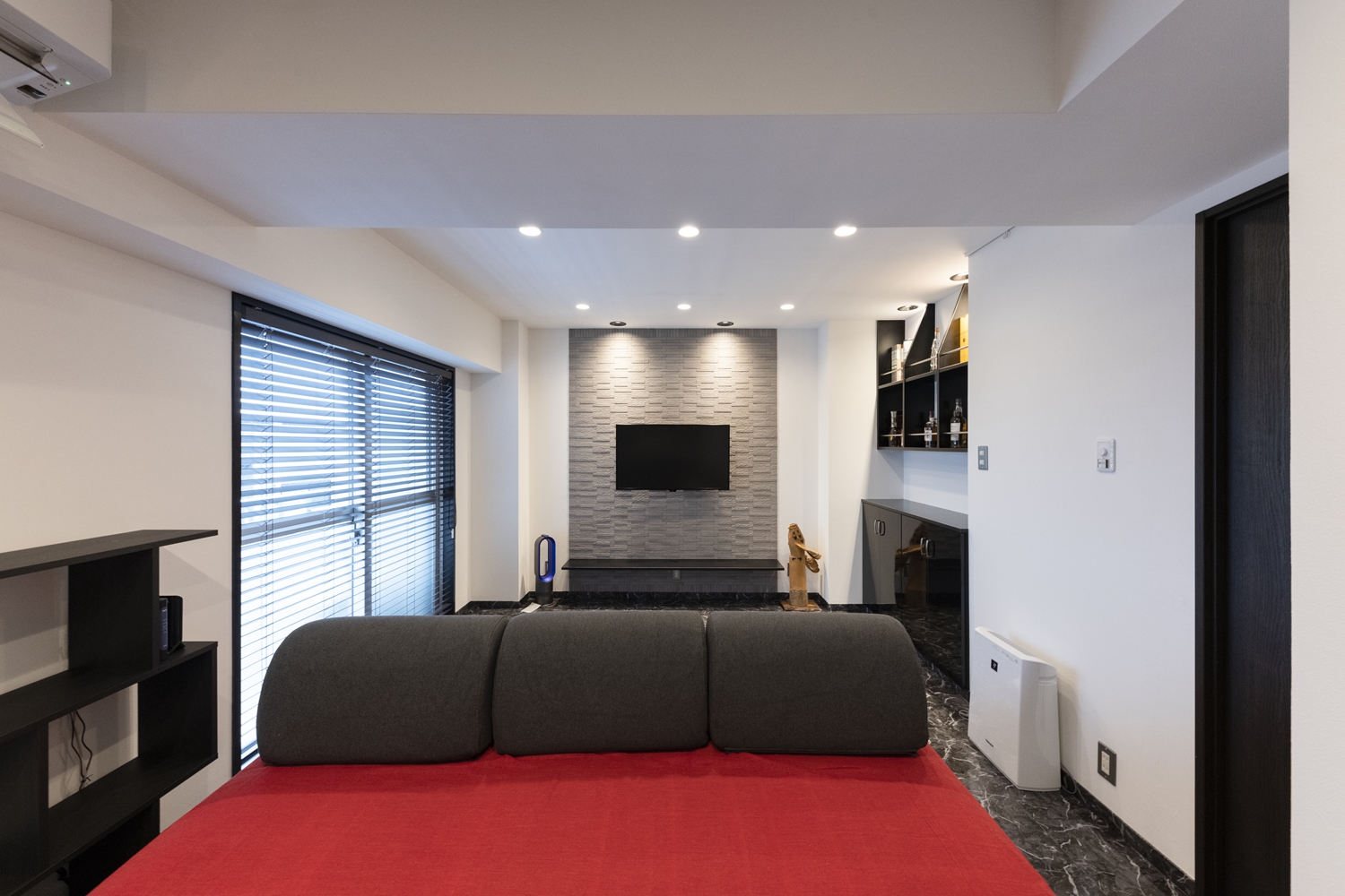 全室、天井・壁のクロス・床材の張り替えや上張り、照明や建具・設備の交換、新規設置を行いました。白と黒をベースにして、非日常的で生活感の無い、贅沢な空間を演出。