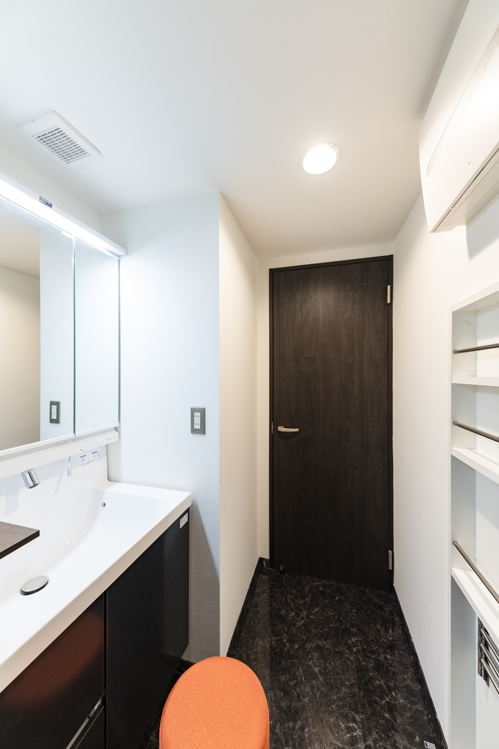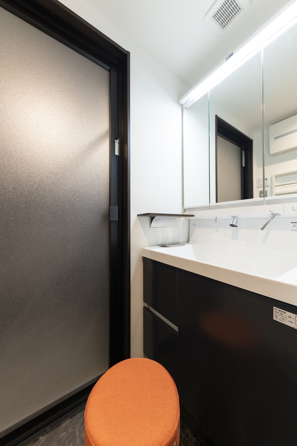 洗面室/洗面化粧台・照明の交換、クロスの貼り替え、床材の上張りを行い、白と黒をベースにしたホテルライクな空間に仕上がりました。