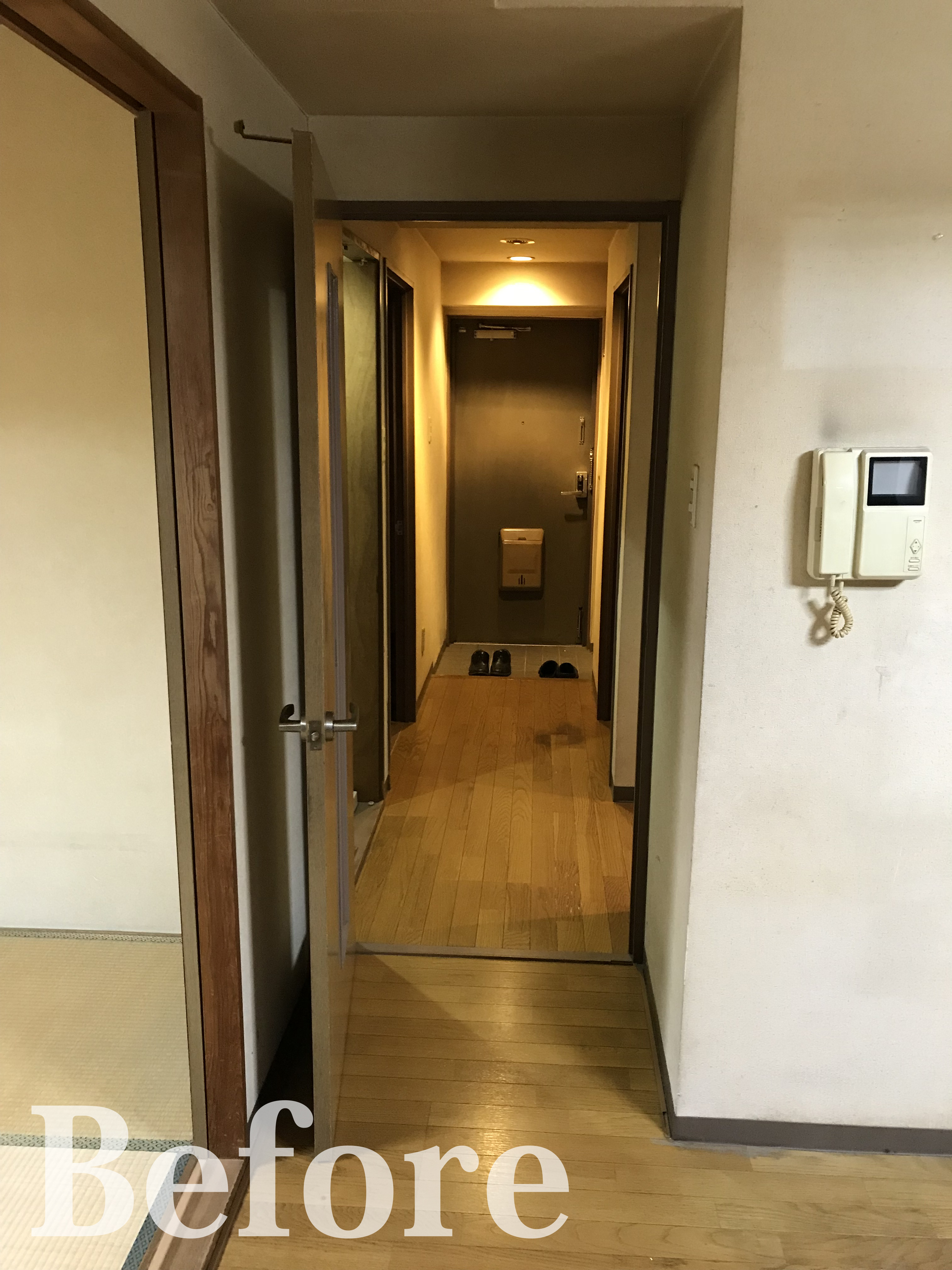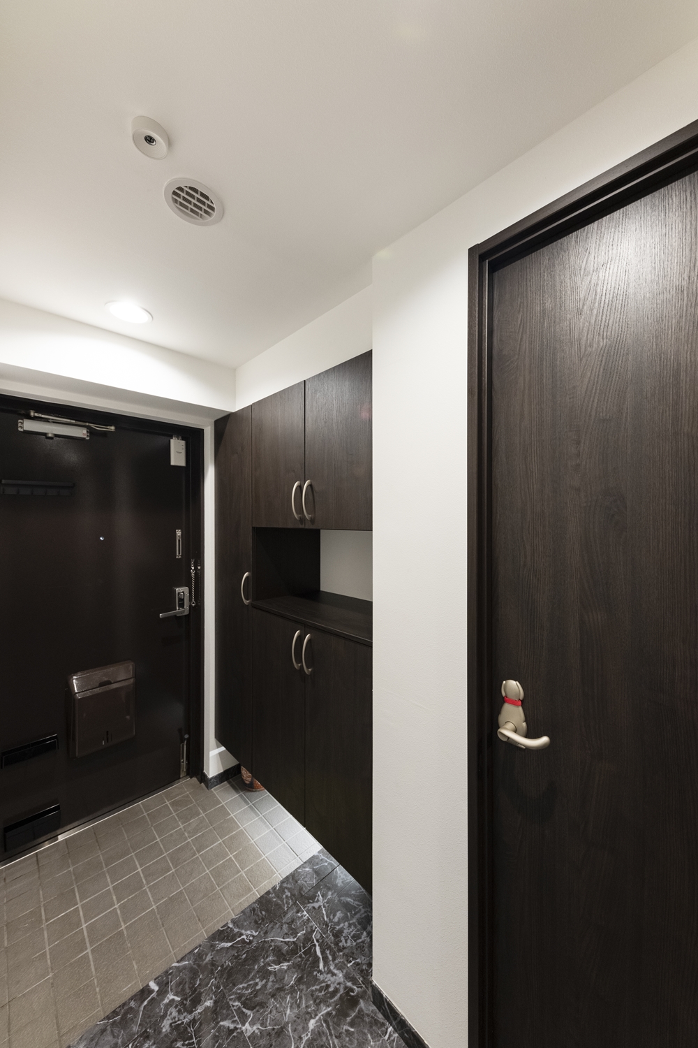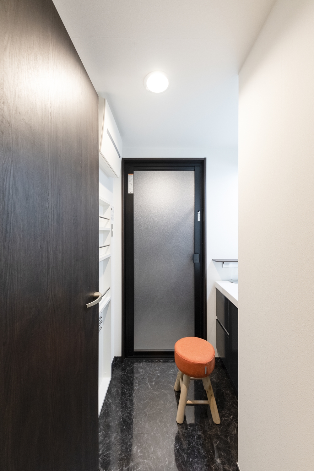 廊下~玄関/大理石調のフロアが印象的な、白と黒をベースにした高級感のある空間に大変身。
