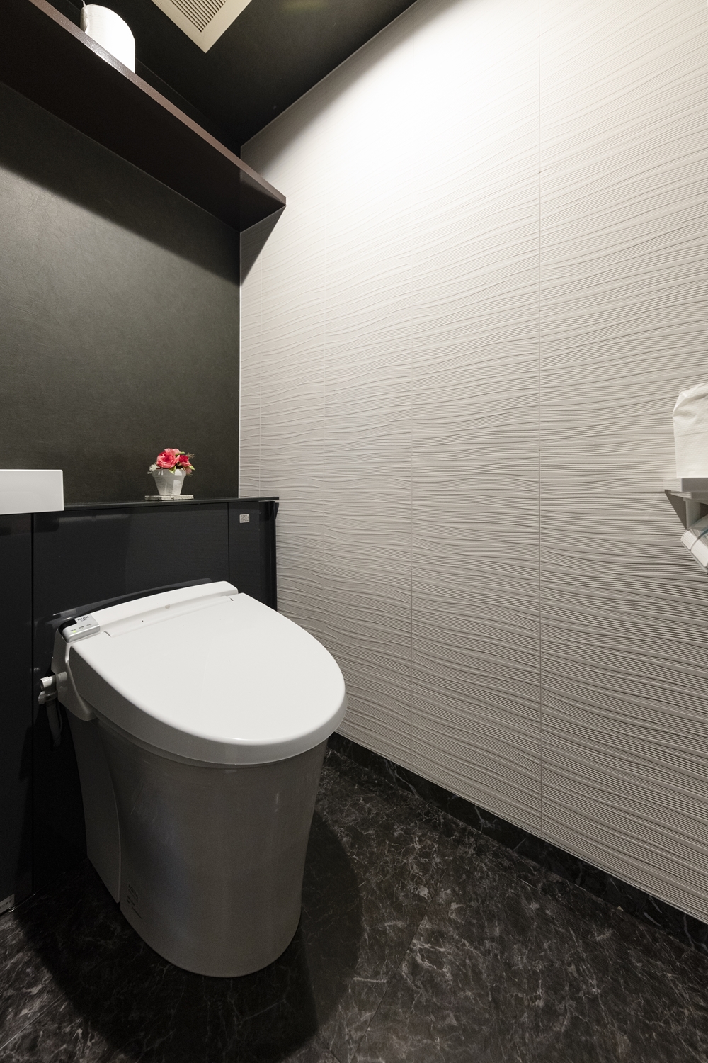 トイレ/白全面改修工事を行い、空気を美しく整えるインテリア壁材「エコカラット」を施しました。白と黒をベースにしたホテルライクな空間に仕上がりました。