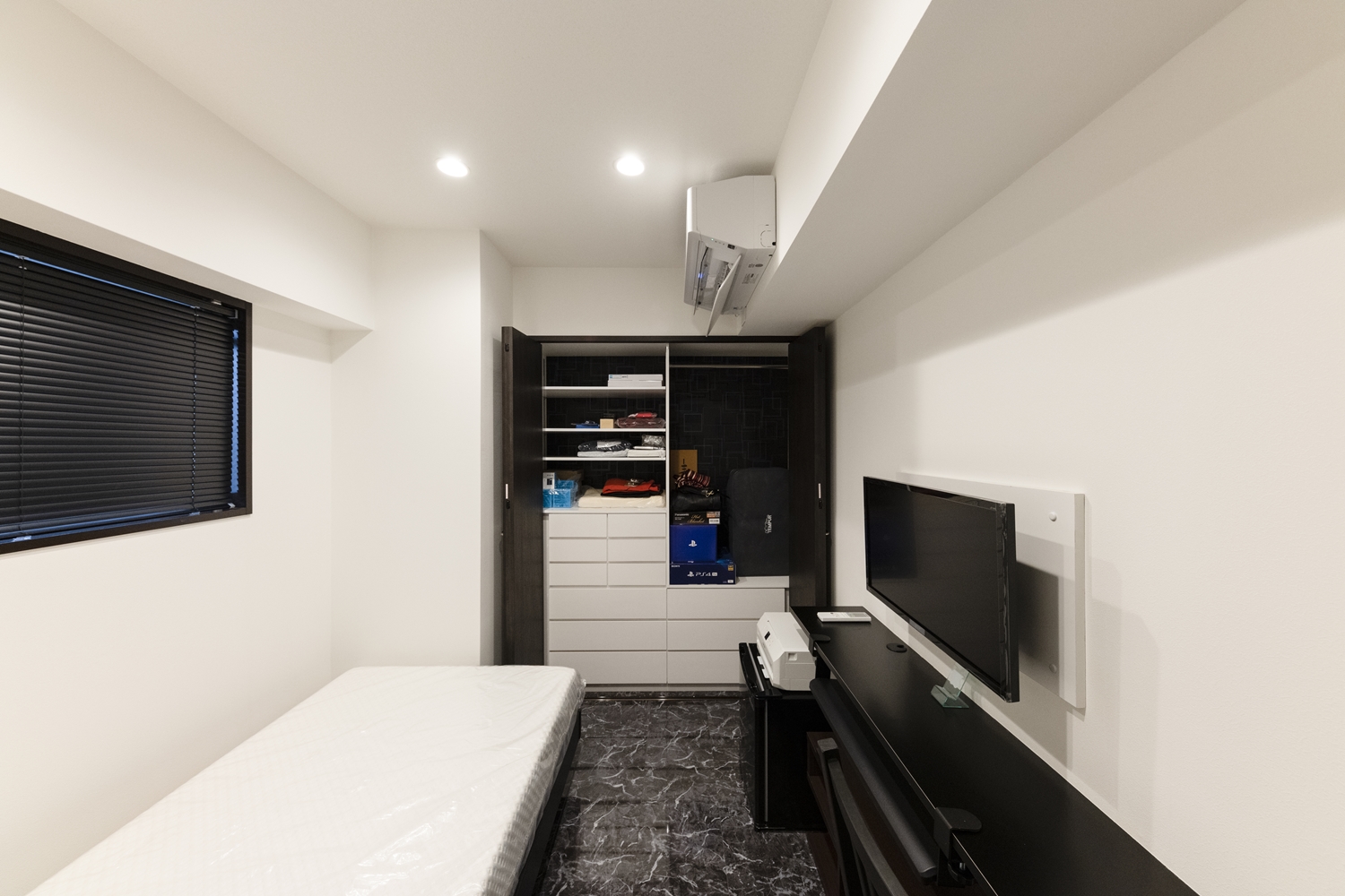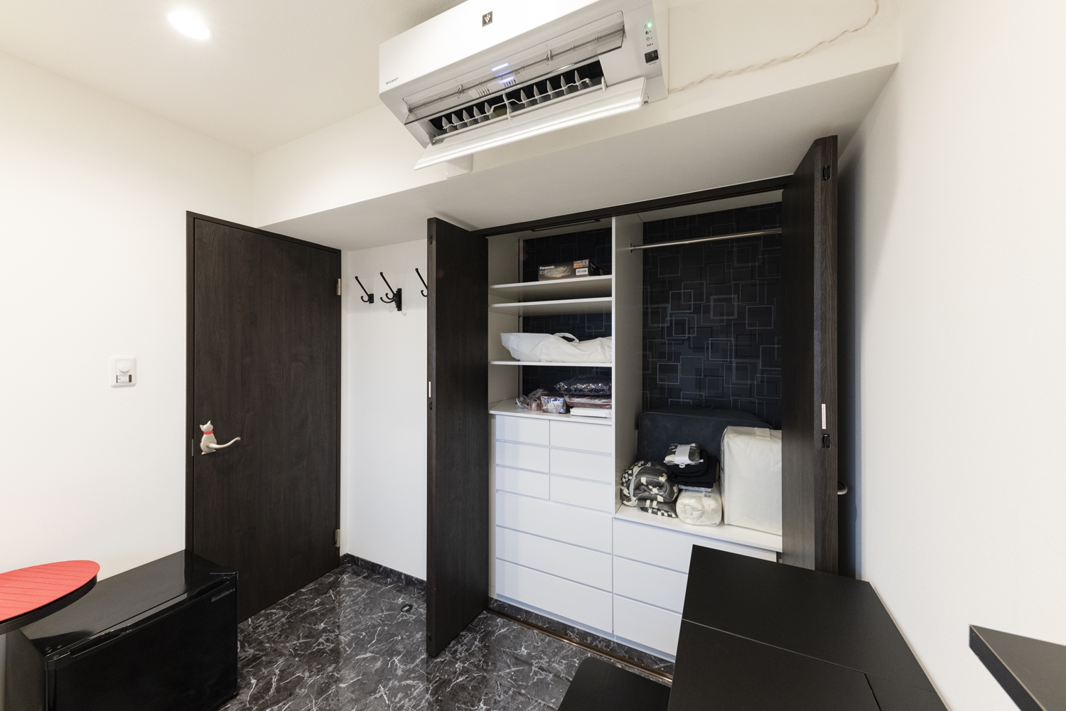 洋室/壁付けの黒いカウンターや、クロゼット内に白い収納を造作し、デザイン性も機能性にもこだわりました。