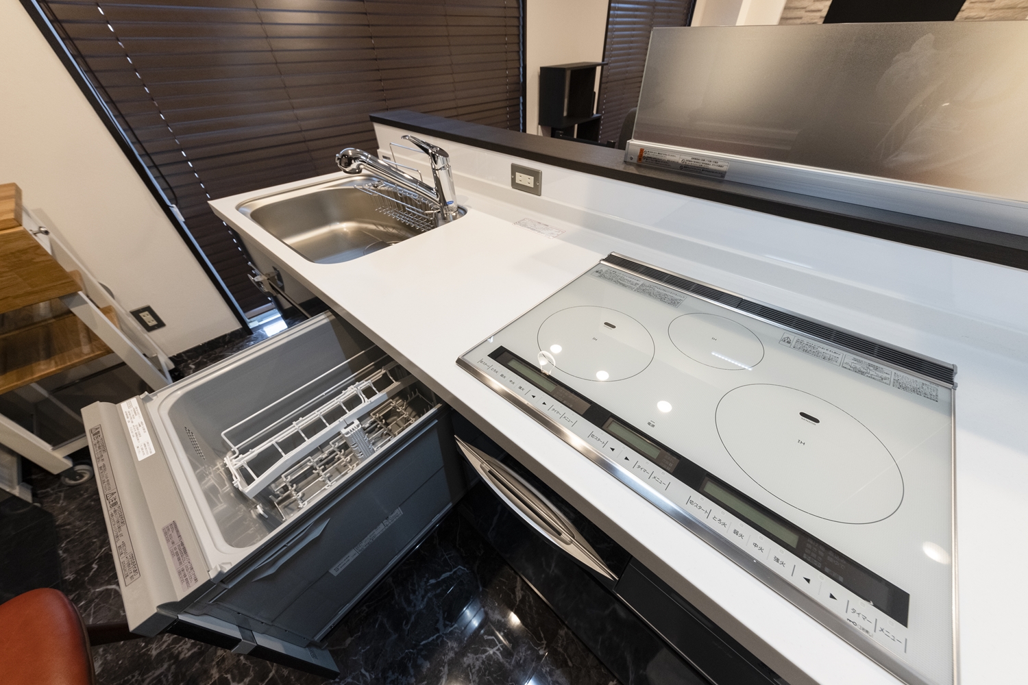 食器洗い乾燥機や、カップボード、吊戸棚を施した、見た目も使い勝手も優秀なキッチン。