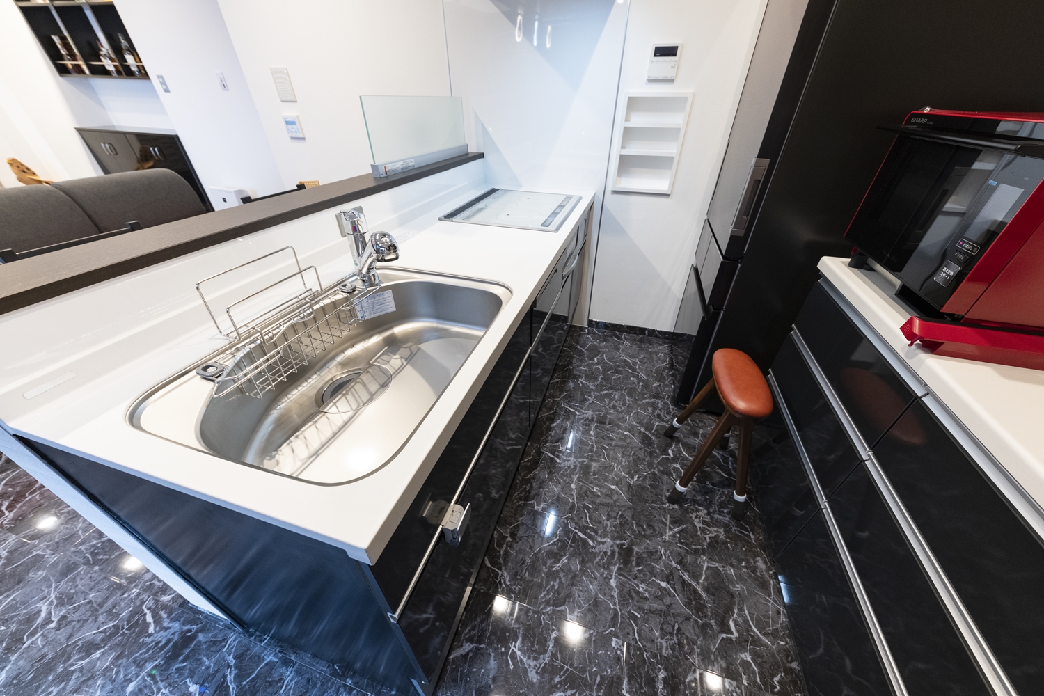 キッチン背面にはキッチンと同じデザインのカップボードや吊戸棚を施し機能美も充実させました♪