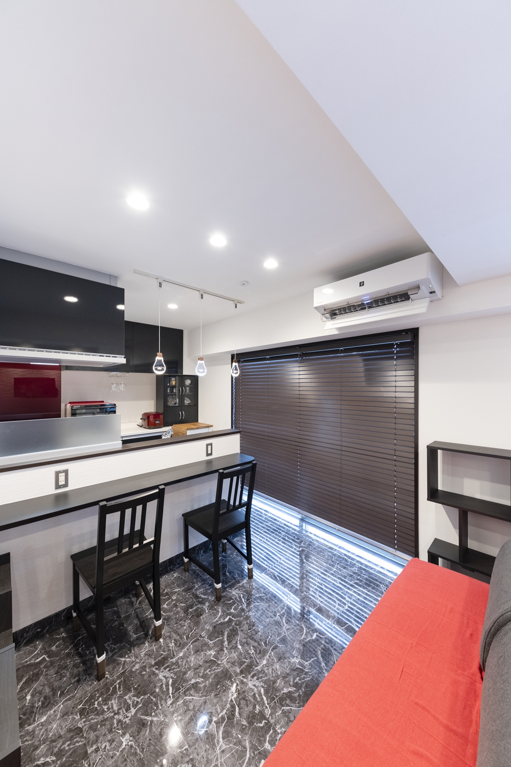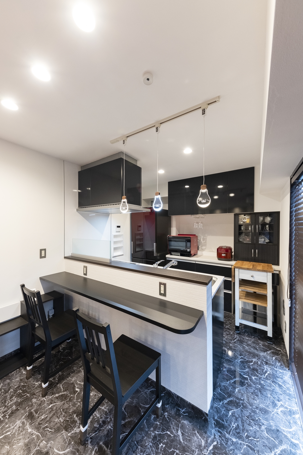 黒い大理石の風合いをリアルに再現した鏡面調仕上げの高級感ある床材を既存の床に上張りし、ダウンライトやおしゃれな照明を新規設置しました。