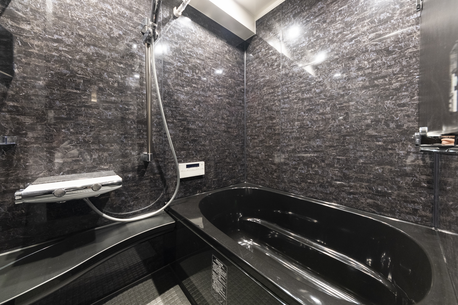 バスルーム/全面改修工事を行いました。ブラックのバスタブや天然石の豊かな表情をモチーフにしたデザインの壁が、上質な空間を演出。